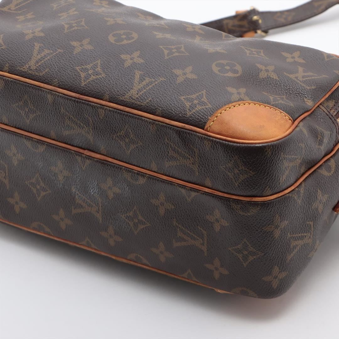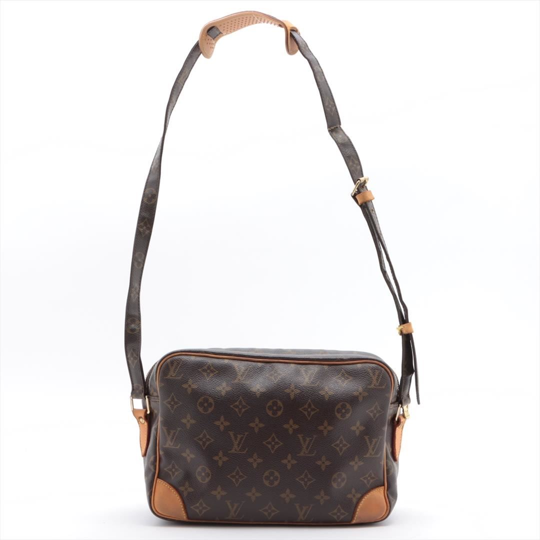 One Louis Vuitton Brown Monogram Canvas Leather Nil Crossbody Bag. Item is sold AS-IS. All available information is listed in the description and shown in the photo. Brown and tan Monogram coated canvas Louis Vuitton Nil crossbody bag with gold-tone hardware, single adjustable shoulder strap, tan leather trim embellishment & single exterior pocket, brown Taiga leather lining & single interior pocket and zip closure at top. Height: 8" Width: 11" Depth: 4" Shoulder Strap Drop: 18"
