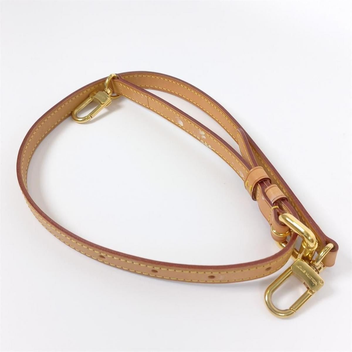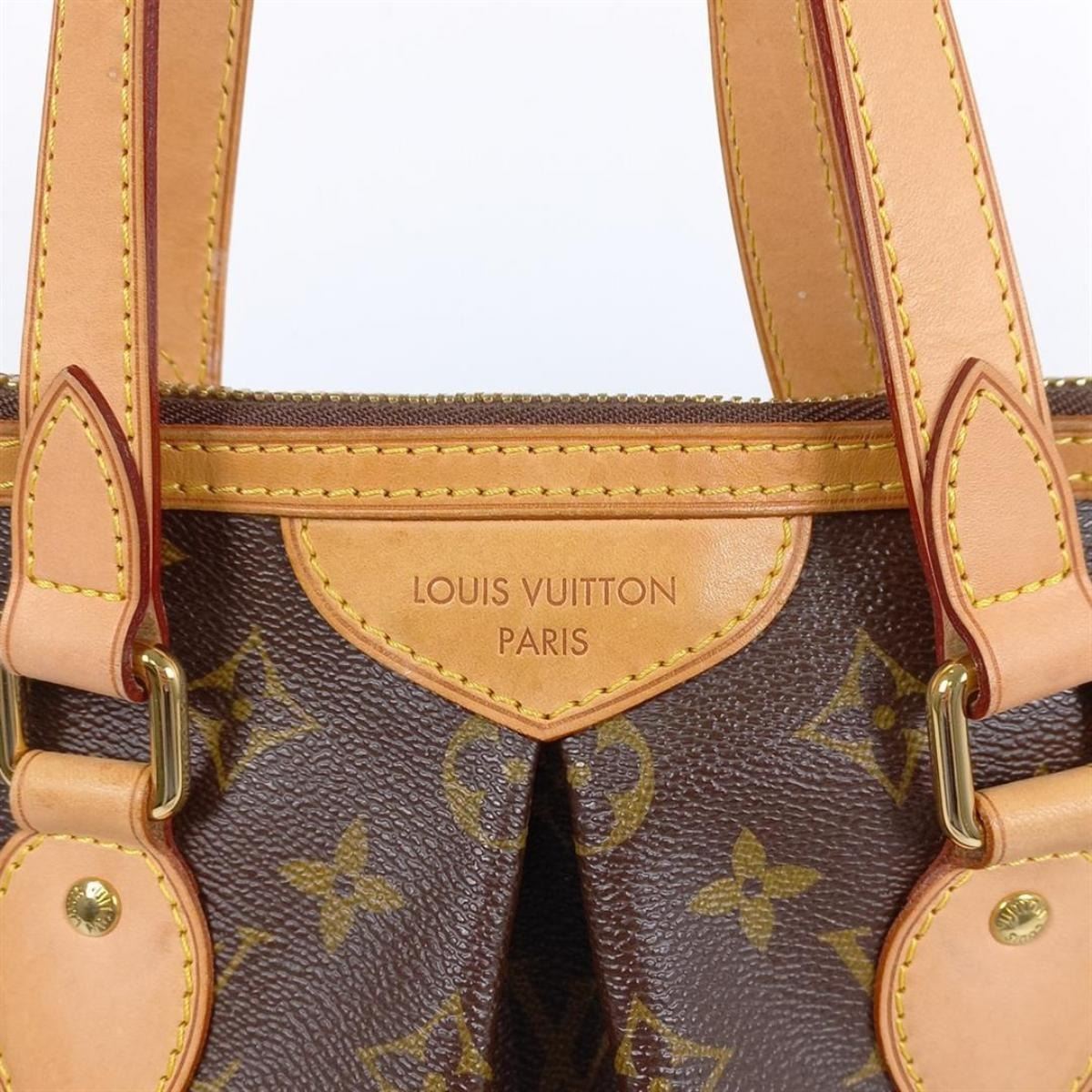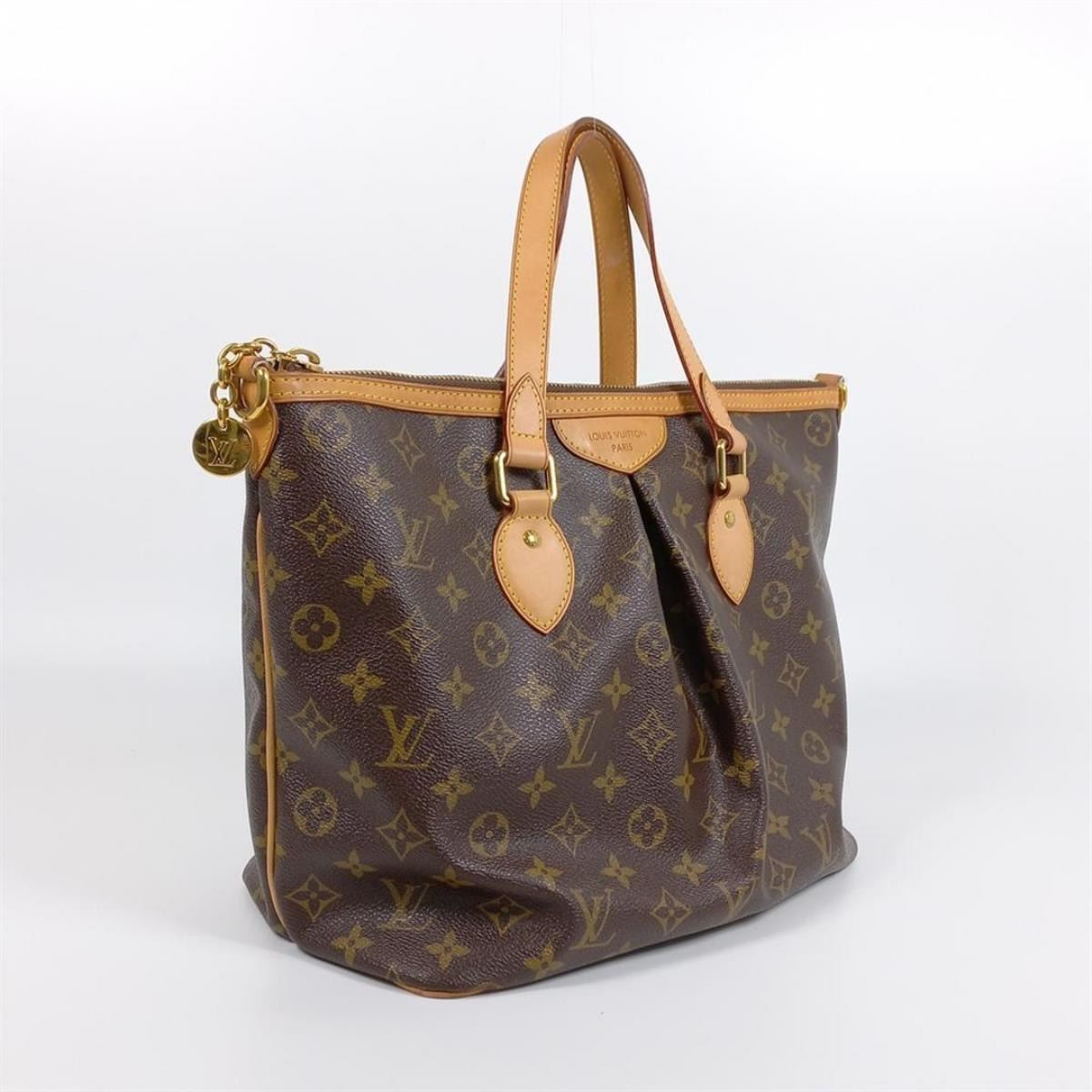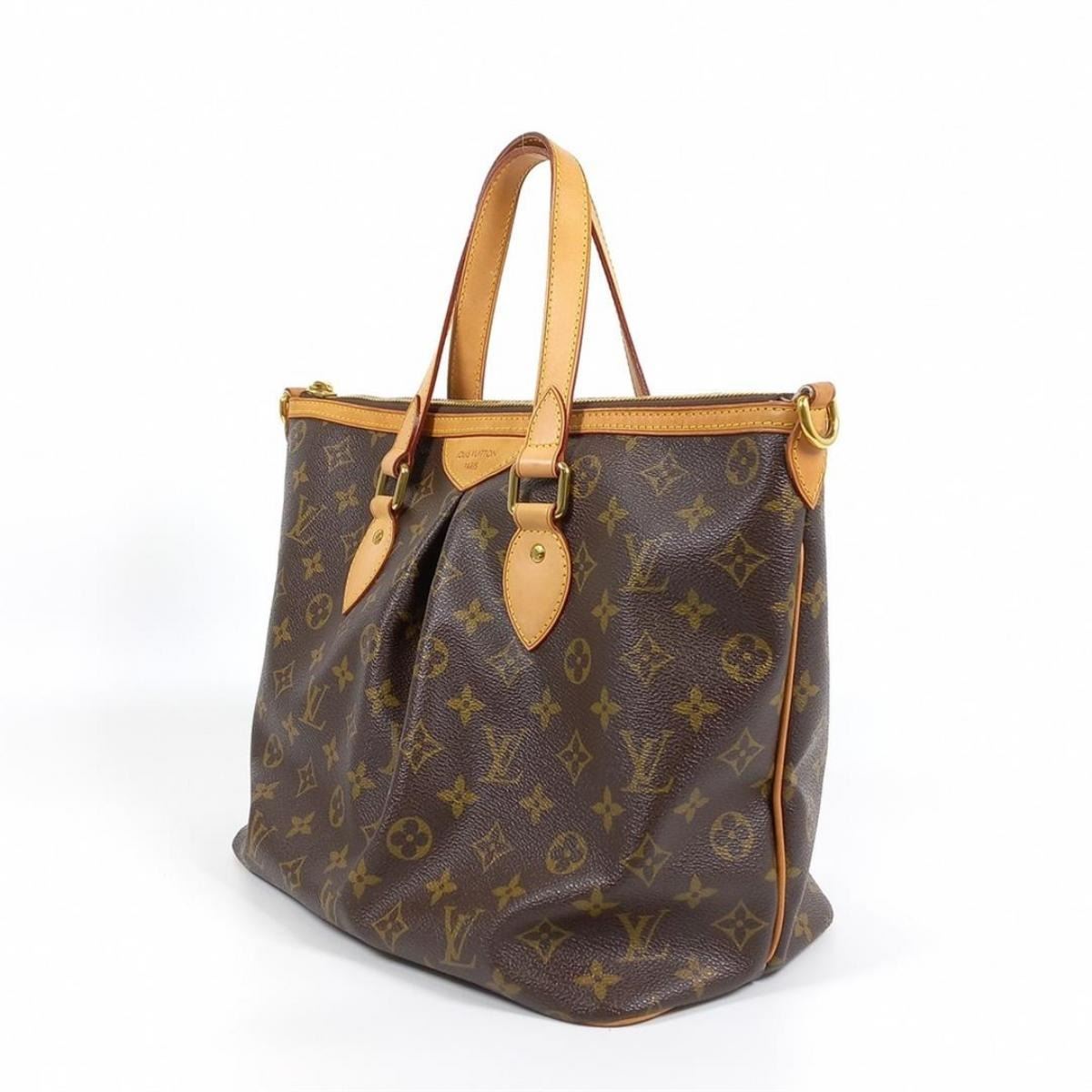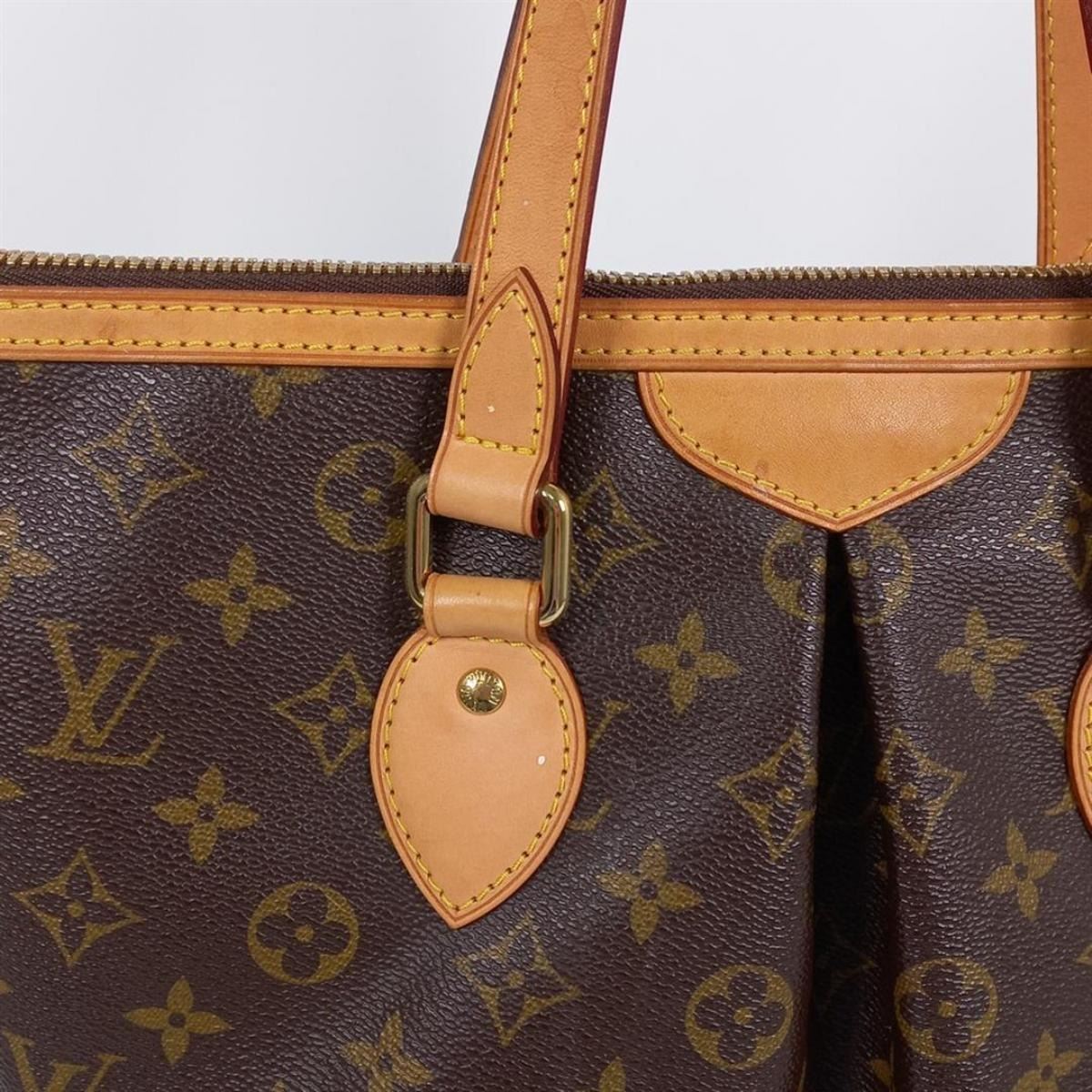 Brown and tan monogram coated canvas Louis Vuitton Palermo PM bag with gold-tone hardware, tan vachetta leather trim, dual flat adjustable top handles, and pleated detail at exterior, brown woven lining, three interior slit pockets and zip closure at top,