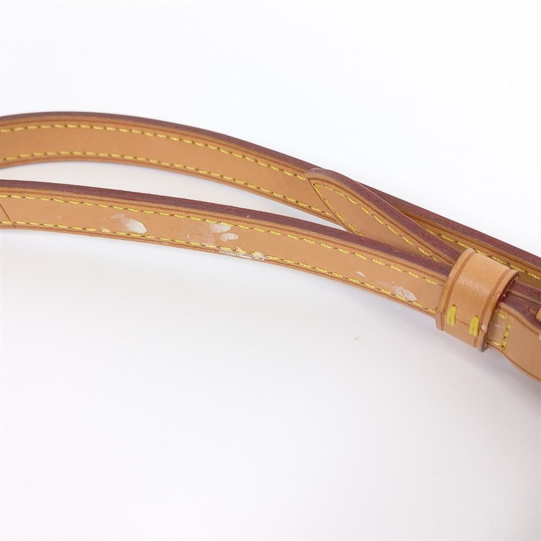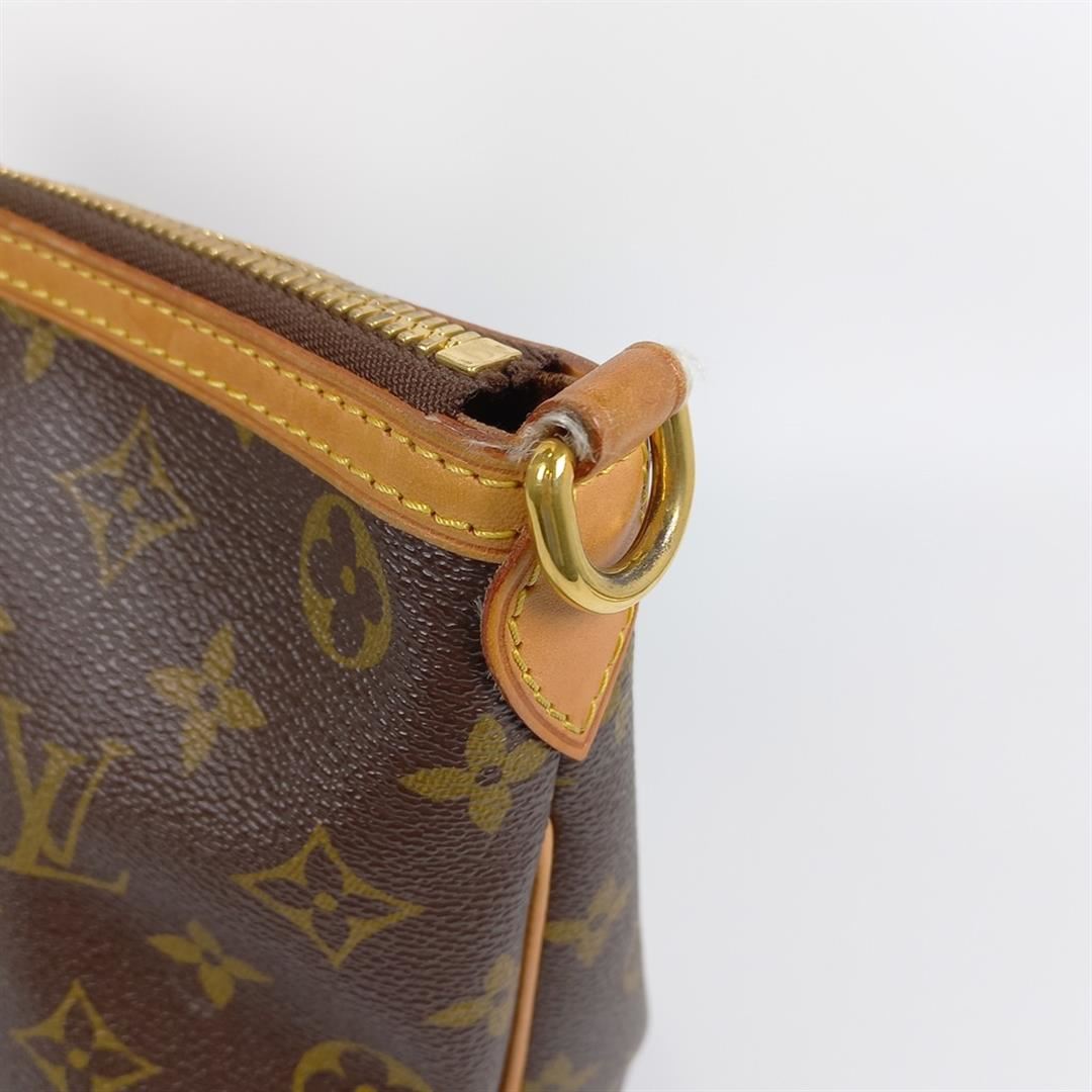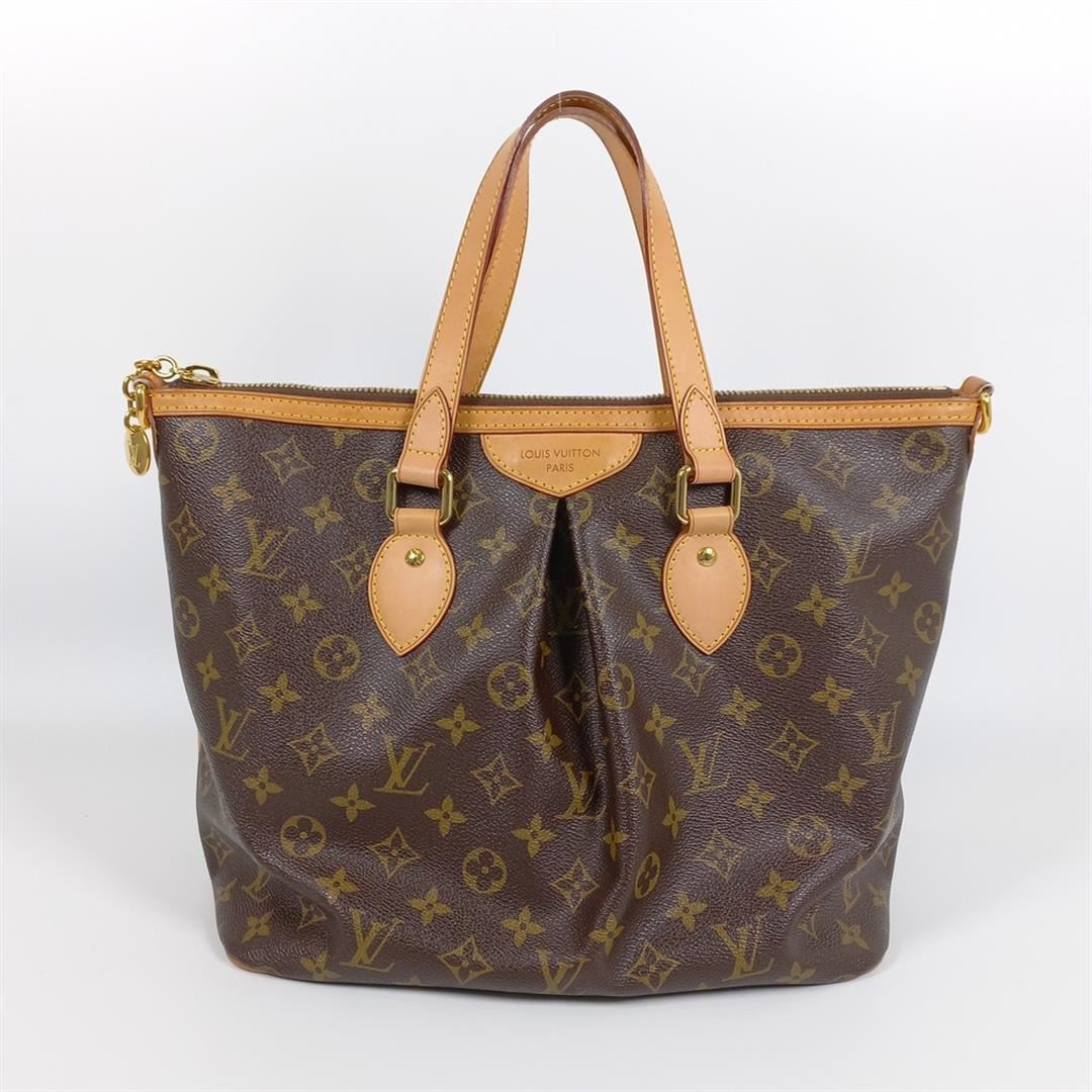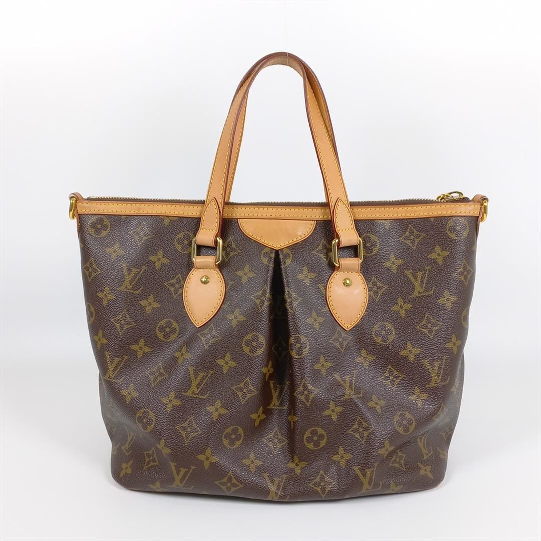 Brown and tan monogram coated canvas Louis Vuitton Palermo PM bag with gold-tone hardware, tan vachetta leather trim, dual flat adjustable top handles, and pleated detail at exterior, brown woven lining, three interior slit pockets and zip closure at top,