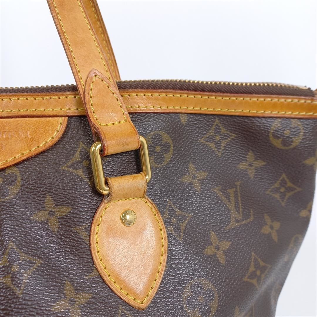 Brown and tan monogram coated canvas Louis Vuitton Palermo PM bag with gold-tone hardware, tan vachetta leather trim, dual flat adjustable top handles, and pleated detail at exterior, brown woven lining, three interior slit pockets and zip closure at top,