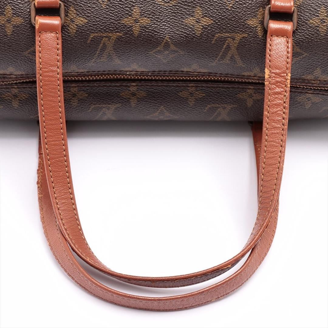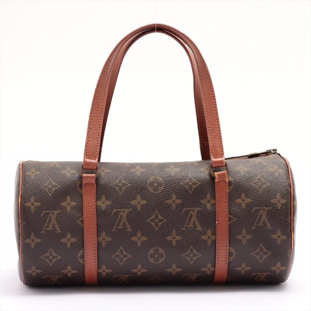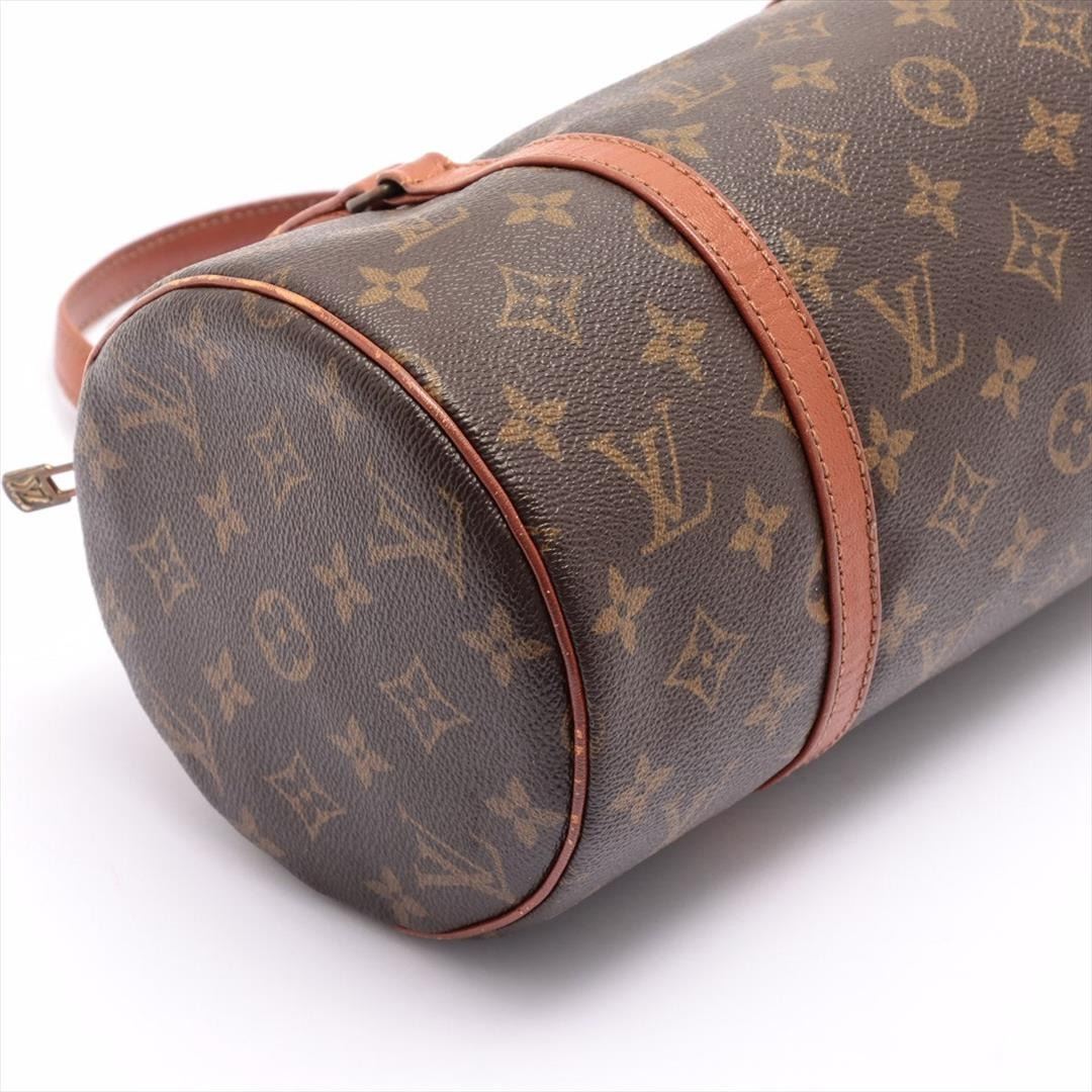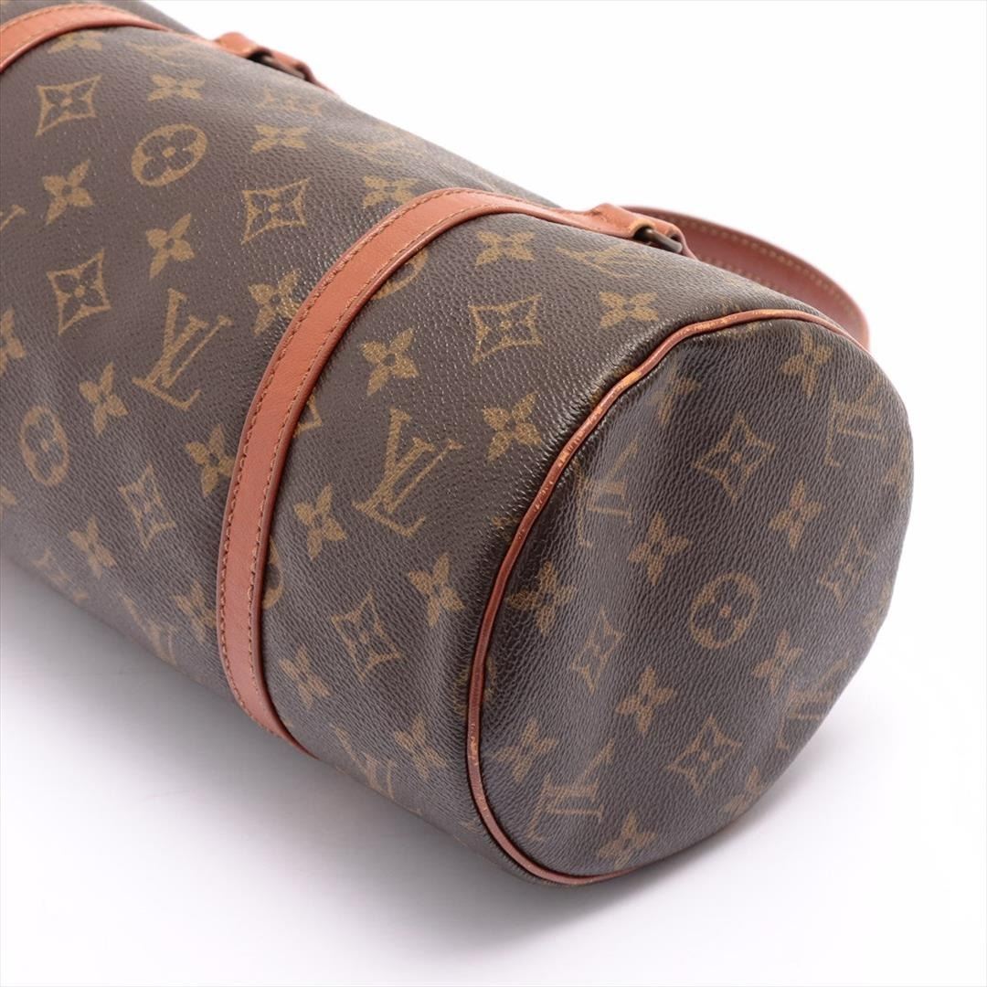 Brown and tan monogram coated canvas Louis Vuitton Papillon 30 cm with gold-tone hardware, tan vachetta leather trim, dual flat handles, brown Taiga leather interior and zip closure at top. 12"x6"x6"xBag Drop:6"/30cmx15.2cmx15.2cmxBag Drop:15.2cm