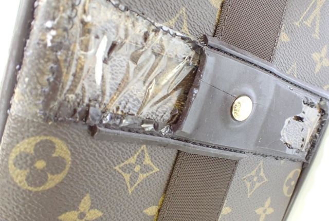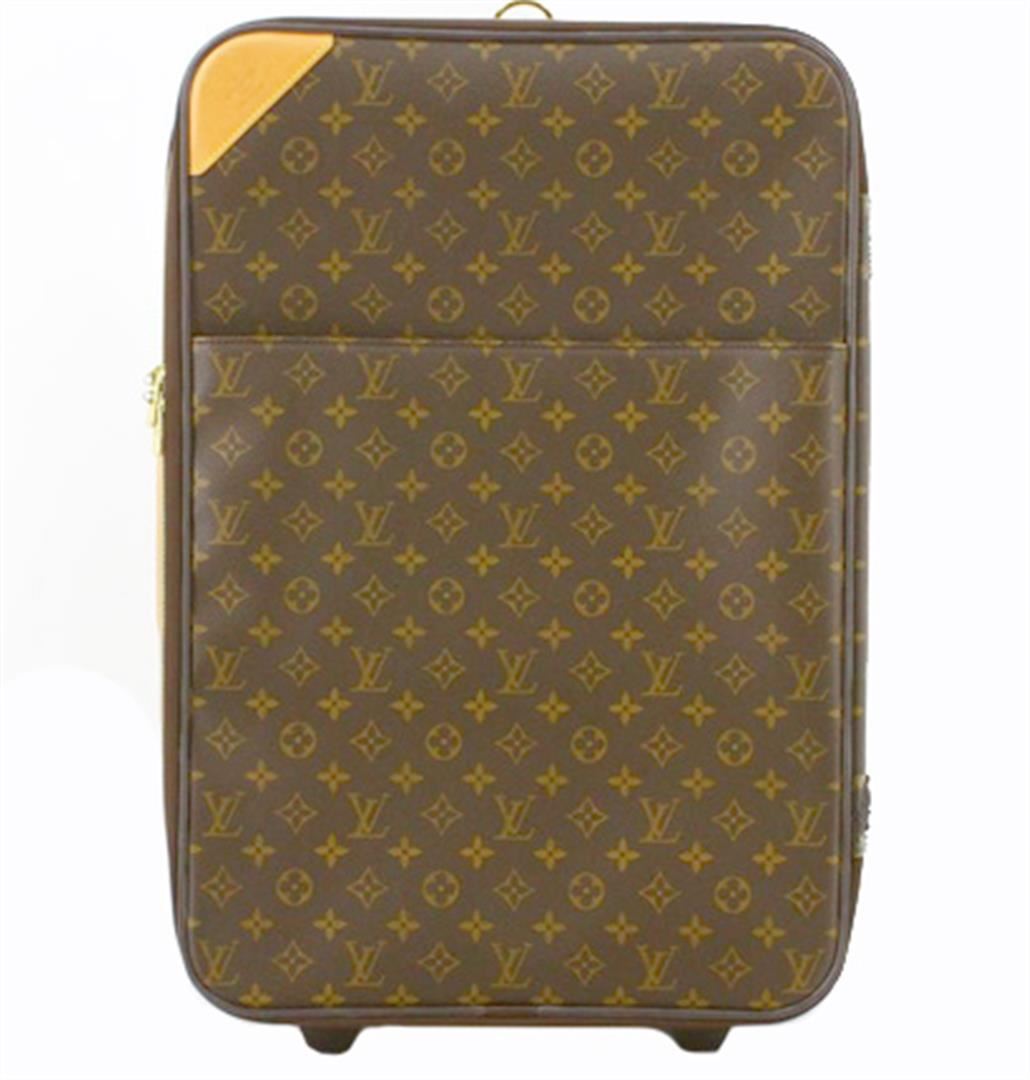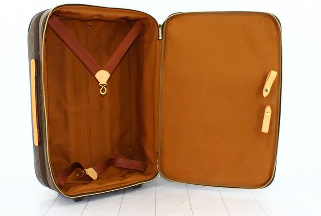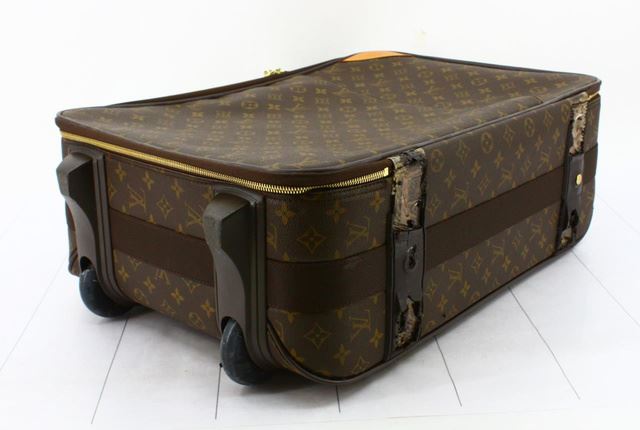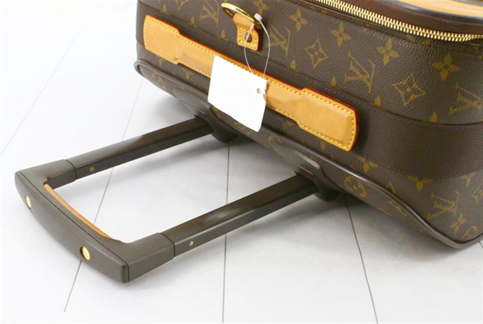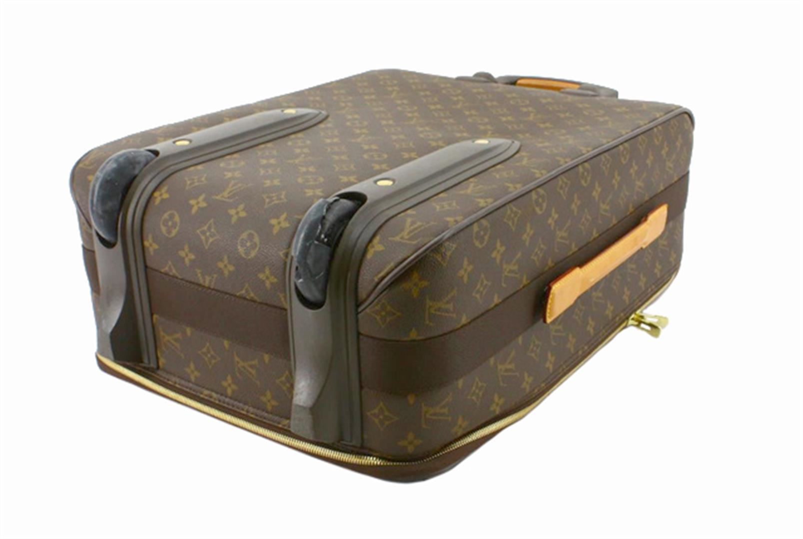Brown and tan Monogram coated canvas leather of Louis Vuitton Pegase 55cm rolling luggage with gold-tone hardware, tan vachetta leather trim, exterior slip pockets, interior slip pockets, brown nylon lining, top extendable handle, and zip closure. 15"