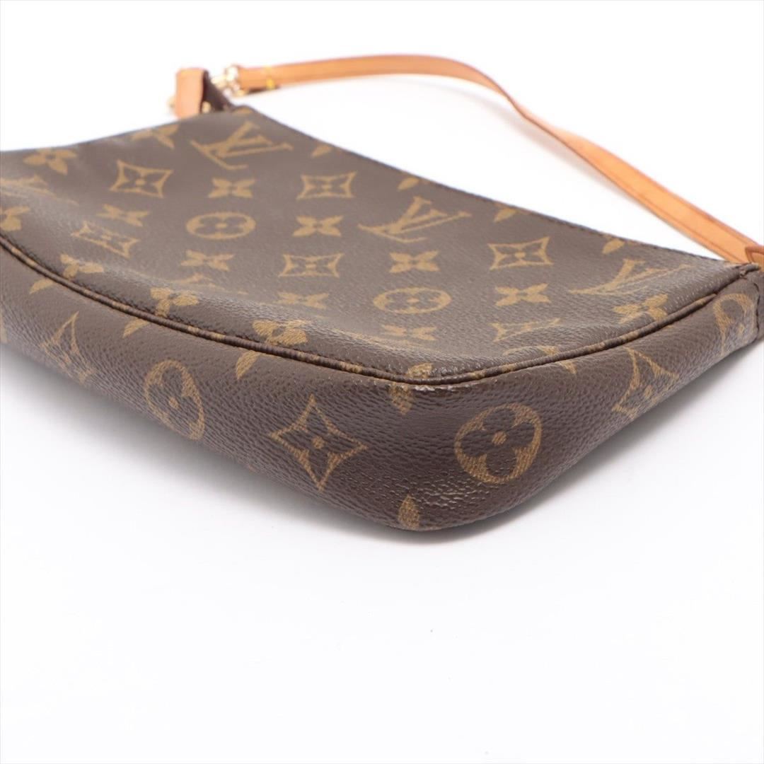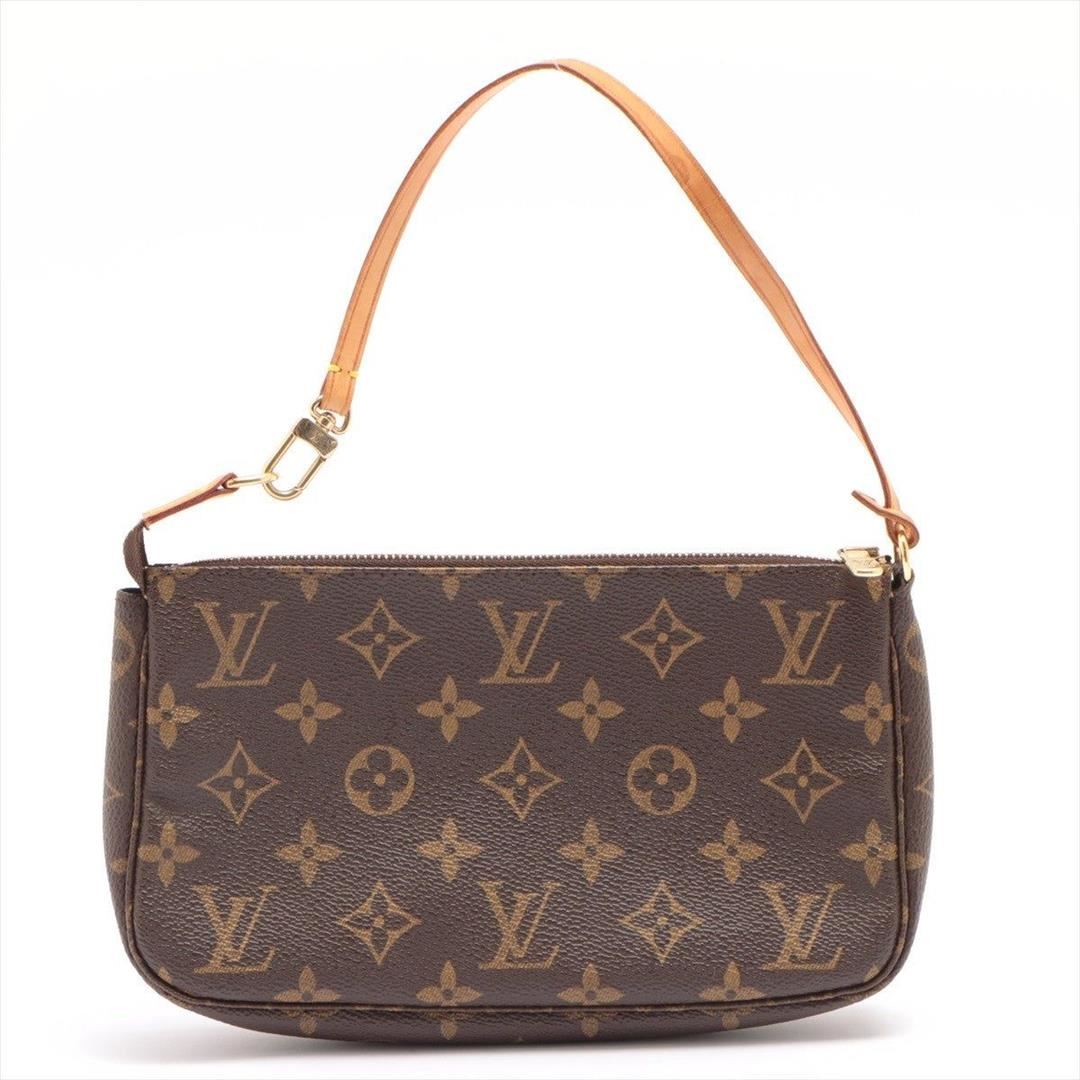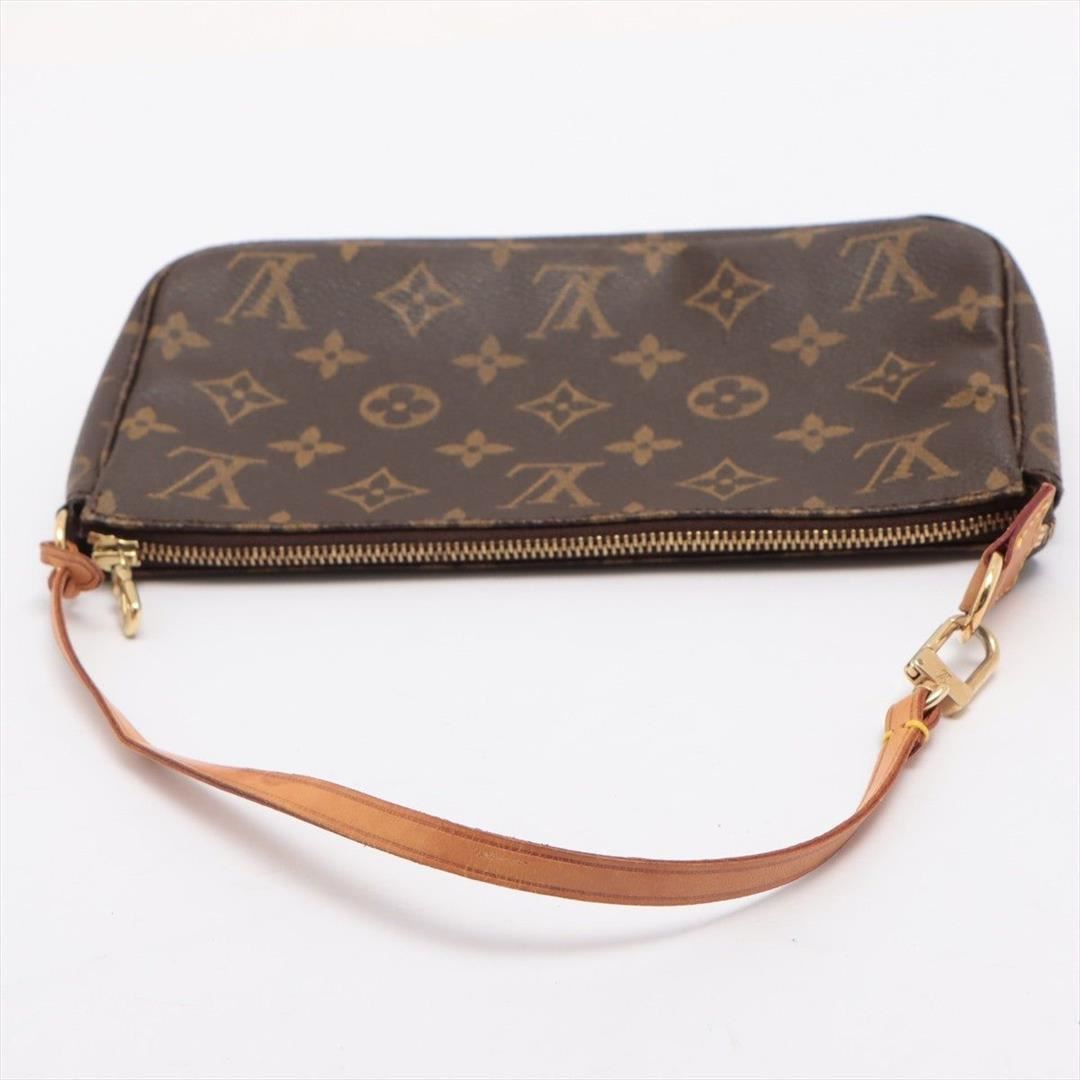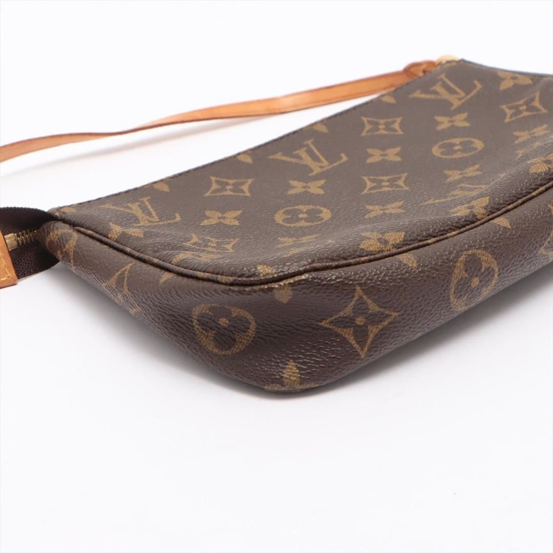 Brown and tan Monogram coated canvas Louis Vuitton Pochette Accessoires shoulder bag with gold-tone hardware, tan Vachetta leather trim, a tan leather shoulder strap, brown canvas lining and zip closure at top.