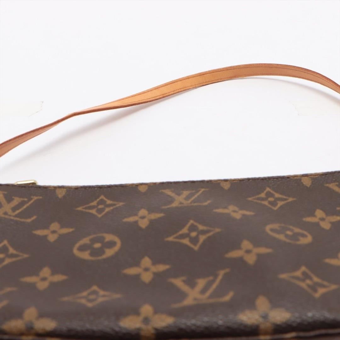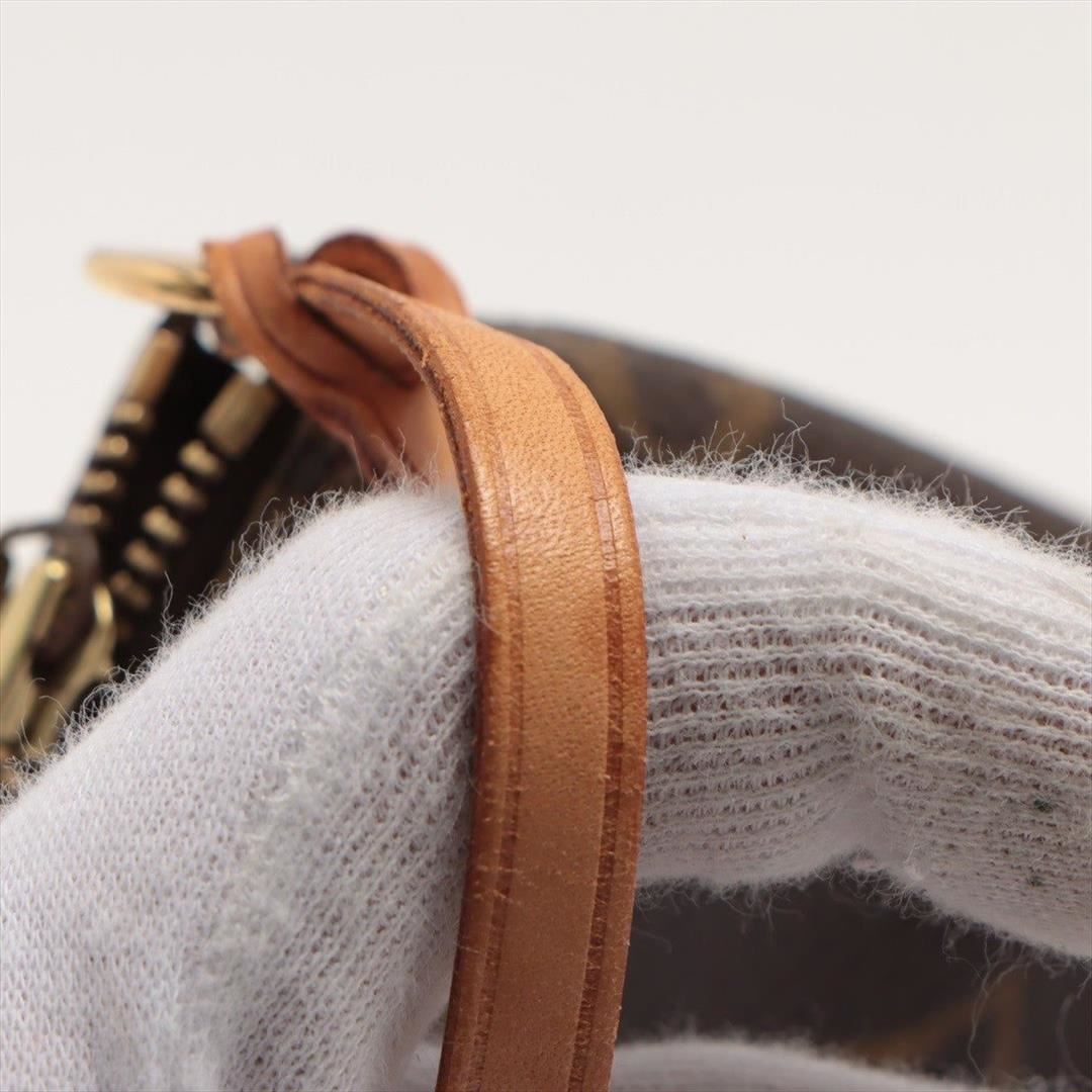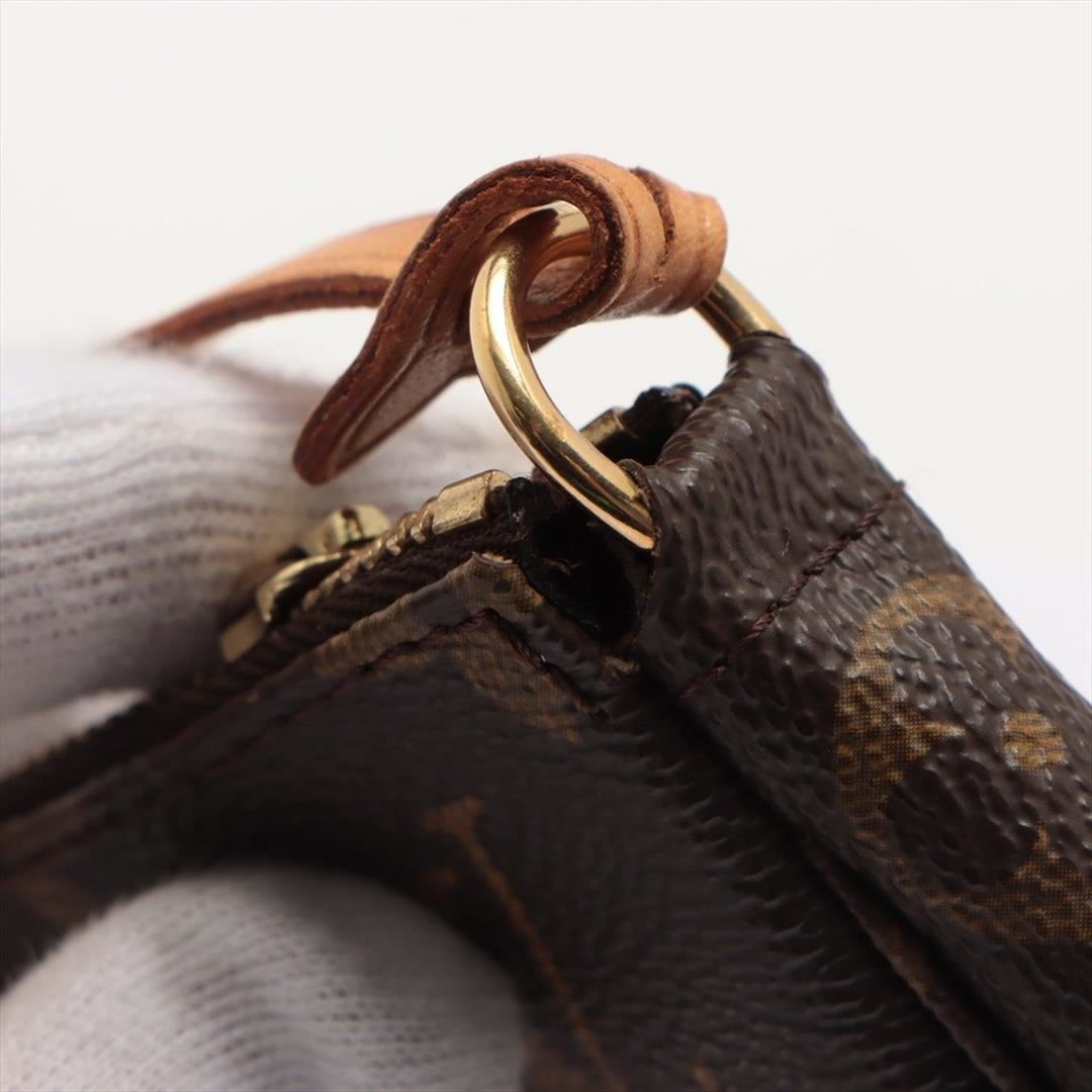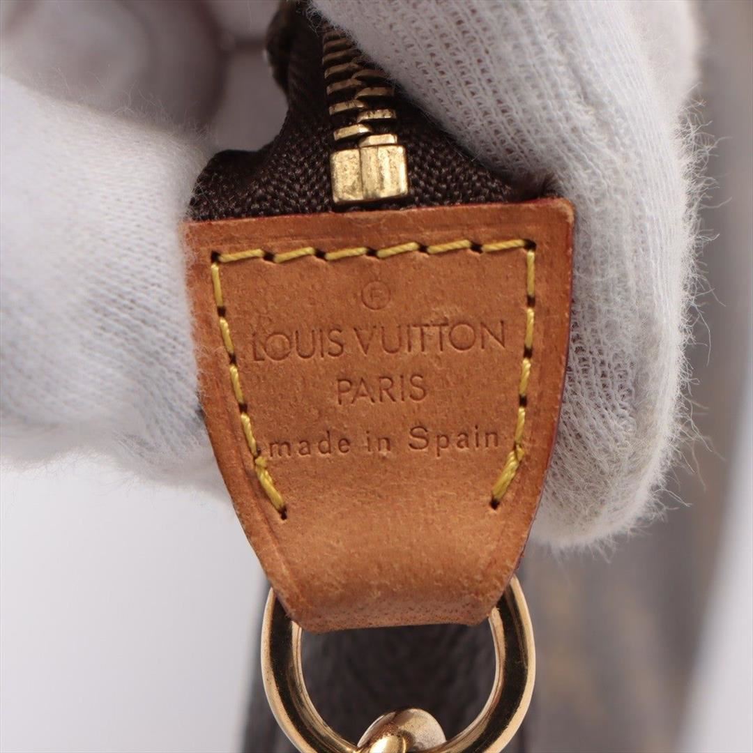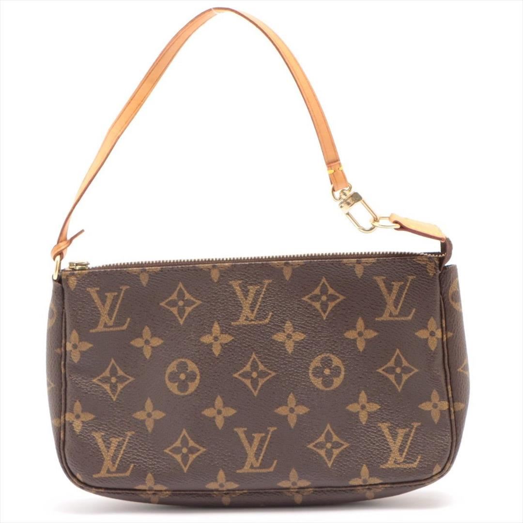 Brown and tan Monogram coated canvas Louis Vuitton Pochette Accessoires shoulder bag with gold-tone hardware, tan Vachetta leather trim, a tan leather shoulder strap, brown canvas lining and zip closure at top.