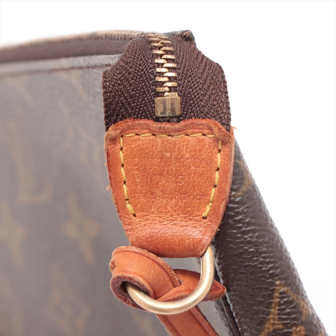 Brown and tan Monogram coated canvas Louis Vuitton Pochette Accessories shoulder bag with gold-tone hardware, tan Vachetta leather trim, a tan leather shoulder strap, brown canvas lining and zip closure at top. 8.5"x 5"x 1.5"xStrap Drop:6"/21.6cmx12.7cmx