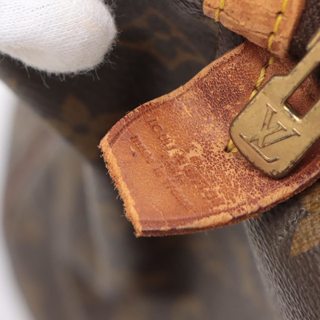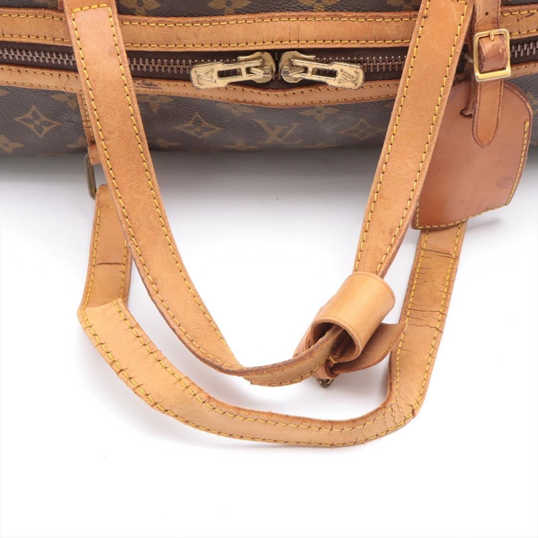 Brown and tan monogram coated canvas Louis Vuitton Sac Souple with gold-tone hardware, tan vachetta leather accents, dual flat shoulder straps, brown canvas interior and two-way zip closure at top. Height 12" Width: 21.5" Depth: 9.5" Handle Drop: 6"
