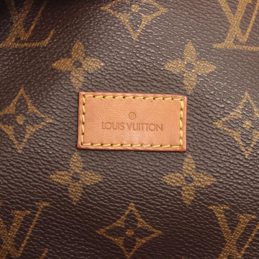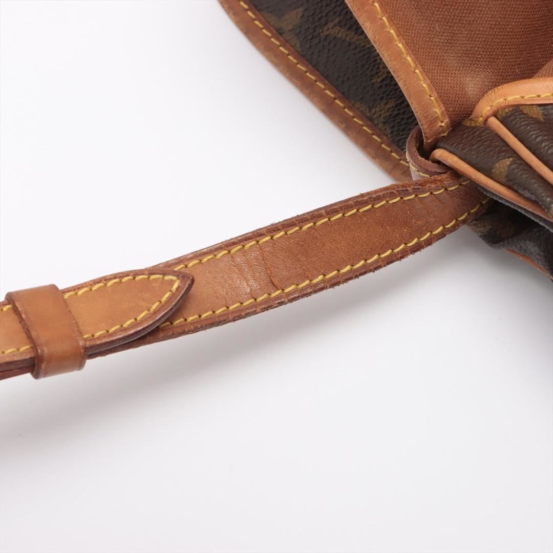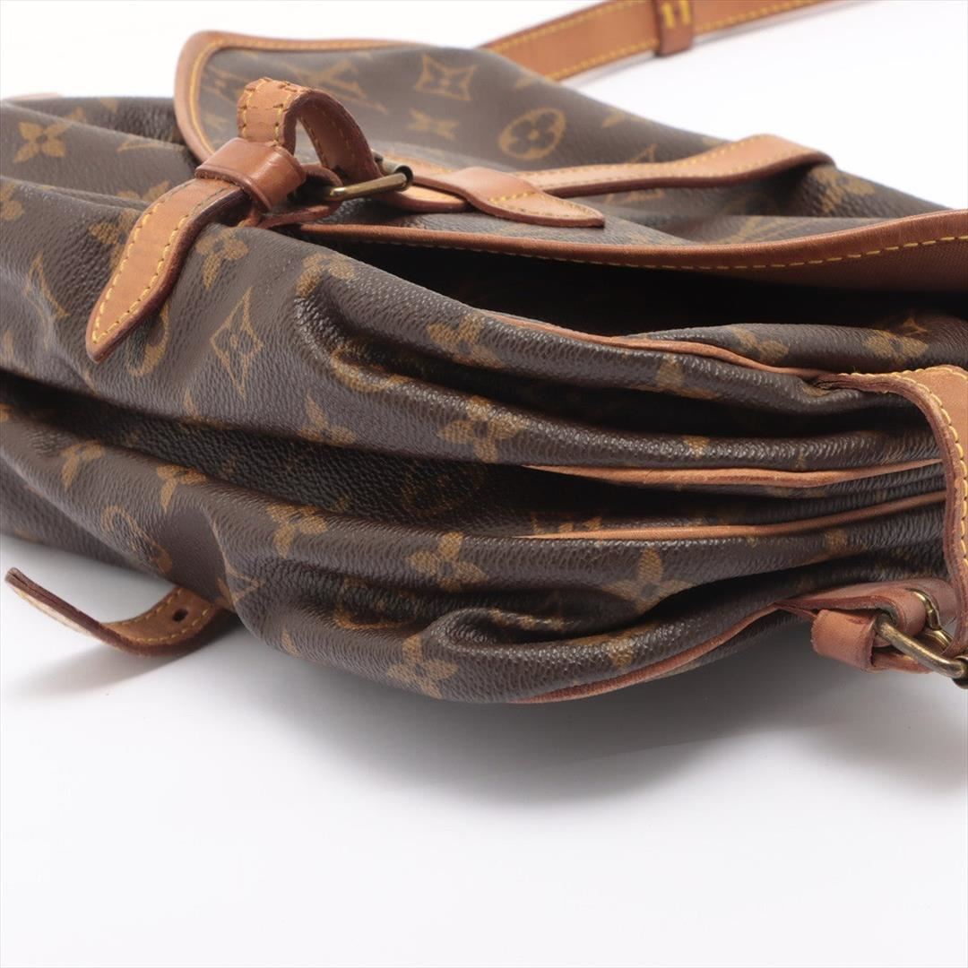 Brown and tan monogram coated canvas Louis Vuitton Saumur 30 with gold-tone hardware, tan vachetta leather trim, adjustable flat shoulder strap, dual compartments, brown canvas interior lining, single slit pocket at interior wall and dual buckle closures at front flap. 13"x9"x11"xBag Drop:21"/30cmx22.8cmx27.9cmxBag Drop:53.3cm