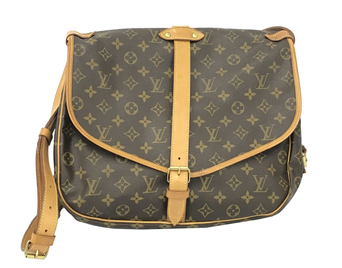 One Louis Vuitton Brown Monogram Canvas Leather Saumur 35 cm Crossbody Bag. Item is sold AS-IS. All available information is listed in the description and shown in the photo. Brown and tan monogram coated canvas Louis Vuitton Saumur 35 with gold-tone hardware, tan vachetta leather trim, single adjustable flat shoulder strap, brown canvas lining, dual compartments, three pockets at interior walls and dual buckle closures at exterior flap. 13.5"x8"x10.5"xBag Drop:25"/35cmx20.3cmx26.7cmxBag Drop:63.5cm
