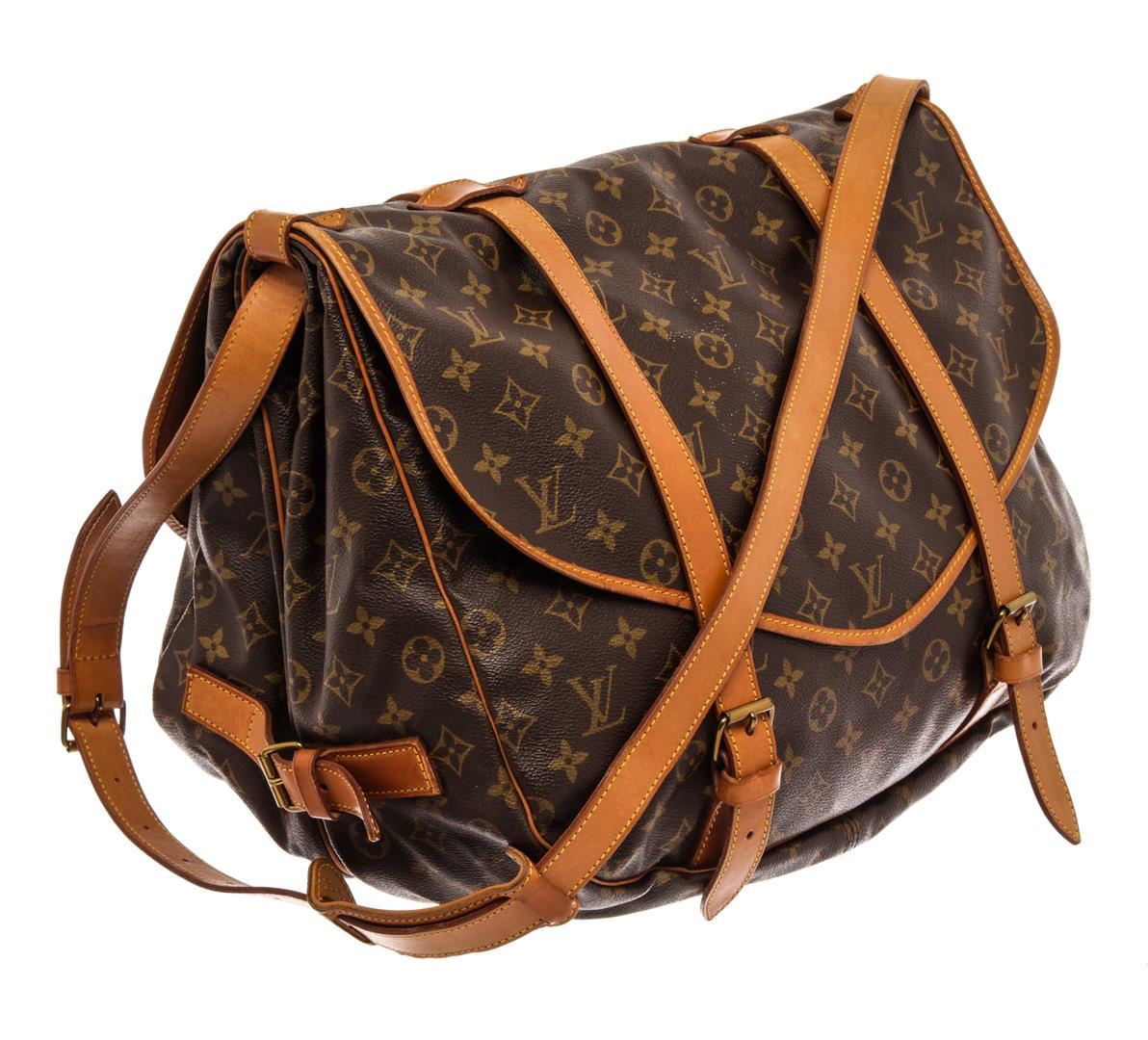 Louis Vuitton Brown Monogram Canvas Leather Saumur 43 Messenger Bag. All available information is listed in the description and shown in the photos. Louis Vuitton Brown Monogram Canvas Leather Saumur 43 Messenger Bag with brown coated canvas, brass hardware, single adjustable shoulder strap, leather trim embellishment, canvas lining & three interior pockets, buckle closure at front. Height: 13.75" Width: 17" Depth: 8.25", Shoulder Strap Drop Max: 16.5-19.5" / 34.92 x 43.18 x 20.95 Cm