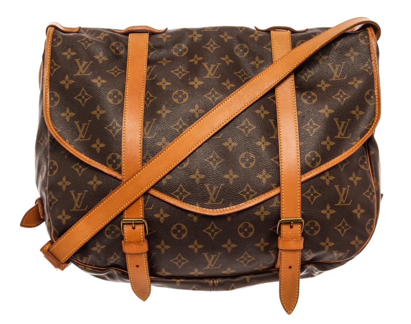 Louis Vuitton Brown Monogram Canvas Leather Saumur 43 Messenger Bag. All available information is listed in the description and shown in the photos. Louis Vuitton Brown Monogram Canvas Leather Saumur 43 Messenger Bag with brown coated canvas, brass hardware, single adjustable shoulder strap, leather trim embellishment, canvas lining & three interior pockets, buckle closure at front. Height: 13.75" Width: 17" Depth: 8.25", Shoulder Strap Drop Max: 16.5-19.5" / 34.92 x 43.18 x 20.95 Cm