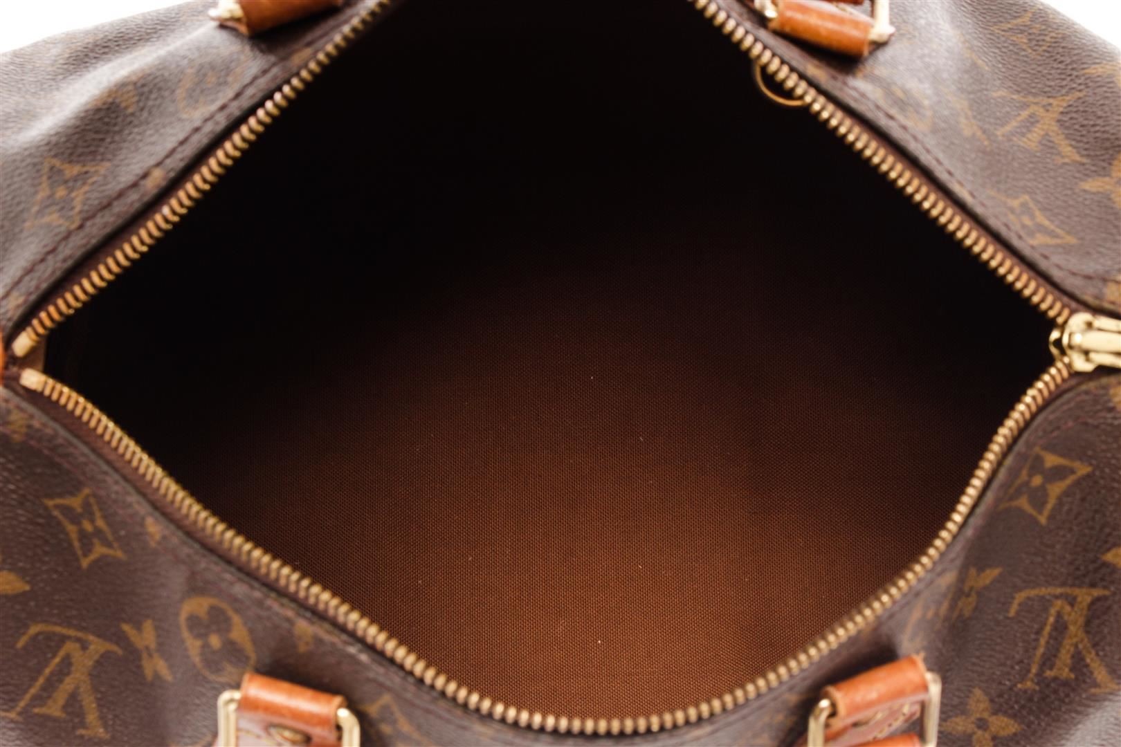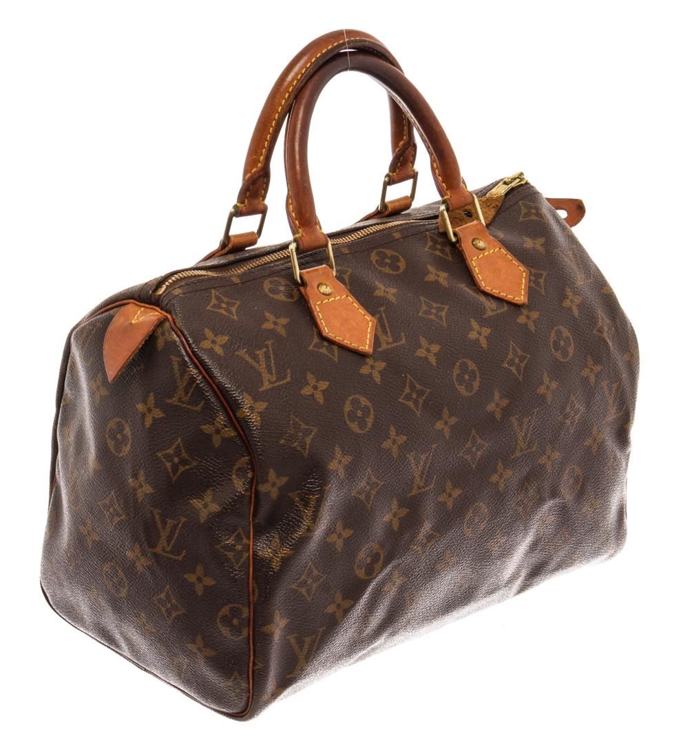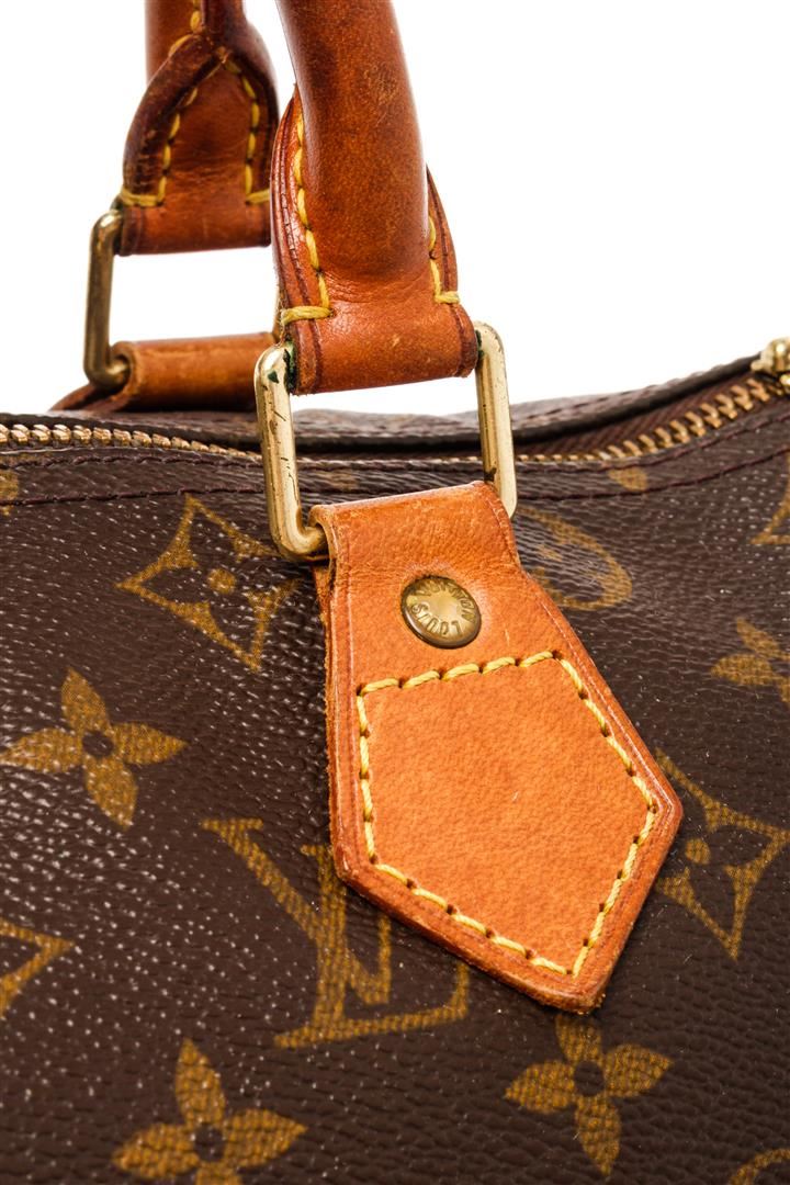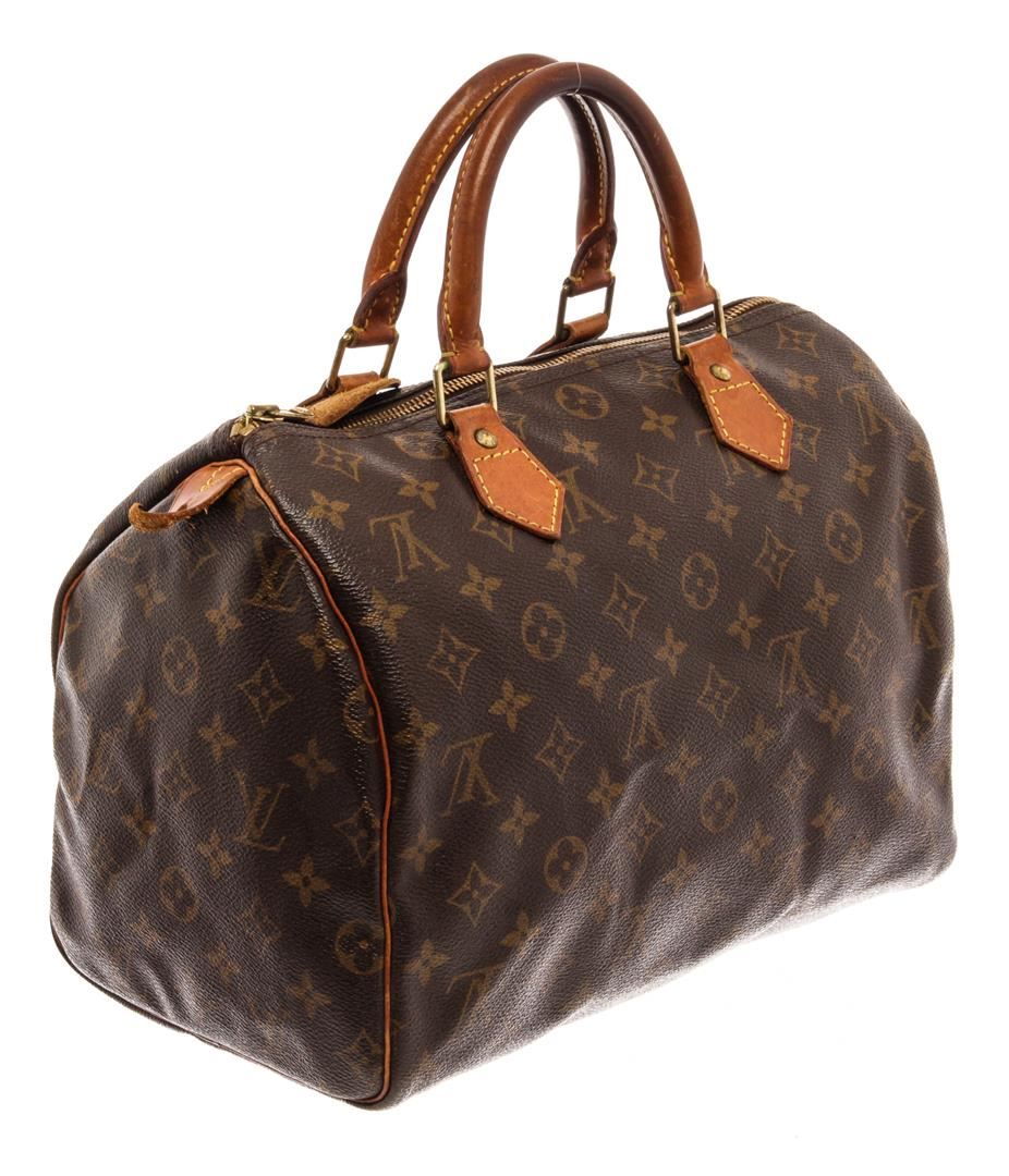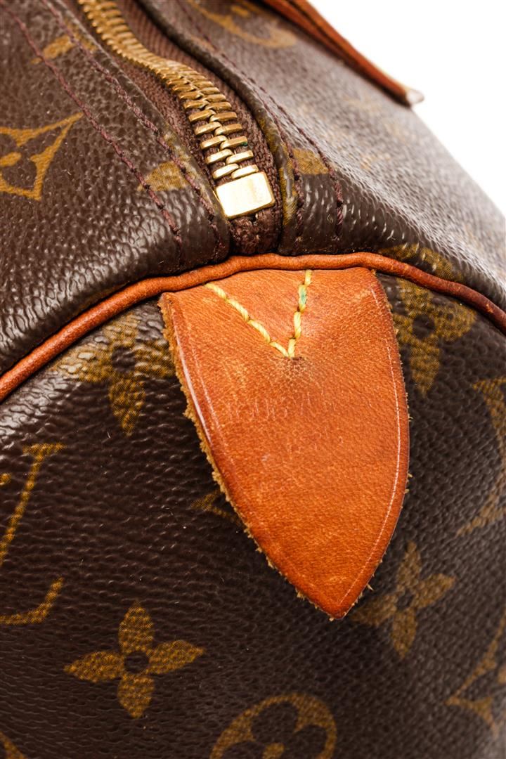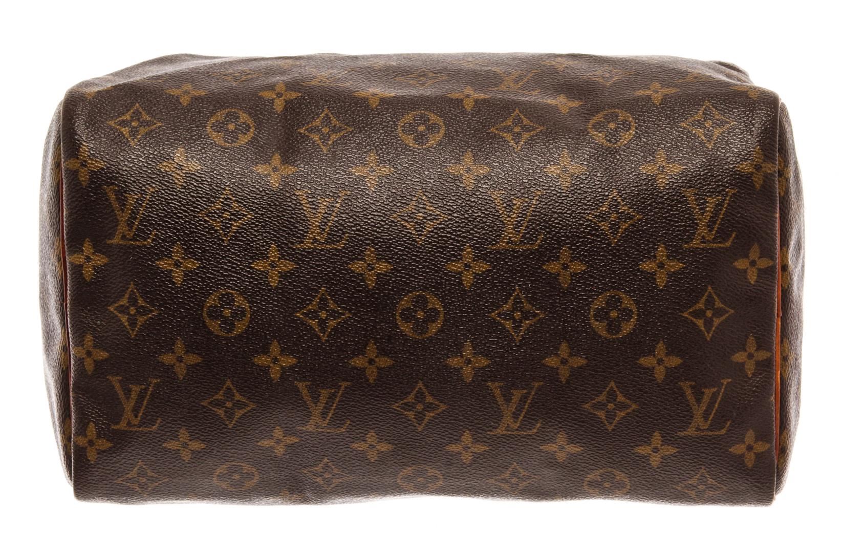 Louis Vuitton Brown Monogram Canvas Leather Speedy 30 Satchel Bag. All available information is listed in the description and shown in the photos. Louis Vuitton Brown Monogram Canvas Leather Speedy 30 Satchel Bag with brass hardware, leather trim, dual rolled handles, canvas lining & single interior pocket, zip closure at top. Height: 10.5" Width: 12" Depth: 6.5", Handle Drop: 3.5" / 26.67 x 30.48 x 16.51 Cm