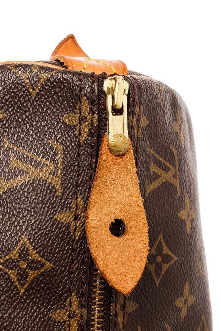 Louis Vuitton Brown Monogram Canvas Leather Speedy 30 Satchel Bag. All available information is listed in the description and shown in the photos. Louis Vuitton Brown Monogram Canvas Leather Speedy 30 Satchel Bag with brass hardware, dual rolled leather top handles, leather trim embellishment, canvas lining & single interior pocket, zip closure at top. Height: 10" Width: 10.25" Depth: 7.5", Handle Drop: 4.5" / 25.4 x 26.03 x 19.05 cm