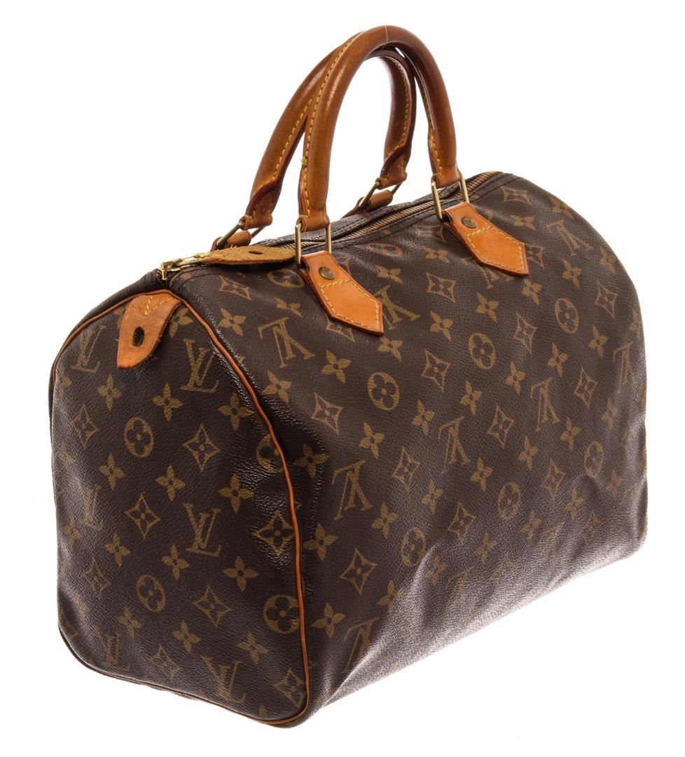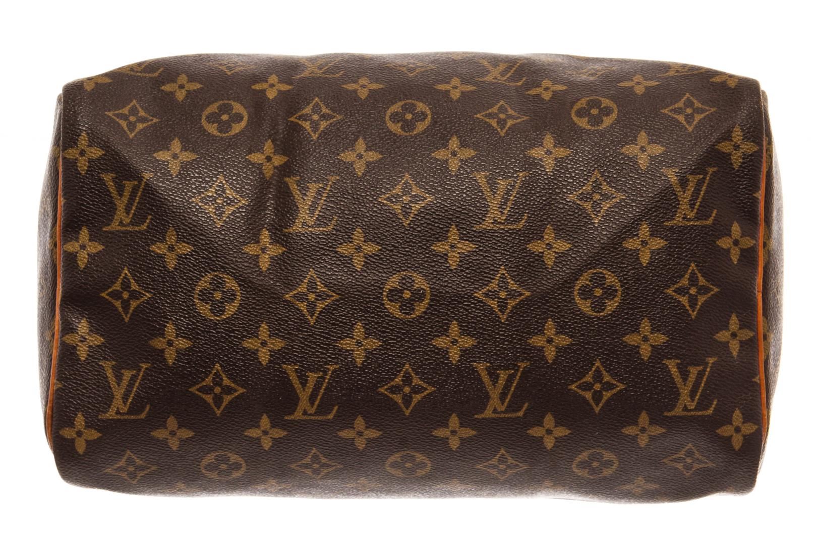 Louis Vuitton Brown Monogram Canvas Leather Speedy 30 Satchel Bag. All available information is listed in the description and shown in the photos. Louis Vuitton Brown Monogram Canvas Leather Speedy 30 Satchel Bag with brass hardware, leather trim, dual rolled handles, leather trim embellishment, canvas lining & single interior pocket, zip closure at top. Height: 8.5" Width: 12" Depth: 6.5", Handle Drop: 3.25" / 21.59 x 30.48 x 16.51 Cm