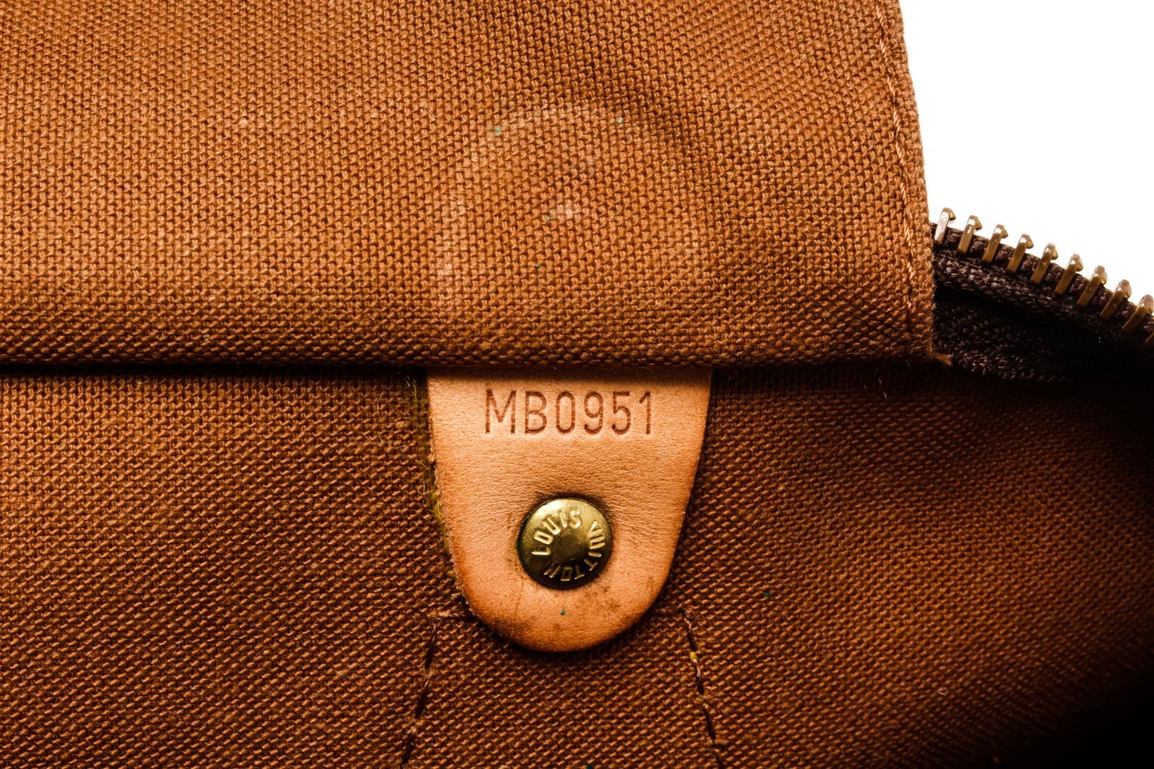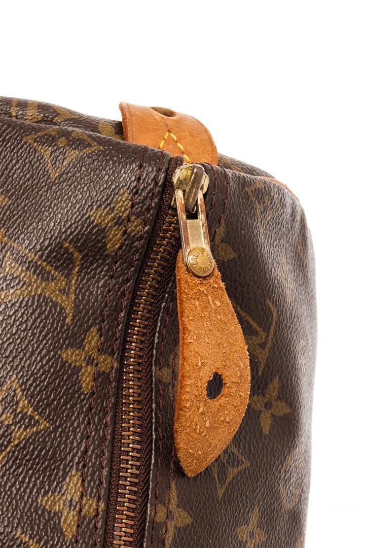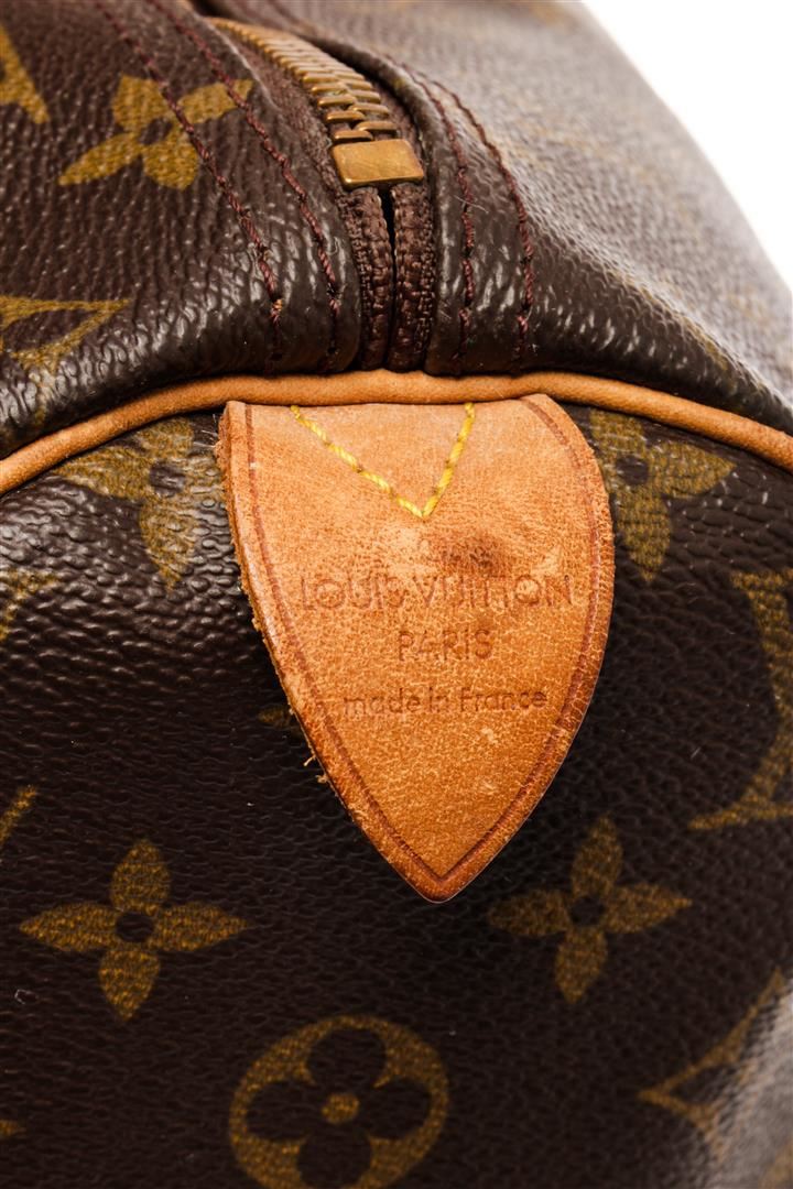 Louis Vuitton Brown Monogram Canvas Leather Speedy 40 Bag. All available information is listed in the description and shown in the photos. Louis Vuitton Brown Monogram Canvas Leather Speedy 40 Bag with gold-tone hardware, leather trim, rolled handles & dual shoulder straps, leather trim embellishment, canvas lining & single interior pocket, zip closure at top. Height: 10" Width: 15.75" Depth: 7.5", Handle Drop: 3.75", / 25.4 x 40.00 x 19.05 Cm