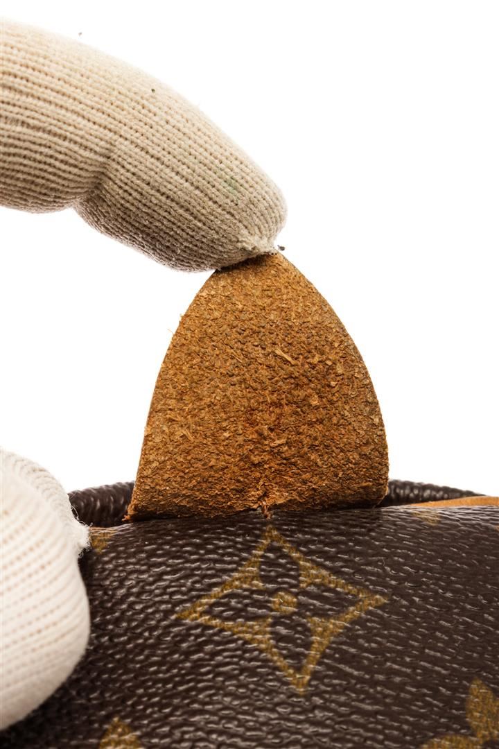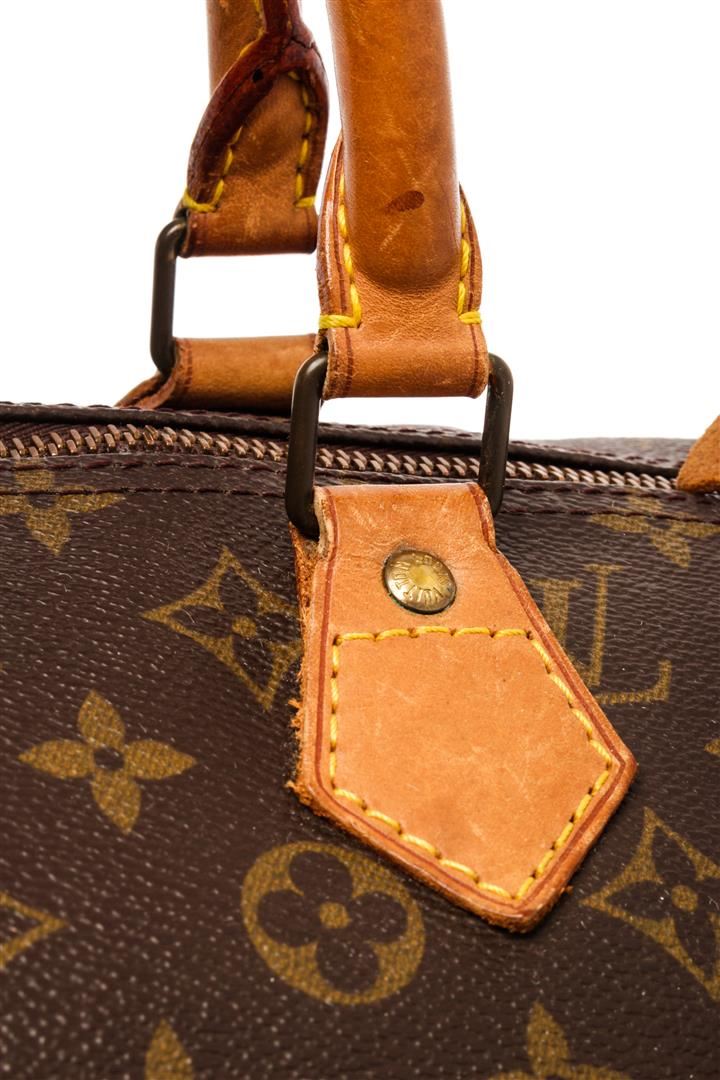Louis Vuitton Brown Monogram Canvas Leather Speedy 40 Bag. All available information is listed in the description and shown in the photos. Louis Vuitton Brown Monogram Canvas Leather Speedy 40 Bag with gold-tone hardware, leather trim, rolled handles & dual shoulder straps, leather trim embellishment, canvas lining & single interior pocket, zip closure at top. Height: 10" Width: 15.75" Depth: 7.5", Handle Drop: 3.75", / 25.4 x 40.00 x 19.05 Cm
