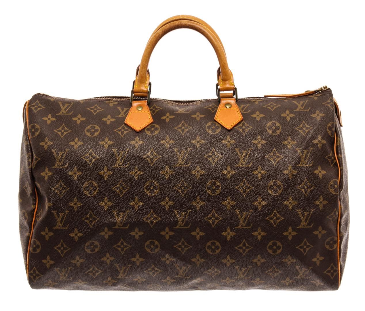 Louis Vuitton Brown Monogram Canvas Leather Speedy 40 Satchel Bag. All available information is listed in the description and shown in the photos. Louis Vuitton Brown Monogram Canvas Leather Speedy 40 Satchel Bag with brass hardware, leather trim, rolled handles & dual shoulder straps, leather trim embellishment, canvas lining & single interior pocket, zip closure at top. Height: 14" Width: 15" Depth: 8", Handle Drop: 4" / 35.56 x 38.1 x 20.32 Cm