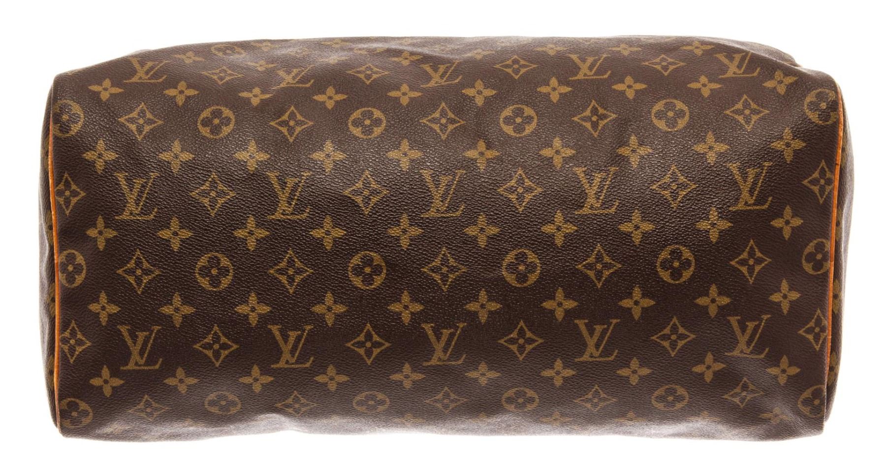 Louis Vuitton Brown Monogram Canvas Leather Speedy 40 Satchel Bag. All available information is listed in the description and shown in the photos. Louis Vuitton Brown Monogram Canvas Leather Speedy 40 Satchel Bag with brass hardware, leather trim, rolled handles & dual shoulder straps, leather trim embellishment, canvas lining & single interior pocket, zip closure at top. Height: 14" Width: 15" Depth: 8", Handle Drop: 4" / 35.56 x 38.1 x 20.32 Cm