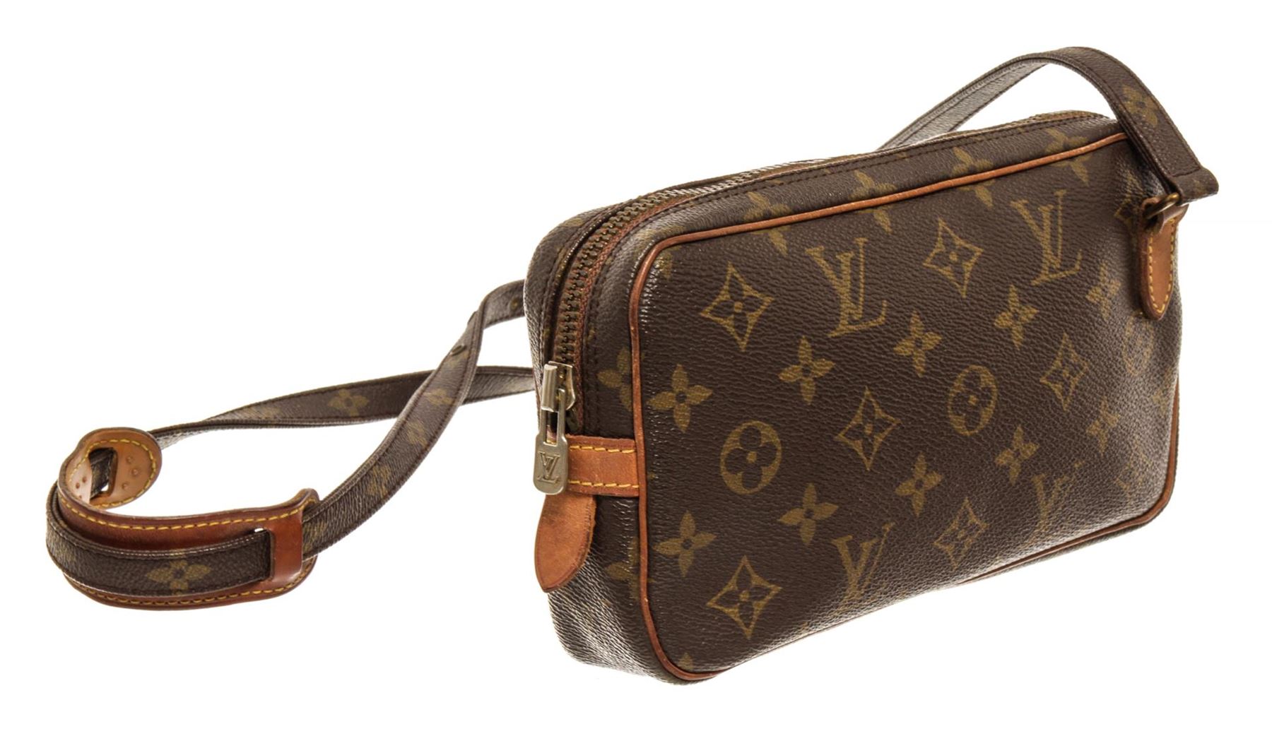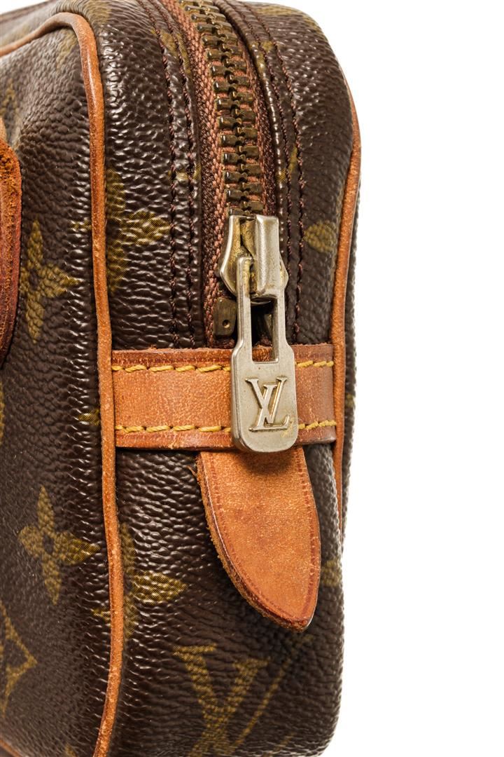 One Louis Vuitton Brown Monogram Canvas Marly Bandouliere Bag. Item is sold AS-IS. All available information is listed in the description and shown in the photo. Louis Vuitton Brown Monogram Canvas Marly Bandouliere Bag with Gold-tone hardware, Tan Vachetta leather trim, canvas lining, adjustable shoulder strap, and zip closure.