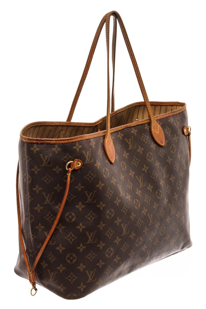 Louis Vuitton Brown Monogram Canvas Neverfull GM Tote Bag. All available information is listed in the description and shown in the photos. Louis Vuitton Brown Monogram Canvas Neverfull GM Tote Bag with brown coated canvas, brass hardware, dual shoulder straps, canvas lining & single interior pocket, clasp closure at top. Height: 12.5" Width: 15.5" Depth: 8", Shoulder Strap Drop: 8.25" / 31.75 x 39.37 x 20.32 Cm