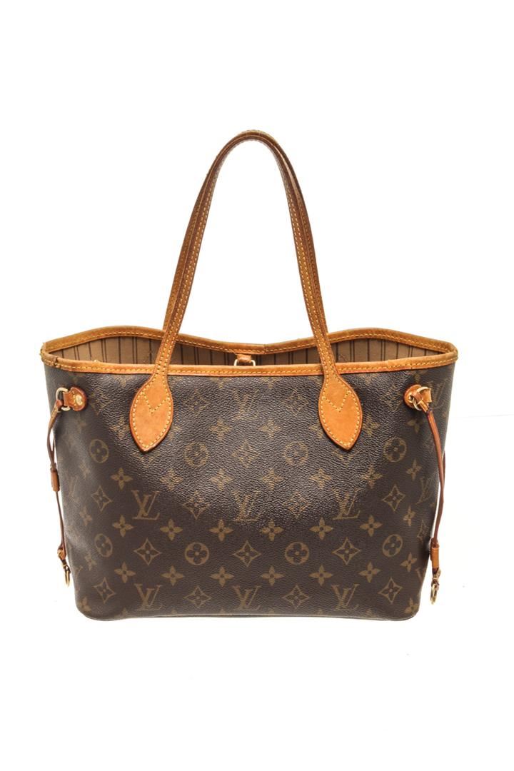 One Louis Vuitton Brown Monogram Canvas Neverfull PM Tote bag. Item is sold AS-IS. All available information is listed in the description and shown in the photo. Louis Vuitton Brown Monogram Canvas Neverfull PM Tote bag with gold-tone hardware, leather trim, two long top handles, internal zip-fastening pocket, open top. There is tearing on the top lining of the bag and pen marks on the canvas lining. Please refer to photos.