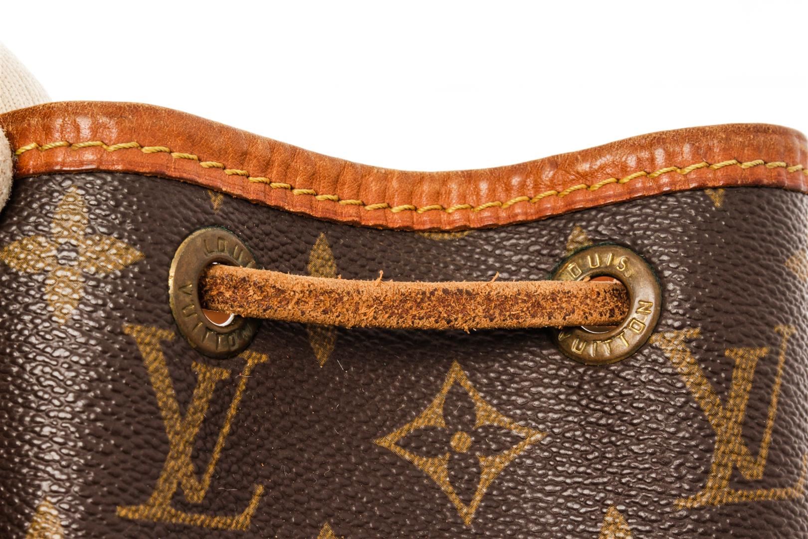 Louis Vuitton Brown Monogram Canvas Noe PM Bucket Bag. All available information is listed in the description and shown in the photos. Louis Vuitton Brown Monogram Canvas Noe PM Bucket Bag with brown coated canvas, brass hardware, single adjustable shoulder strap, canvas lining, drawstring closure at front. Height: 10" Width: 9.5" Depth: 6.75", Shoulder Strap Drop: 9.25-12" / 25.4 x 24.13 x 17.14 Cm