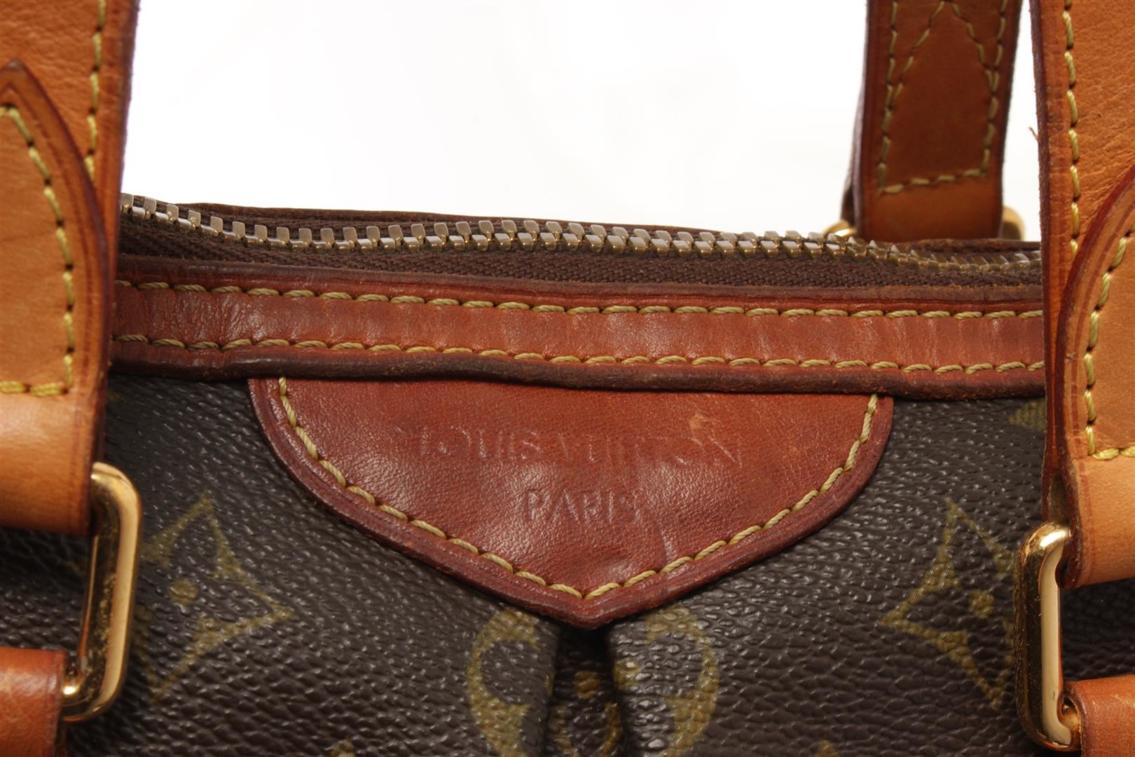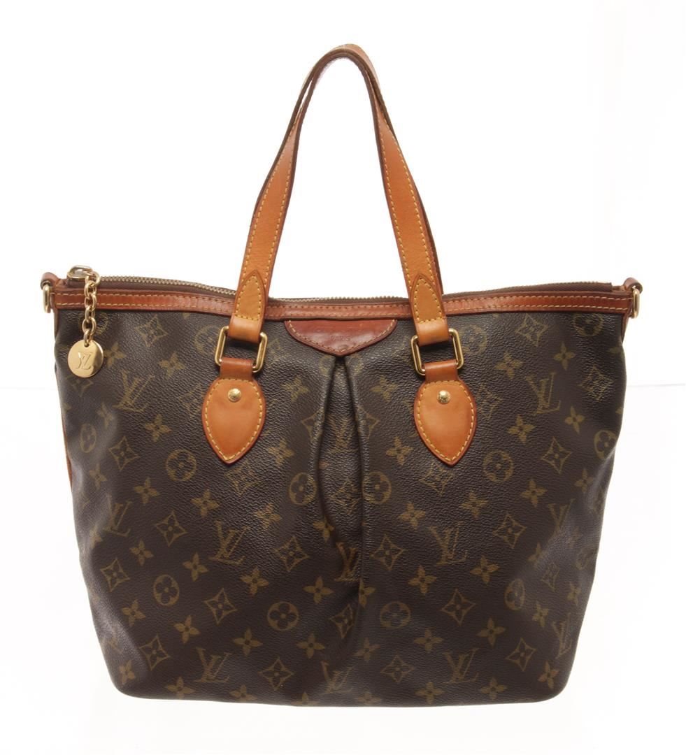 One Louis Vuitton Brown Monogram Canvas Palermo PM Tote Bag. Item is sold AS-IS. All available information is listed in the description and shown in the photo. Louis Vuitton Brown Monogram Canvas Palermo PM Tote Bag with monogram coated canvas, vachetta cowhide leather top handles, an optional shoulder strap, and trim with gold tone hardware including an lv monogram zipper pull charm. the top zips open to a cocoa brown fabric interior with patch pockets. Length: 14.00 in, Width: 6.25 in, Height: 10.00 in / 35.56 x 15.87 x 25.4 CM