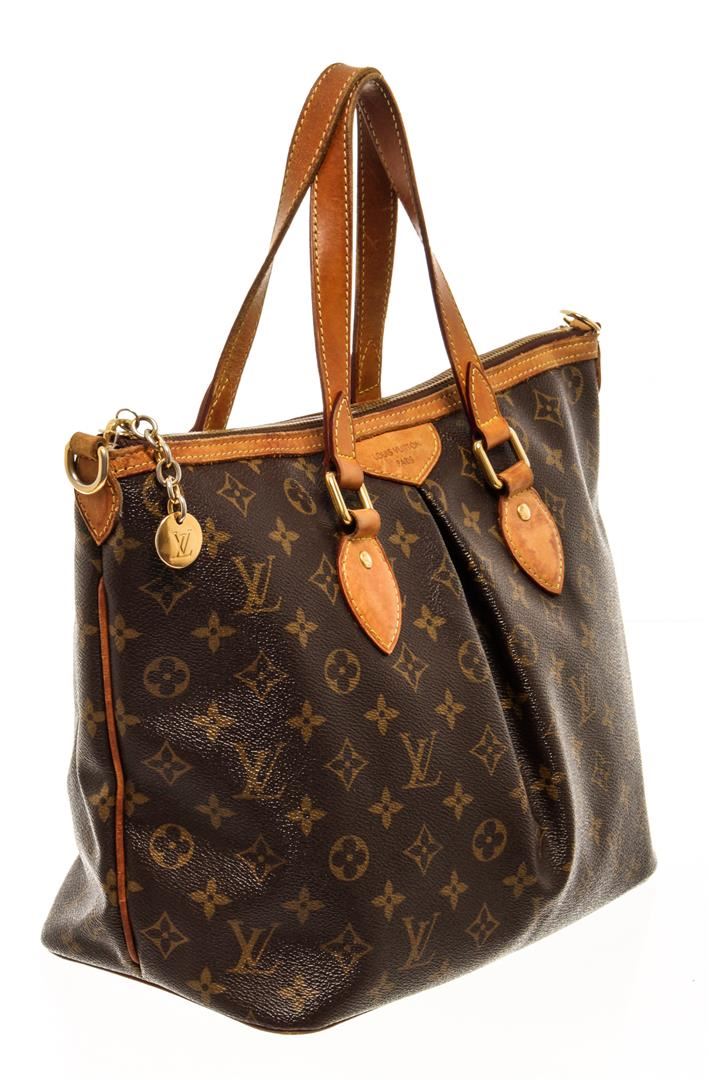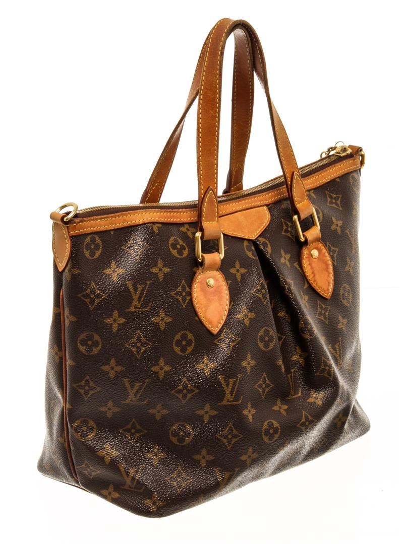 One Louis Vuitton Brown Monogram Canvas Palermo PM Tote Bag. Item is sold AS-IS. All available information is listed in the description and shown in the photo. louis vuitton brown monogram canvas palermo pm tote bag with monogram coated canvas, vachetta cowhide leather top handles, an optional shoulder strap, piping, and trim with polished brass hardware including an lv monogram zipper pull charm. the top zips open to a cocoa brown fabric interior with patch pockets. Length: 14.00 in, Width: 6.25 in, Height: 10.00 in / 35.56 x 15.87 x 25.4 CM