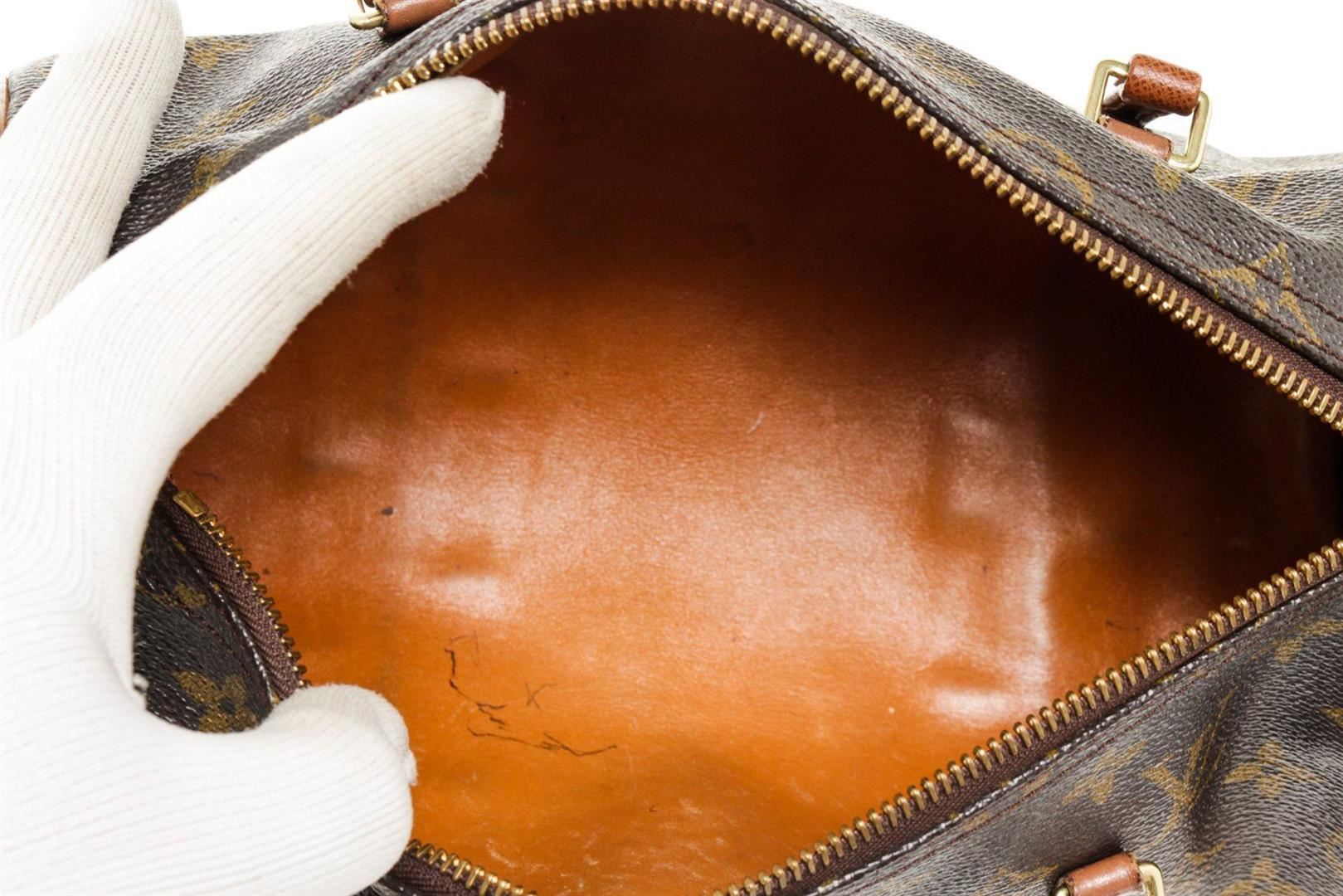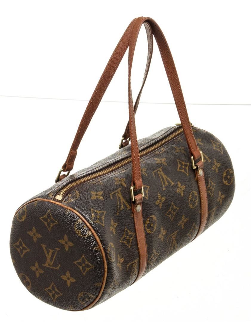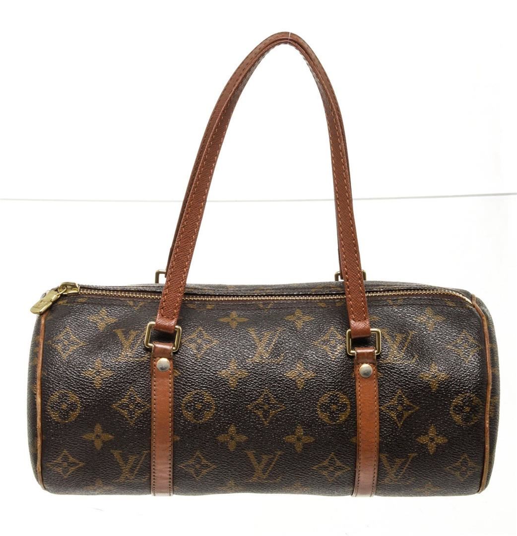 Louis Vuitton Brown Monogram Canvas Papillon 30cm Handbag with damier canvas, gold-tone hardware, trim tan vachetta leather, shoulder strap and zipper closure.