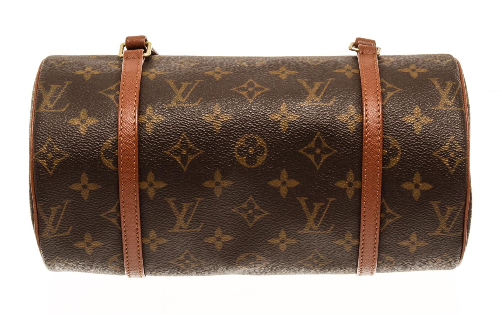 One Louis Vuitton Brown Monogram Canvas Papillon 26 Shoulder Bag. Item is sold AS-IS. All available information is listed in the description and shown in the photo. louis vuitton brown monogram canvas papillon 26 bag with gold-tone hardware, leather trim, main compartment, top zip fastening, two top handles Depth 5.1 in, Handle 6.3 in, Height 5.1 in, Width 10.2 in / Depth 13 cm, Handle 16 cm, Height 13 cm, nWidth 26 cm