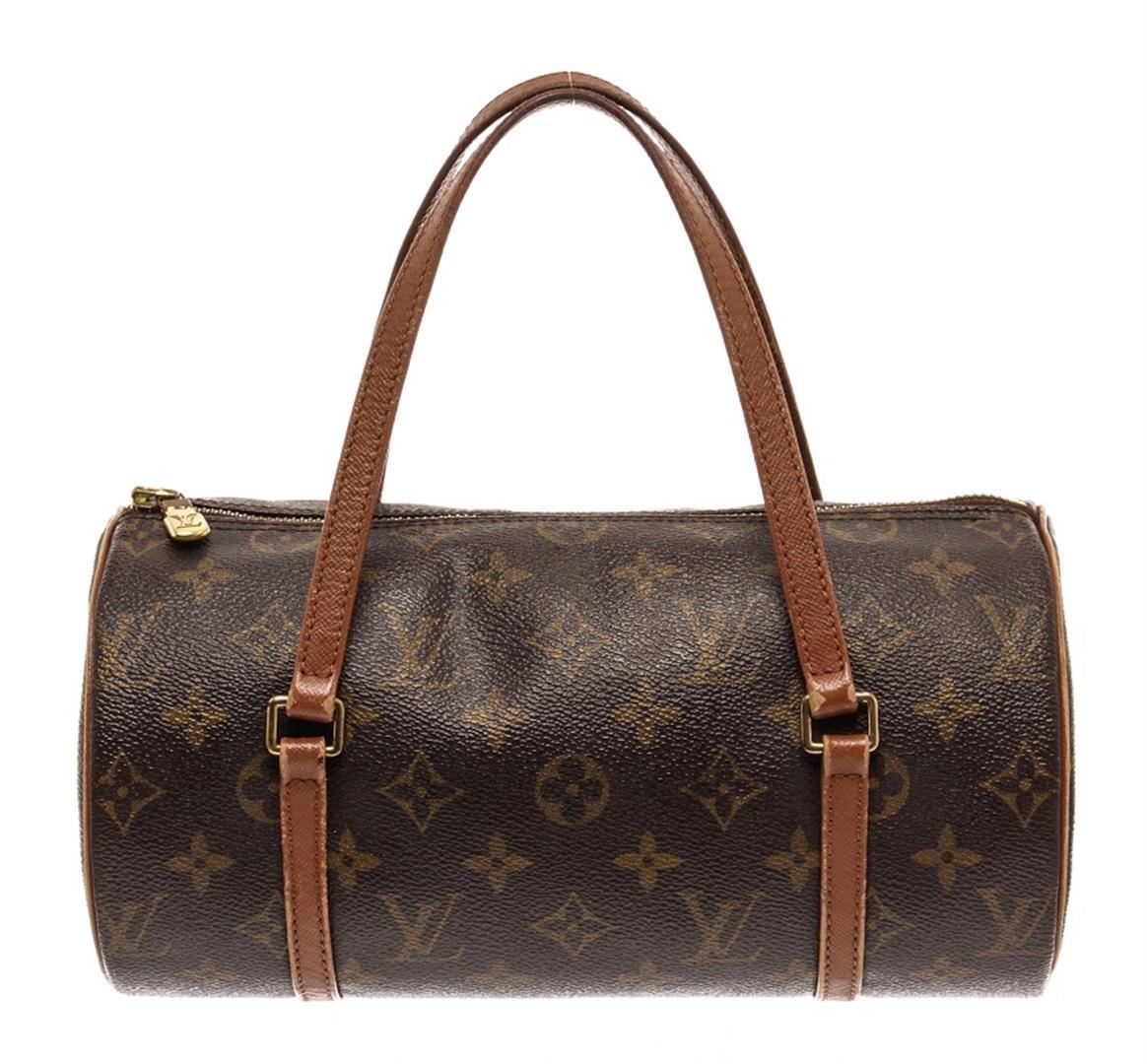 Louis Vuitton Brown Monogram Canvas Papillon 26 Top Handle Bag. All available information is listed in the description and shown in the photos. Louis Vuitton Brown Monogram Canvas Papillon 26 Top Handle Bag with this handbag features, brass hardware, leather trim, dual flat handles, leather trim embellishment, leather lining, zip closure at top. Height: 5.25" Width: 10.25" Depth: 5.25", Handle Drop: 6.5" / 13.33 x 26.03 x 13.33 Cm