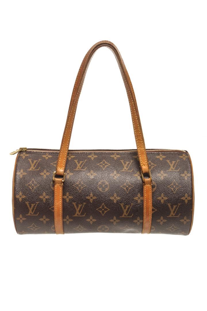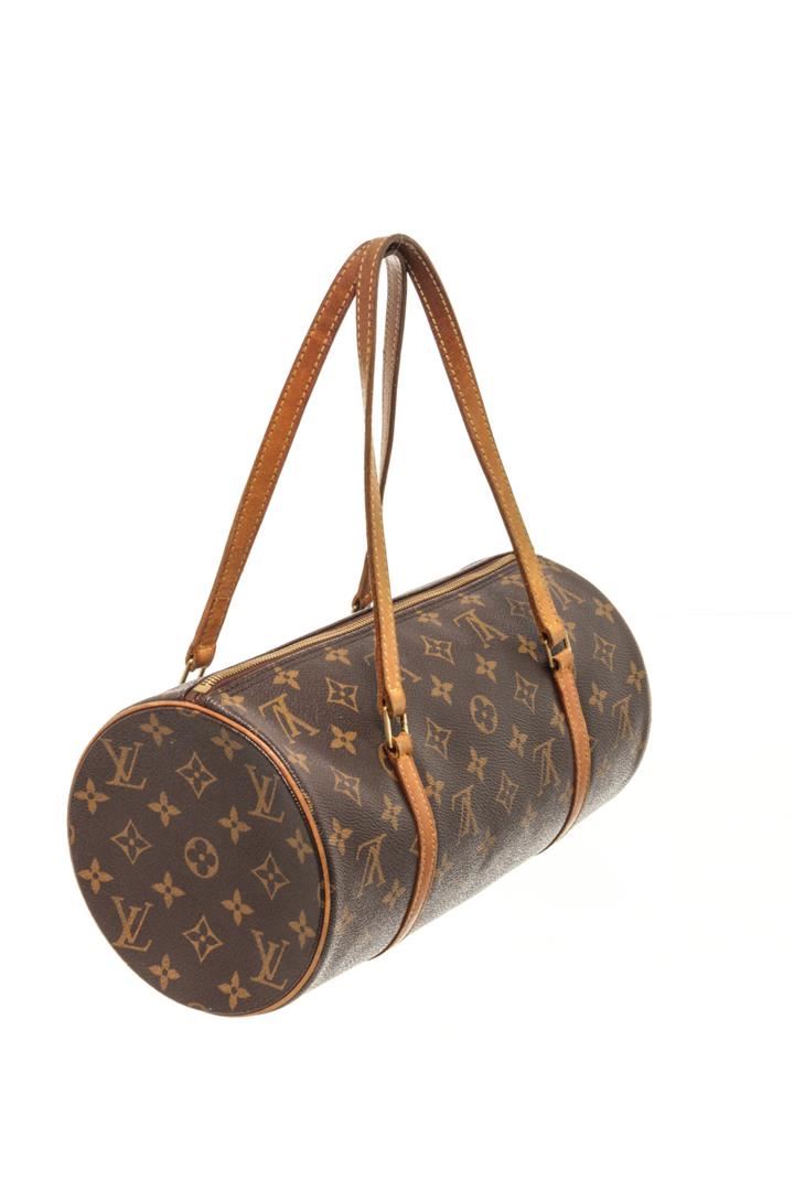 One Louis Vuitton Brown Monogram Canvas Papillon Bag. Item is sold AS-IS. All available information is listed in the description and shown in the photo. louis vuitton brown monogram canvas papillon bag with features a monogram canvas body, flat leather shoulder straps and trim, and a top zip closure. Height: 5.5" Width: 11.8" Depth: 5.5", Handle Drop: 6.7" / 13.97 x 29.97 x 13.97 Cm