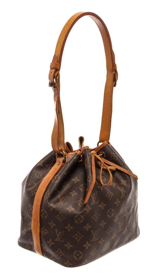 Louis Vuitton Brown Monogram Canvas Petit Noe Shoulder Bag. All available information is listed in the description and shown in the photos. Louis Vuitton Brown Monogram Canvas Petit Noe Shoulder Bag with brown coated canvas, brass hardware, single shoulder strap, canvas lining, pull-through closure at front. Height: 10.5" Width: 9.5" Depth: 7", Shoulder Strap Drop: 10-12.75" / 26.67 x 24.13 x 17.78 Cm