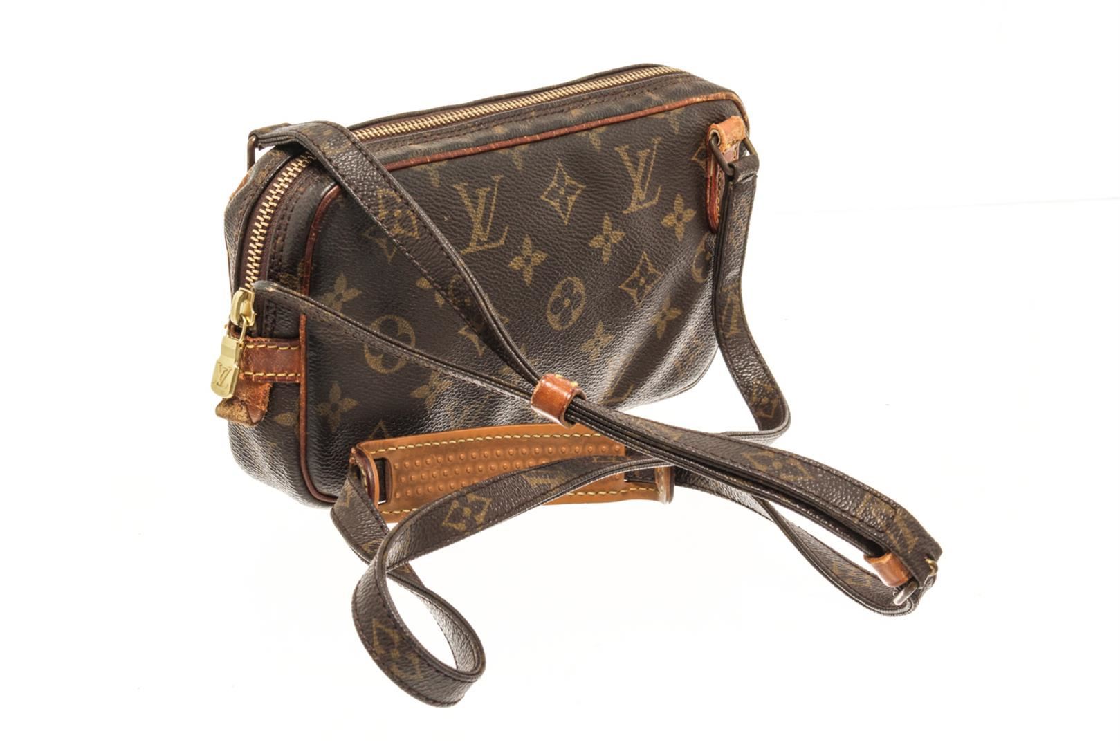 One Louis Vuitton Brown Monogram Canvas Pochette Marli Bandolier Shoulder Bag. Item is sold AS-IS. All available information is listed in the description and shown in the photo. louis vuitton brown monogram canvas pochette marli bandolier shoulder bag (HxWxD): 14cm x 22cm x 4.6cm / 5.51'' x 8.66'' x 1.81''