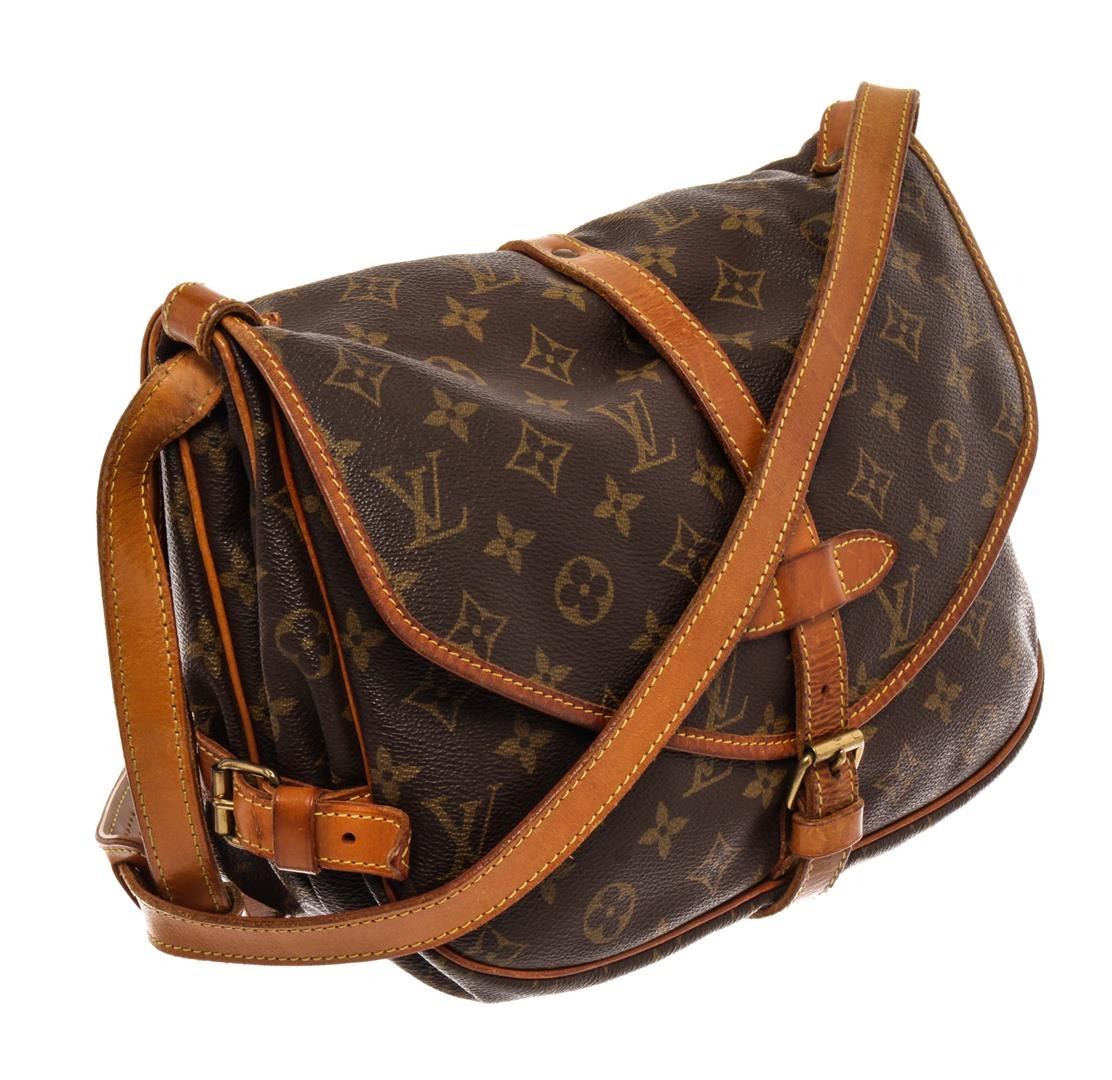 Louis Vuitton Brown Monogram Canvas Saumur 30cm Shoulder Bag. All available information is listed in the description and shown in the photos. Louis Vuitton Brown Monogram Canvas Saumur 30cm Shoulder Bag with brown coated canvas, brass hardware, leather trim, single adjustable shoulder strap, leather trim embellishment, canvas lining & three interior pockets, flap & buckle closures at front. Height: 10" Width: 12" Depth: 9.25", Shoulder Strap Drop: 19.5" / 25.4 x 30.48 x 23.49 Cm