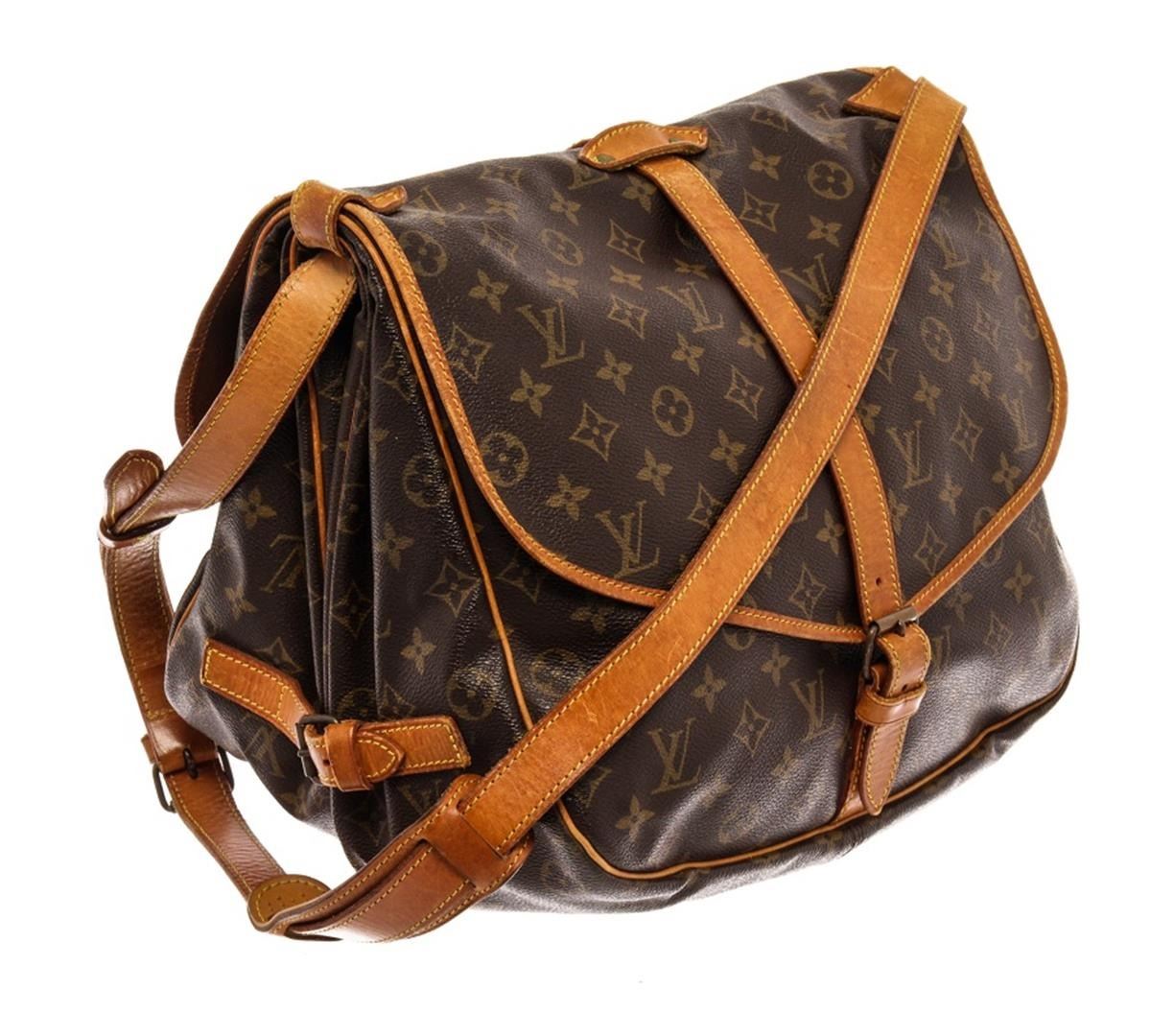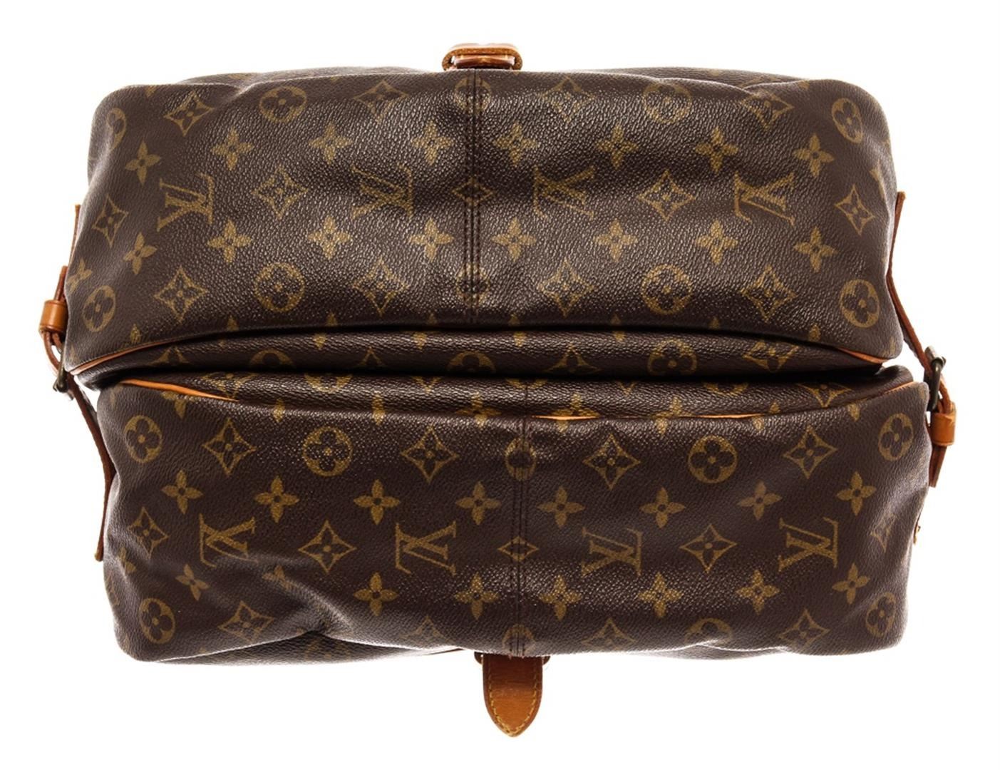 Louis Vuitton Brown Monogram Canvas Saumur 35 Messenger Bag. All available information is listed in the description and shown in the photos. Louis Vuitton Brown Monogram Canvas Saumur 35 Messenger Bag with brown coated canvas, brass hardware, single adjustable shoulder strap, leather trim embellishment, canvas lining & three interior pockets, buckle closure at front. Height: 12" Width: 14" Depth: 4.25", Shoulder Strap Drop: 17.75" / 30.48 x 35.56 x 10.79 Cm