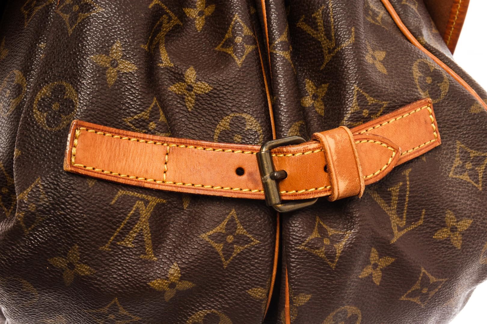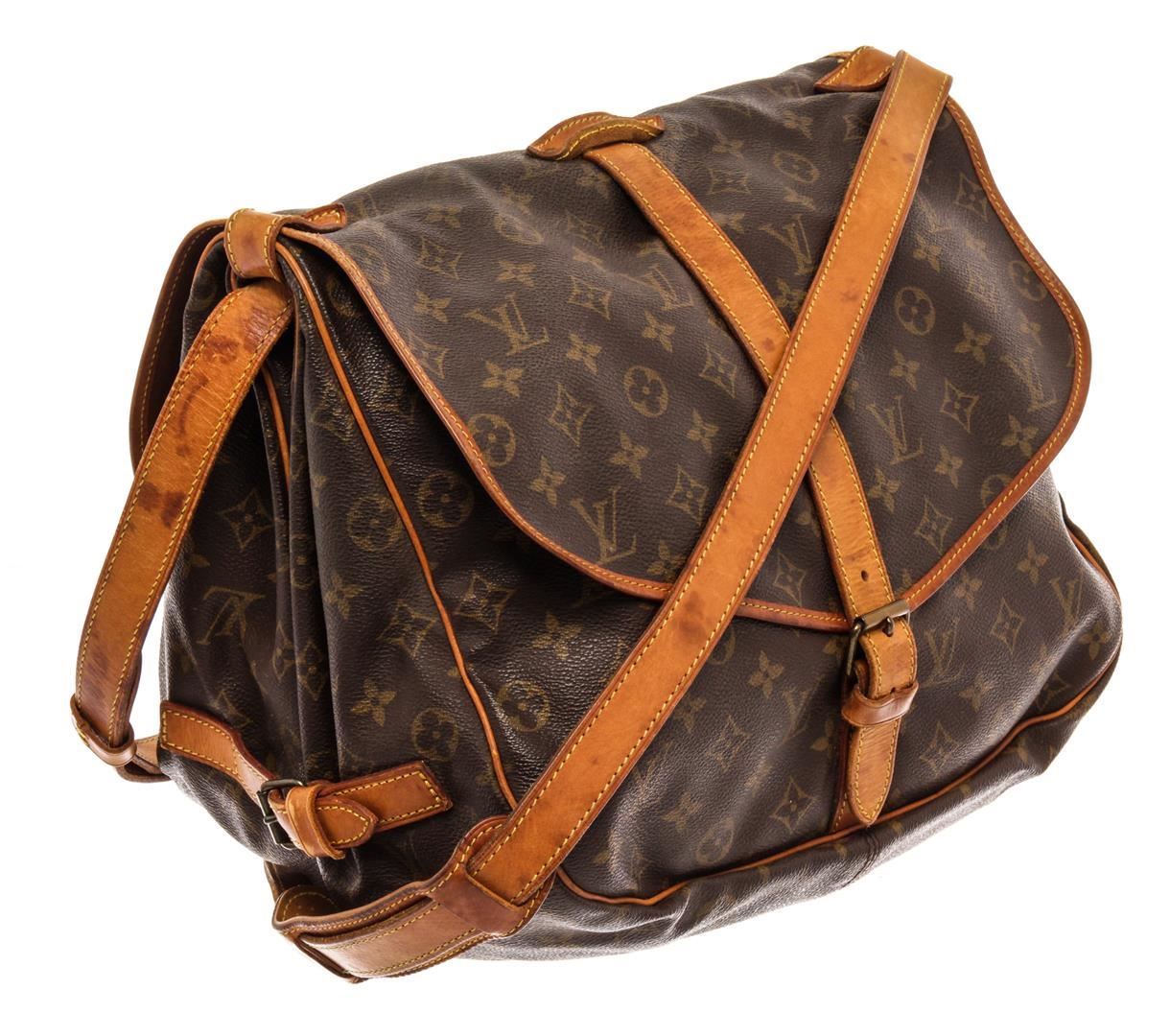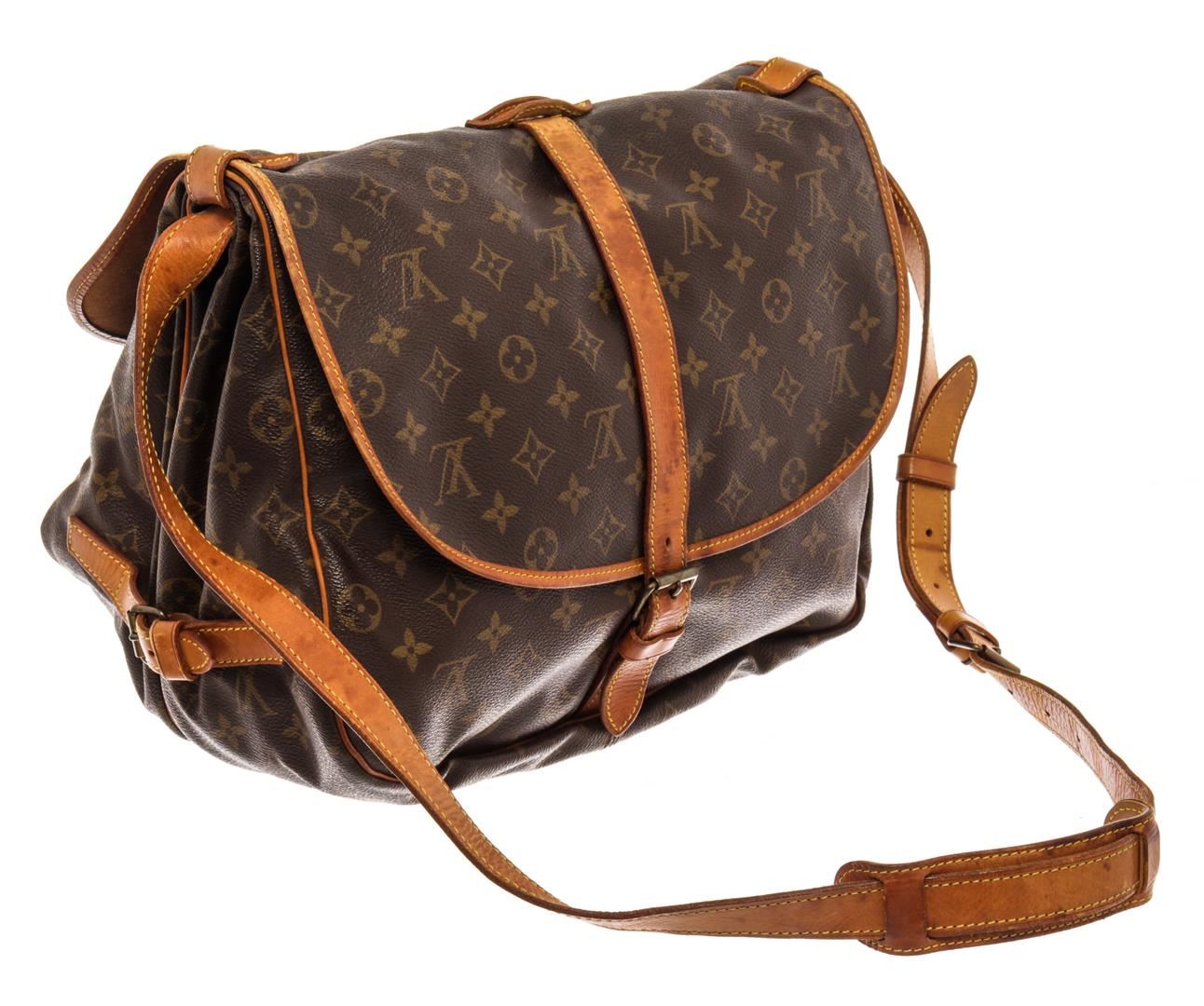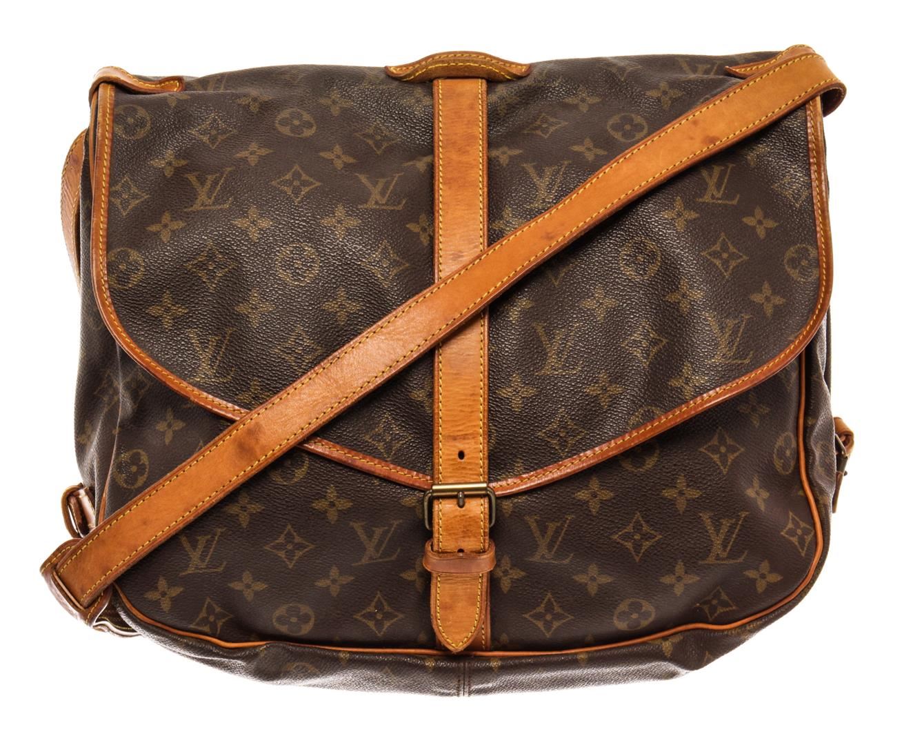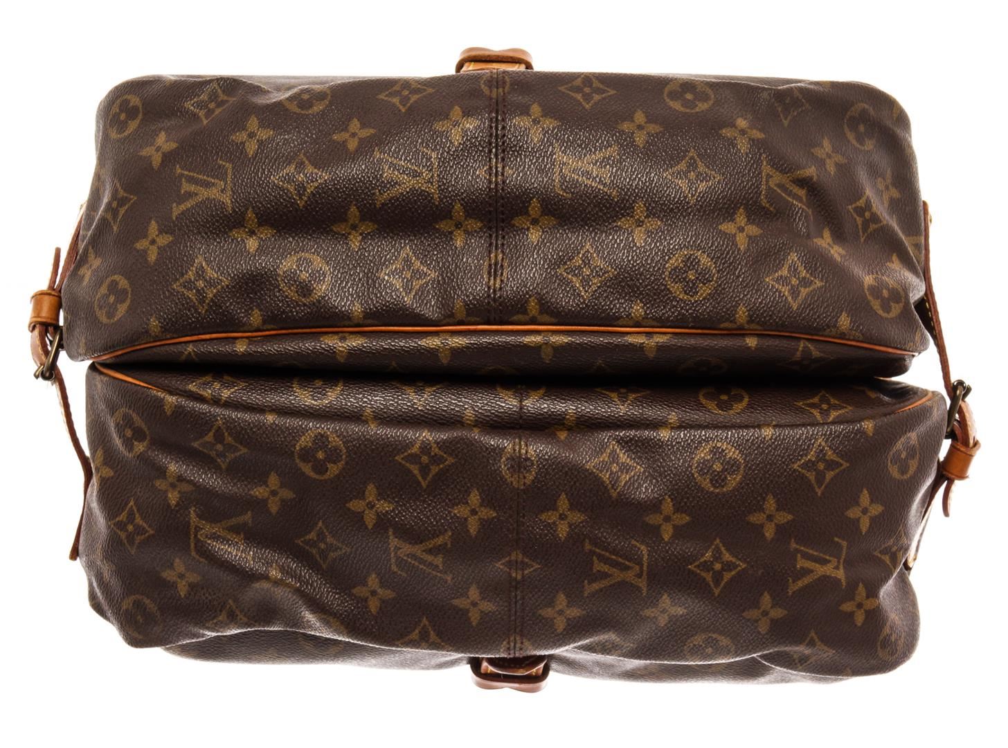 Louis Vuitton Brown Monogram Canvas Saumur 35cm Shoulder Bag. All available information is listed in the description and shown in the photos. Louis Vuitton Brown Monogram Canvas Saumur 35cm Shoulder Bag with brass hardware, leather trim, single adjustable shoulder strap, leather trim embellishment, canvas lining & three interior pockets, buckle closures at front & back. Height: 13" Width: 12.75" Depth: 3.25", Shoulder Strap Drop: 17.75" / 33.02 x 32.38 x 8.25 Cm