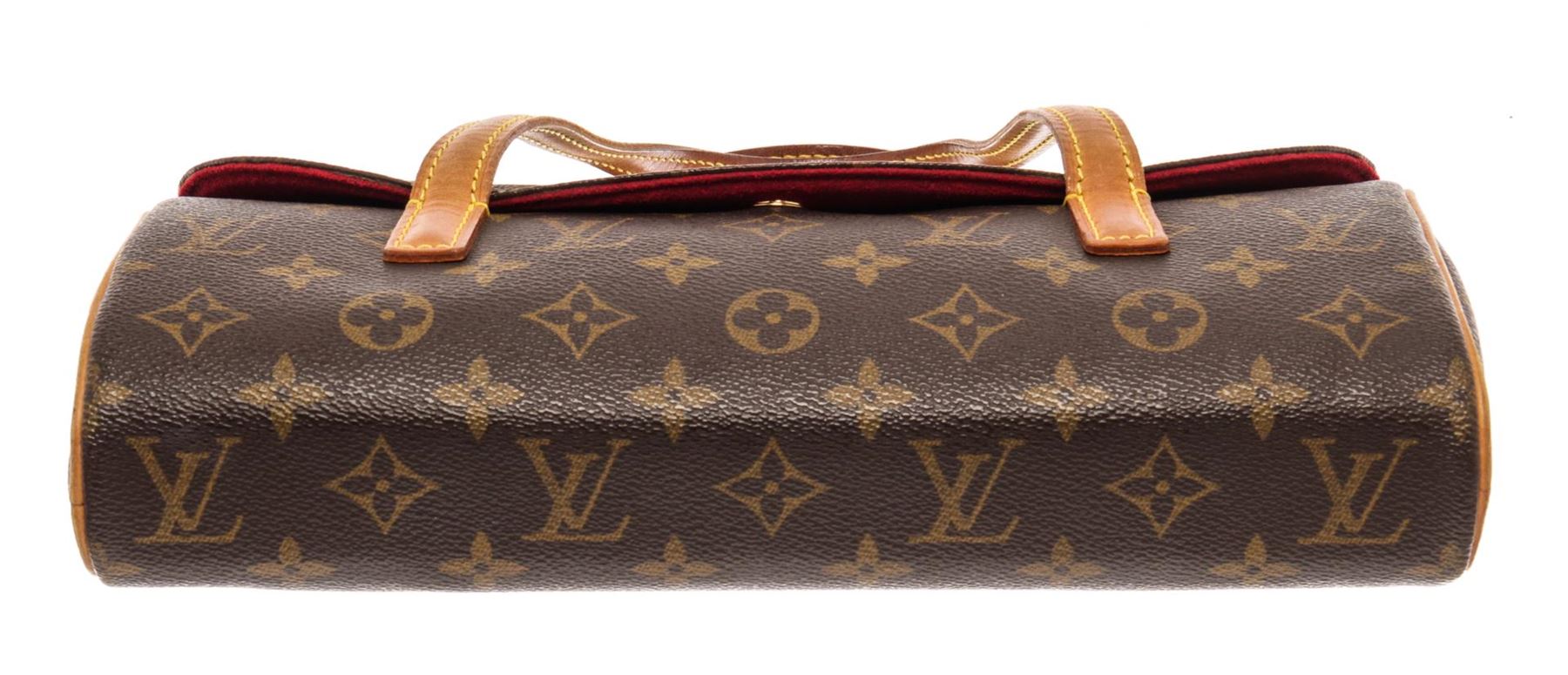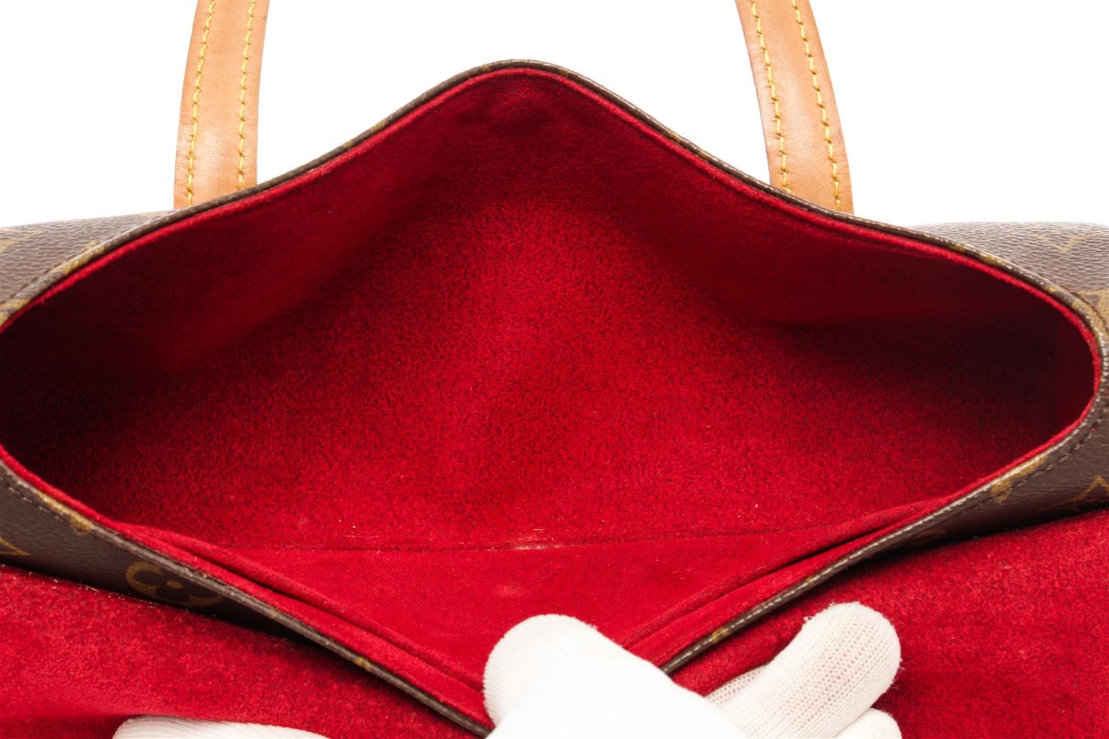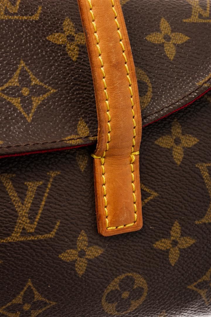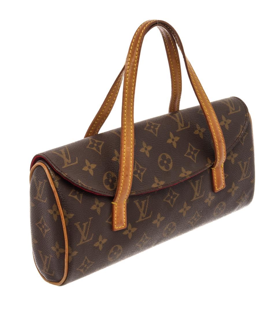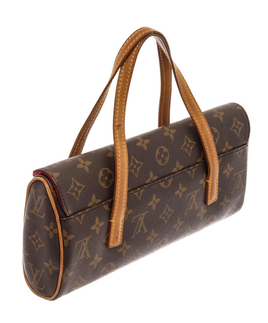 Louis Vuitton Brown Monogram Canvas Sonatine Tote Bag. All available information is listed in the description and shown in the photos. Louis Vuitton Brown Monogram Canvas Sonatine Tote Bag with chocolate brown/coffee brown/camel-coloured, leather, signature Monogram canvas, foldover top with snap fastening, two rounded top handles, internal patch pocket, internal logo stamp, full lining, gold-tone hardware, barrel body. Depth 2.4 in, Handle 3.9 in, Height 6.3 in, Width 11.2 in / Depth 6 cm, Handle 10 cm, Height 16 cm, Width 28.5 cm