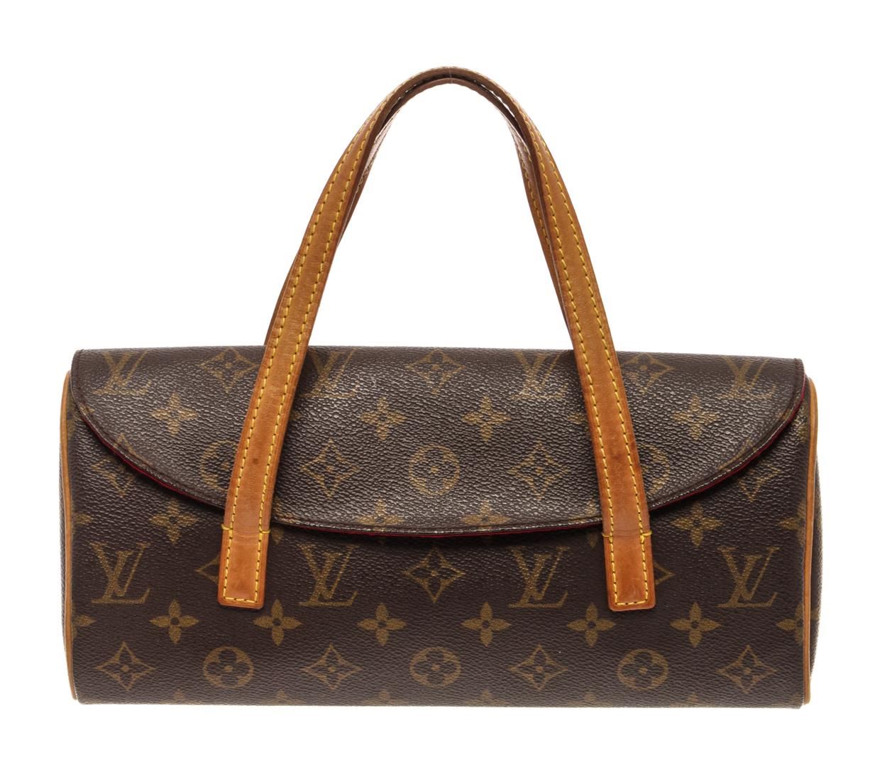 Louis Vuitton Brown Monogram Canvas Sonatine Tote Bag. All available information is listed in the description and shown in the photos. Louis Vuitton Brown Monogram Canvas Sonatine Tote Bag with chocolate brown/coffee brown/camel-coloured, leather, signature Monogram canvas, foldover top with snap fastening, two rounded top handles, internal patch pocket, internal logo stamp, full lining, gold-tone hardware, barrel body. Depth 2.4 in, Handle 3.9 in, Height 6.3 in, Width 11.2 in / Depth 6 cm, Handle 10 cm, Height 16 cm, Width 28.5 cm