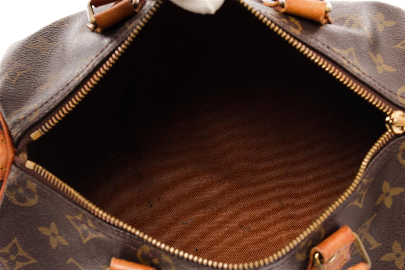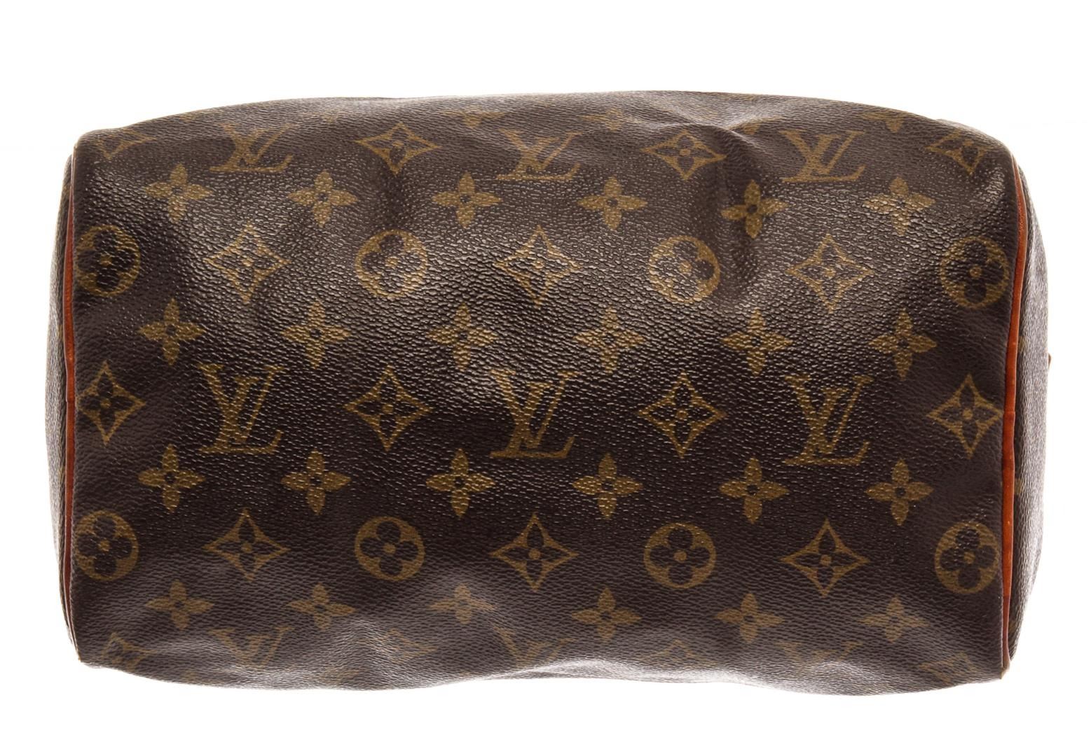 Louis Vuitton Brown Monogram Canvas Speedy 25 Satchel Bag. All available information is listed in the description and shown in the photos. Louis Vuitton Brown Monogram Canvas Speedy 25 Satchel Bag with brass hardware, leather trim, rolled handles, canvas lining & single interior pocket, zip closure at top. Height: 7.25" Width: 10" Depth: 5.5", Handle Drop: 3" / 18.41 x 25.4 x 13.97 Cm