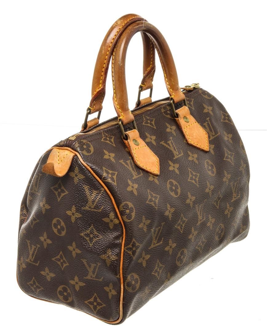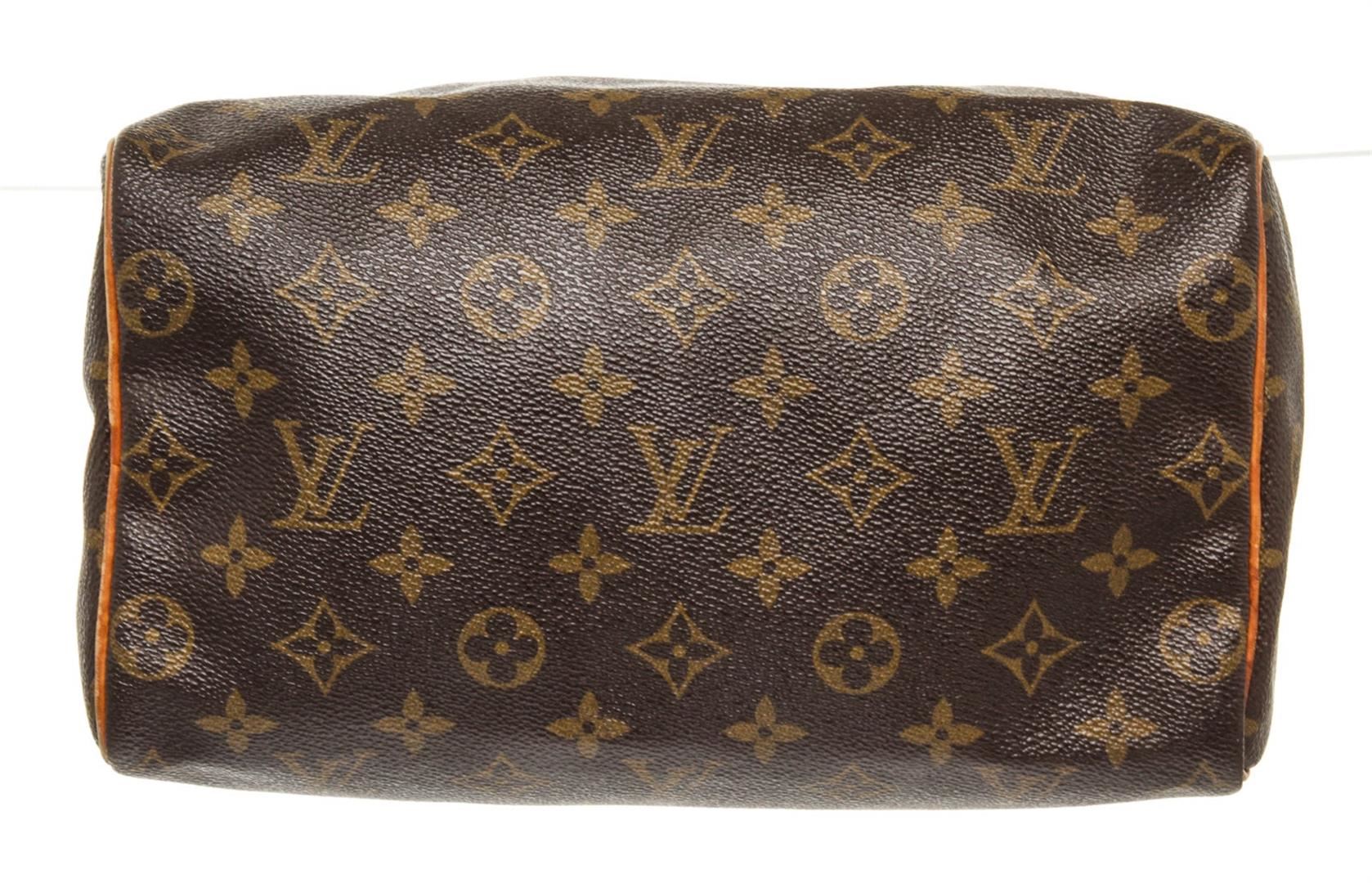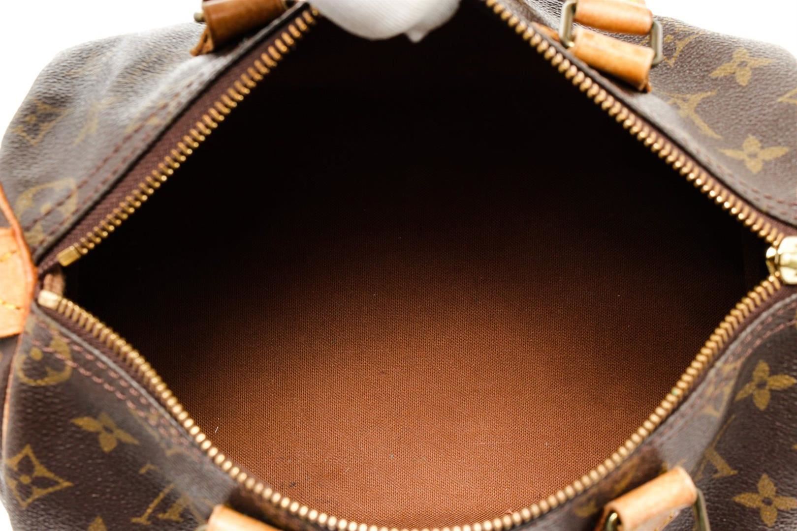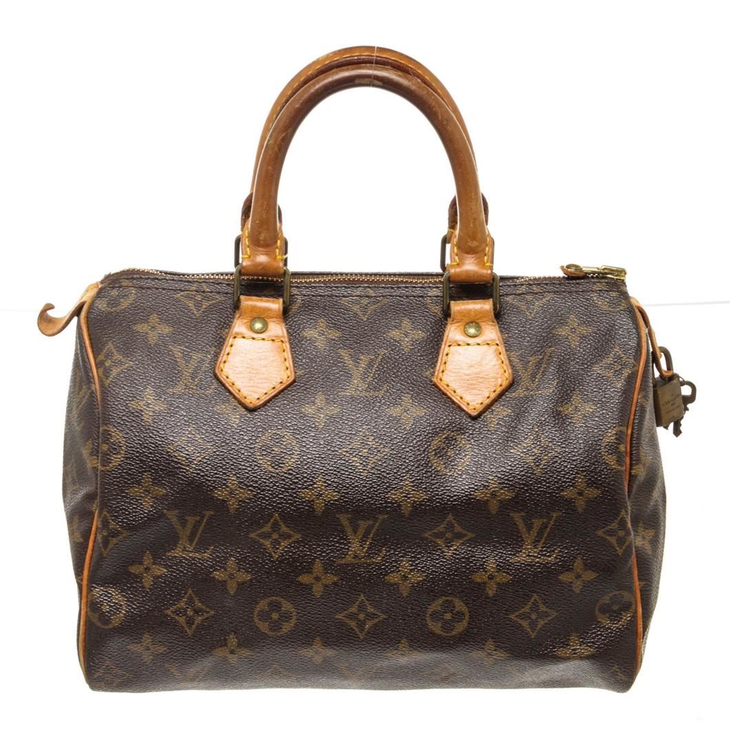 Louis Vuitton Brown Monogram Canvas Speedy 25cm Satchel Bag with monogram canvas, gold-tone hardware, tan vachetta leather trim, interior single pockets, dual top handle, and zipper closure.