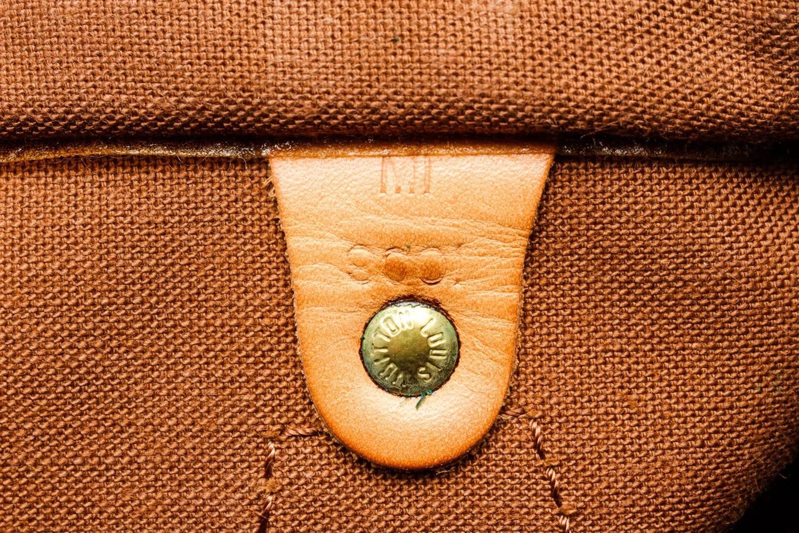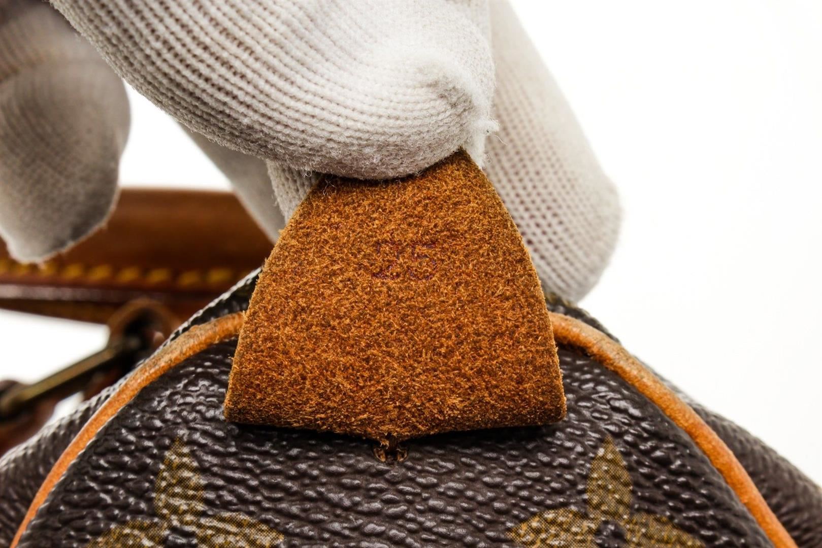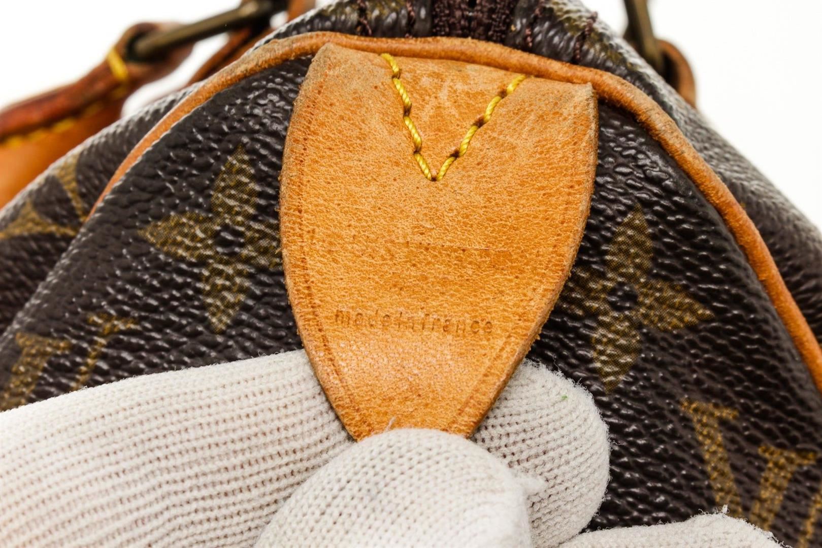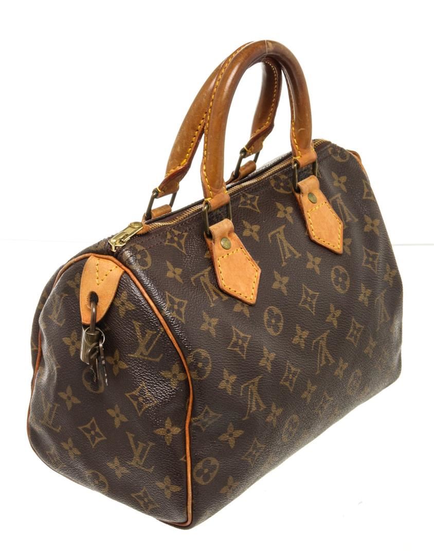 Louis Vuitton Brown Monogram Canvas Speedy 25cm Satchel Bag with monogram canvas, gold-tone hardware, tan vachetta leather trim, interior single pockets, dual top handle, and zipper closure.