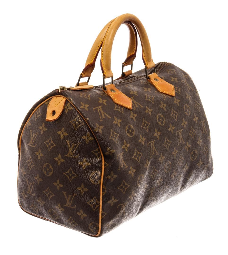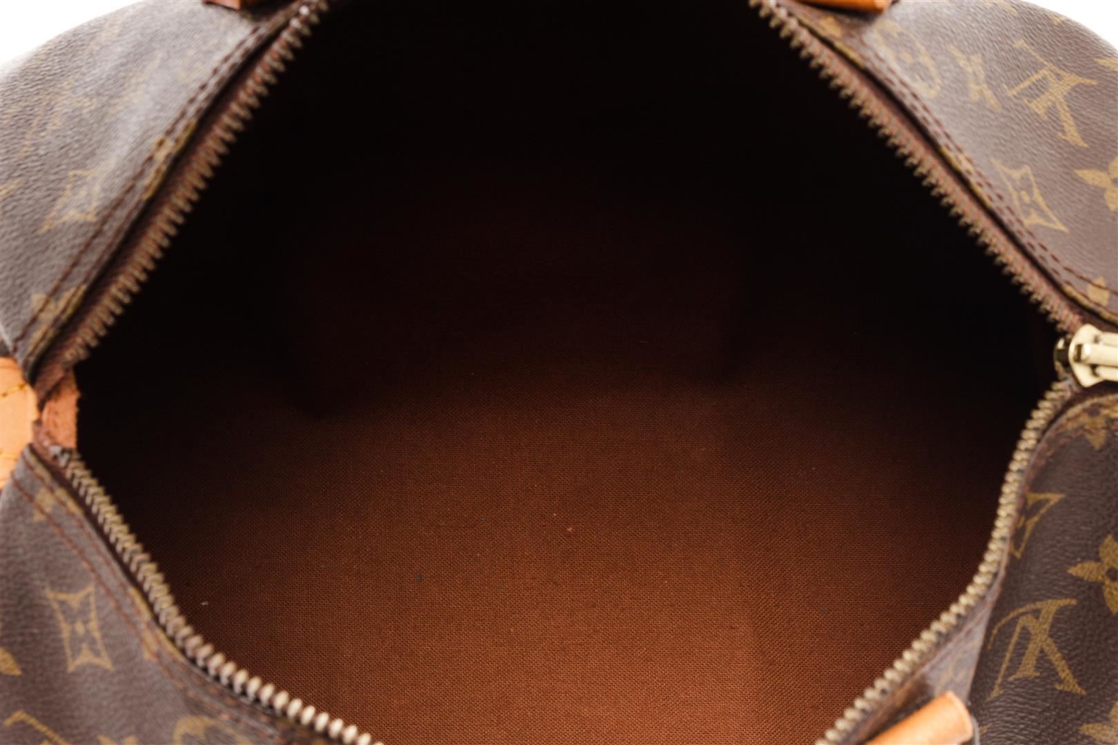 Louis Vuitton Brown Monogram Canvas Speedy 30 Satchel Bag. All available information is listed in the description and shown in the photos. Louis Vuitton Brown Monogram Canvas Speedy 30 Satchel Bag with brass hardware, leather trim, dual rolled handles, leather trim embellishment, canvas lining & single interior pocket, zip closure at top. Height: 8.5" Width: 12.5" Depth: 7", Handle Drop: 3.5" / 21.59 x 31.75 x 17.78 Cm