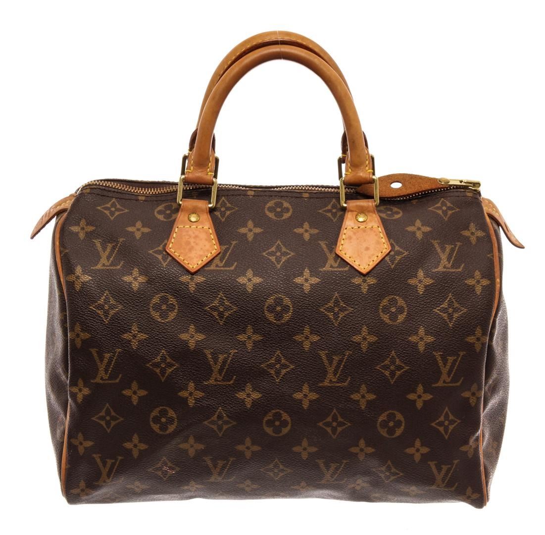 Louis Vuitton Brown Monogram Canvas Speedy 30 Satchel Bag. All available information is listed in the description and shown in the photos. Louis Vuitton Brown Monogram Canvas Speedy 30 Satchel Bag with brass hardware, leather trim, dual rolled handles, leather trim embellishment, canvas lining & single interior pocket, zip closure at top. Height: 8.5" Width: 12" Depth: 6.5", Handle Drop: 3.25" / 21.59 x 30.48 x 16.51 Cm