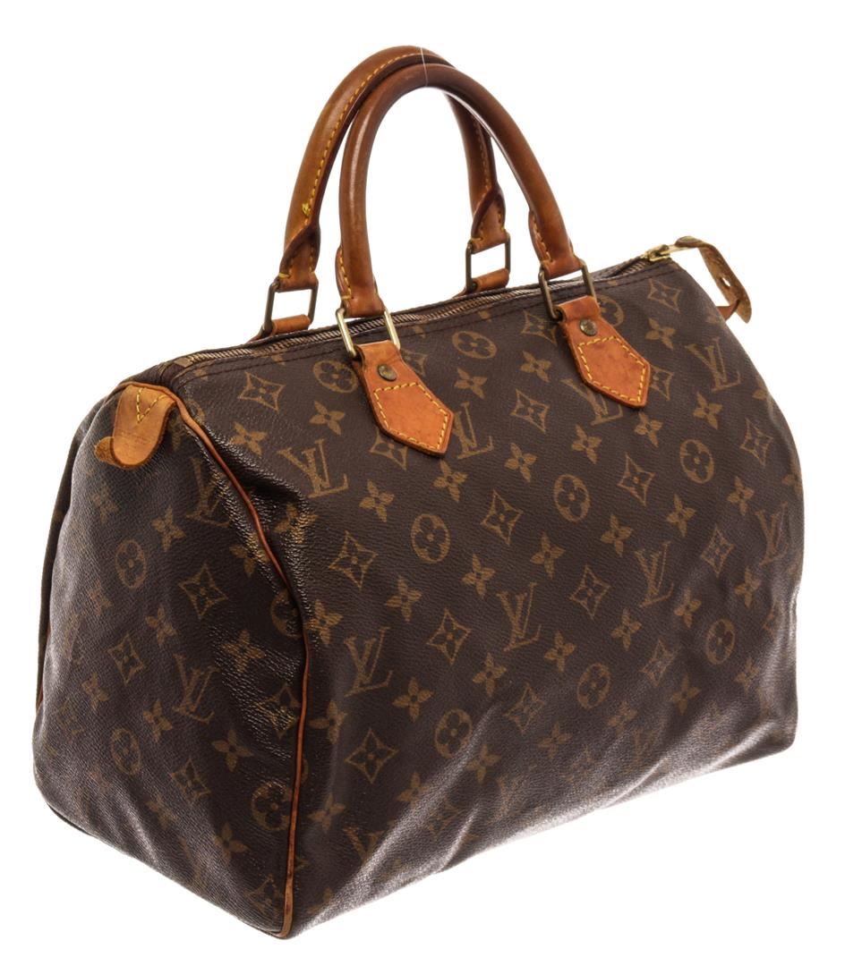 Louis Vuitton Brown Monogram Canvas Speedy 30 Satchel Bag. All available information is listed in the description and shown in the photos. Louis Vuitton Brown Monogram Canvas Speedy 30 Satchel Bag with brass hardware, leather trim, dual rolled handles, canvas lining & single interior pocket, zip closure at top. Height: 10.5" Width: 12" Depth: 6.5", Handle Drop: 3.5" / 26.67 x 30.48 x 16.51 Cm