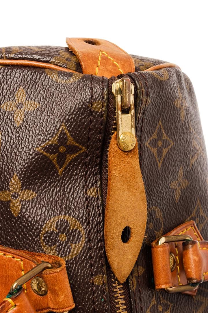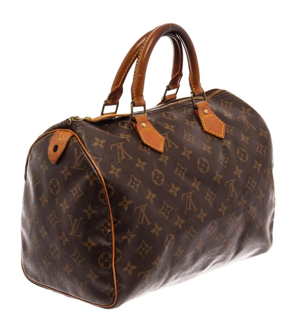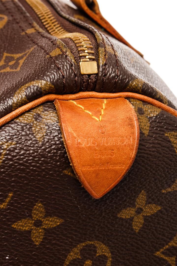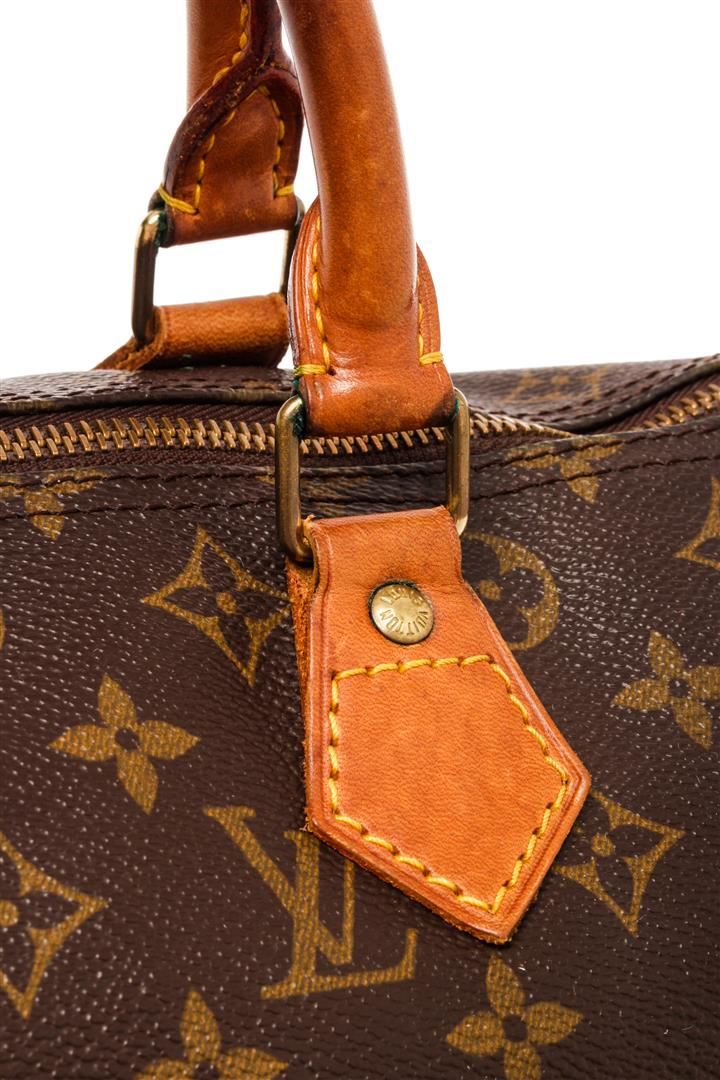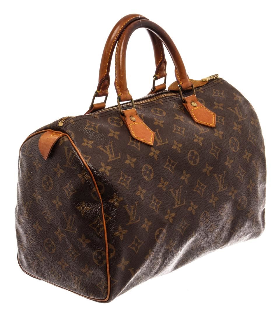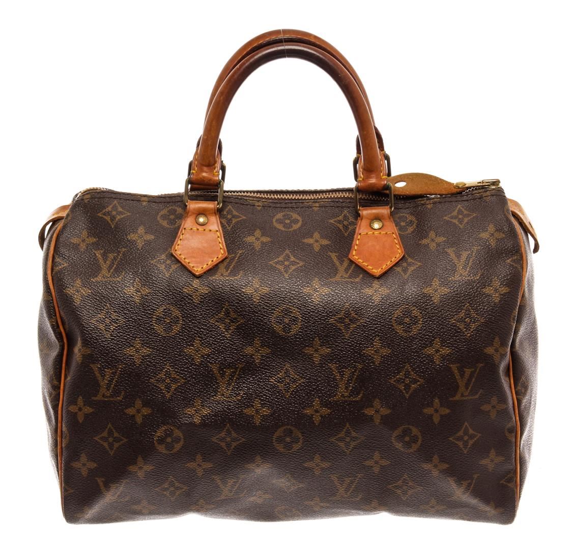 Louis Vuitton Brown Monogram Canvas Speedy 30 Satchel Bag. All available information is listed in the description and shown in the photos. Louis Vuitton Brown Monogram Canvas Speedy 30 Satchel Bag with monogram pattern, brass hardware, leather trim, rolled handles, leather trim embellishment, canvas lining & single interior pocket, zip closure at top. Height: 8.25" Width: 12.75" Depth: 6.75", Handle Drop: 3.5" / 20.95 x 32.38 x 17.14 Cm