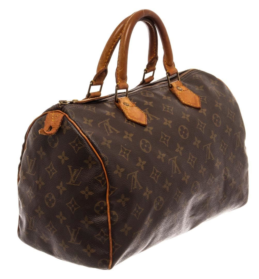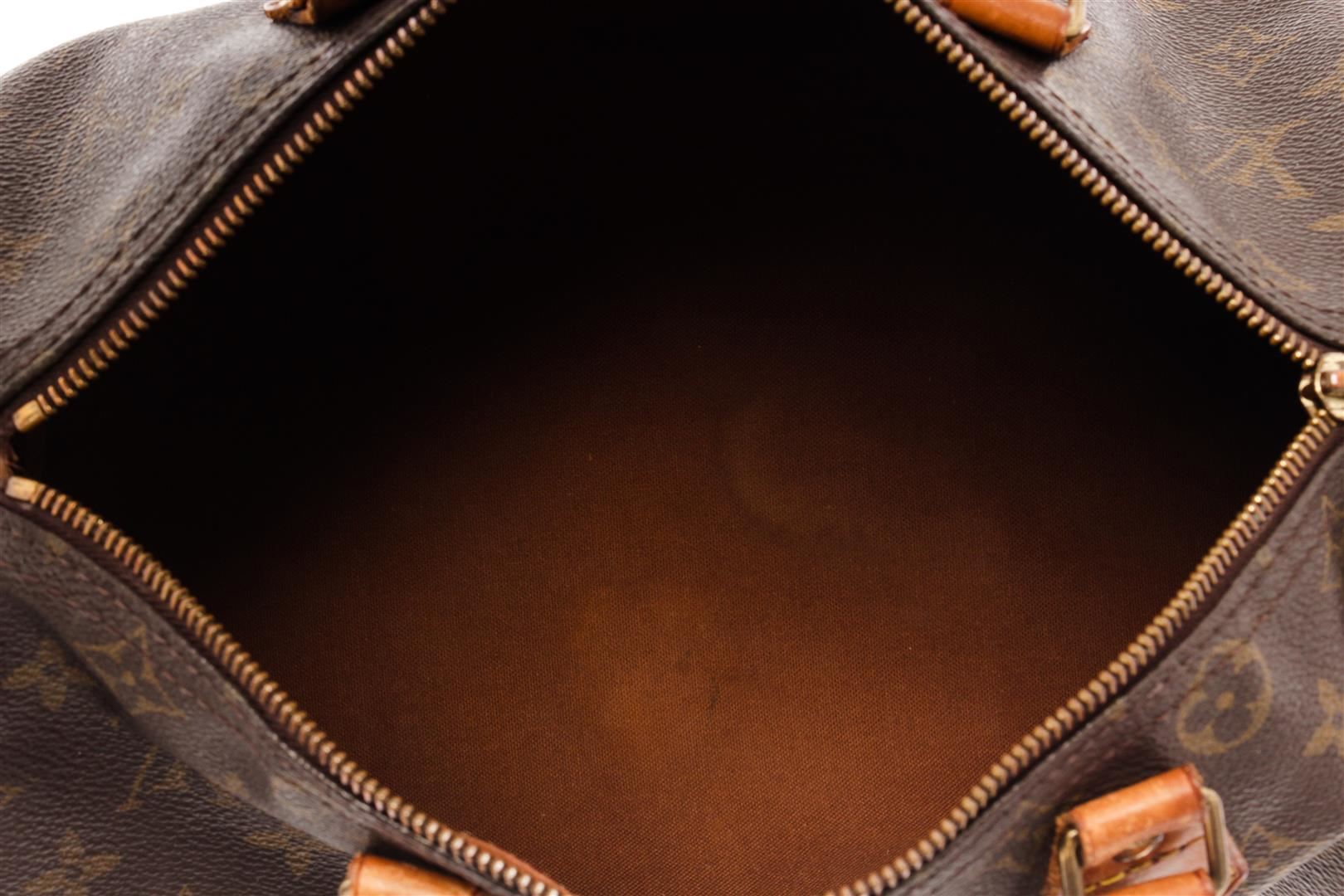 Louis Vuitton Brown Monogram Canvas Speedy 30 Satchel Bag. All available information is listed in the description and shown in the photos. Louis Vuitton Brown Monogram Canvas Speedy 30 Satchel Bag with brass hardware, leather trim, rolled handles & single shoulder strap, leather trim embellishment, canvas lining & single interior pocket, zip closure at top. Height: 9.5" Width: 11.5" Depth: 7", Shoulder Strap Drop: 3" / 24.13 x 29.21 x 17.78 Cm