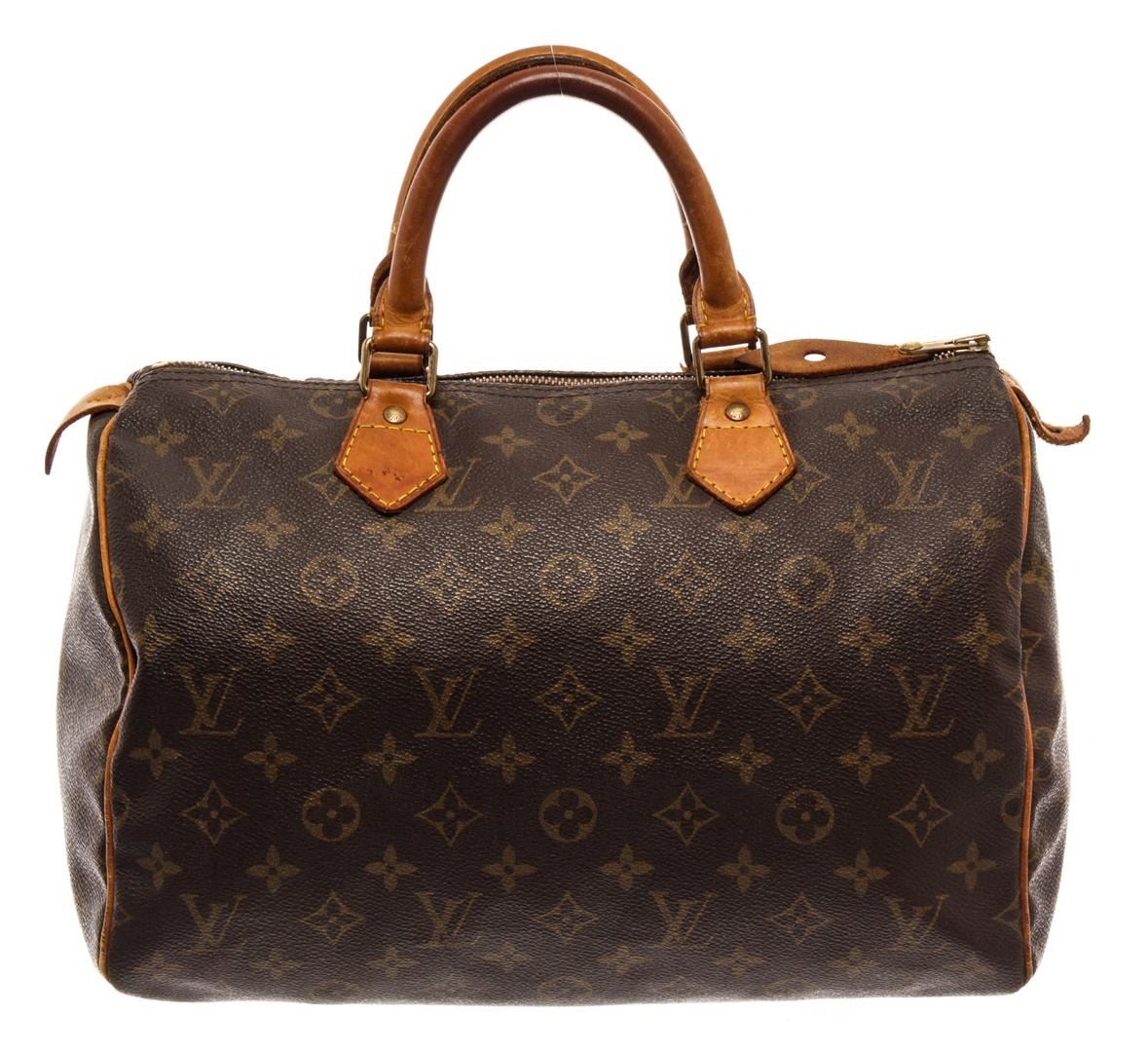 Louis Vuitton Brown Monogram Canvas Speedy 30 Satchel Bag. All available information is listed in the description and shown in the photos. Louis Vuitton Brown Monogram Canvas Speedy 30 Satchel Bag with brass hardware, leather trim, rolled handles & single shoulder strap, leather trim embellishment, canvas lining & single interior pocket, zip closure at top. Height: 9.5" Width: 11.5" Depth: 7", Shoulder Strap Drop: 3" / 24.13 x 29.21 x 17.78 Cm