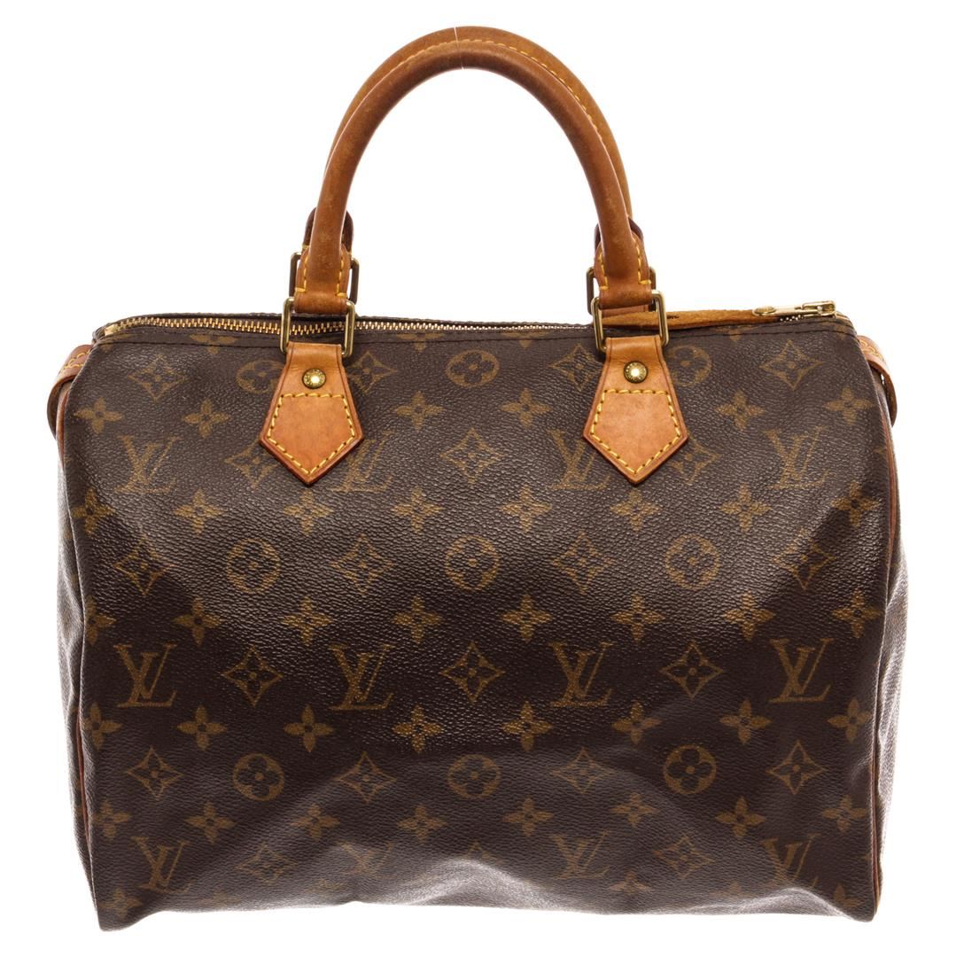 Louis Vuitton Brown Monogram Canvas Speedy 30 Satchel Bag. All available information is listed in the description and shown in the photos. Louis Vuitton Brown Monogram Canvas Speedy 30 Satchel Bag with brass hardware, leather trim, dual rolled handles, leather trim embellishment, canvas lining & single interior pocket, zip closure at top. Height: 10" Width: 12" Depth: 6.5", Handle Drop: 3" / 25.4 x 30.48 x 16.51 Cm
