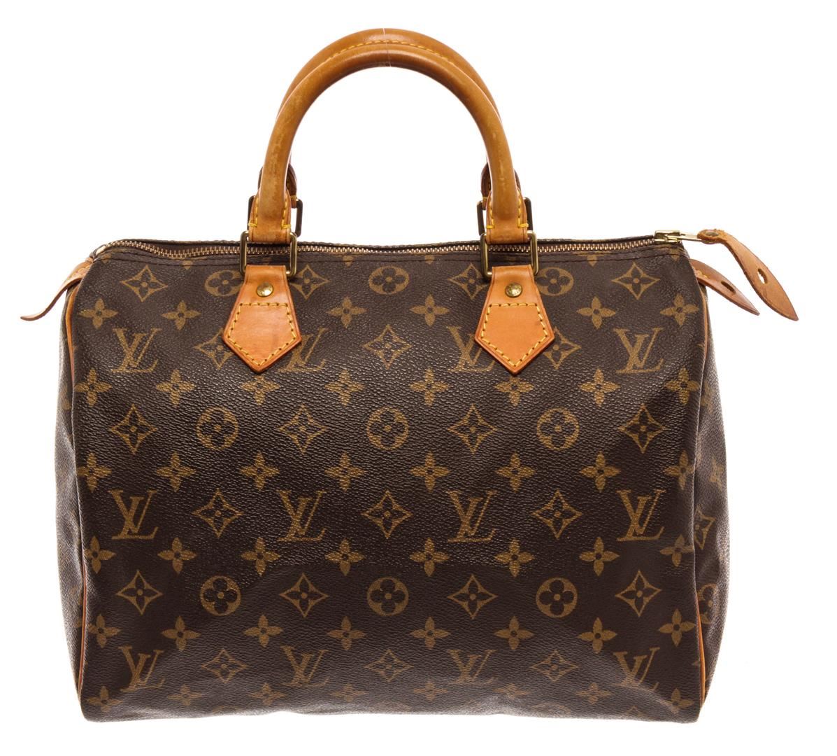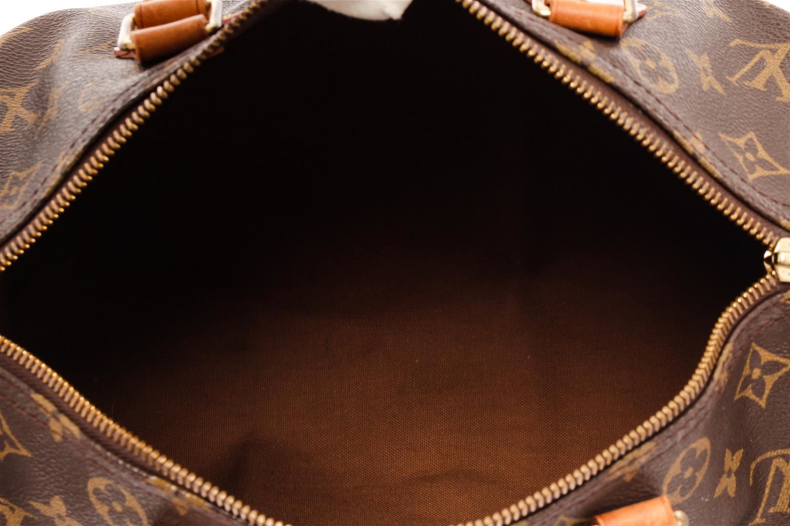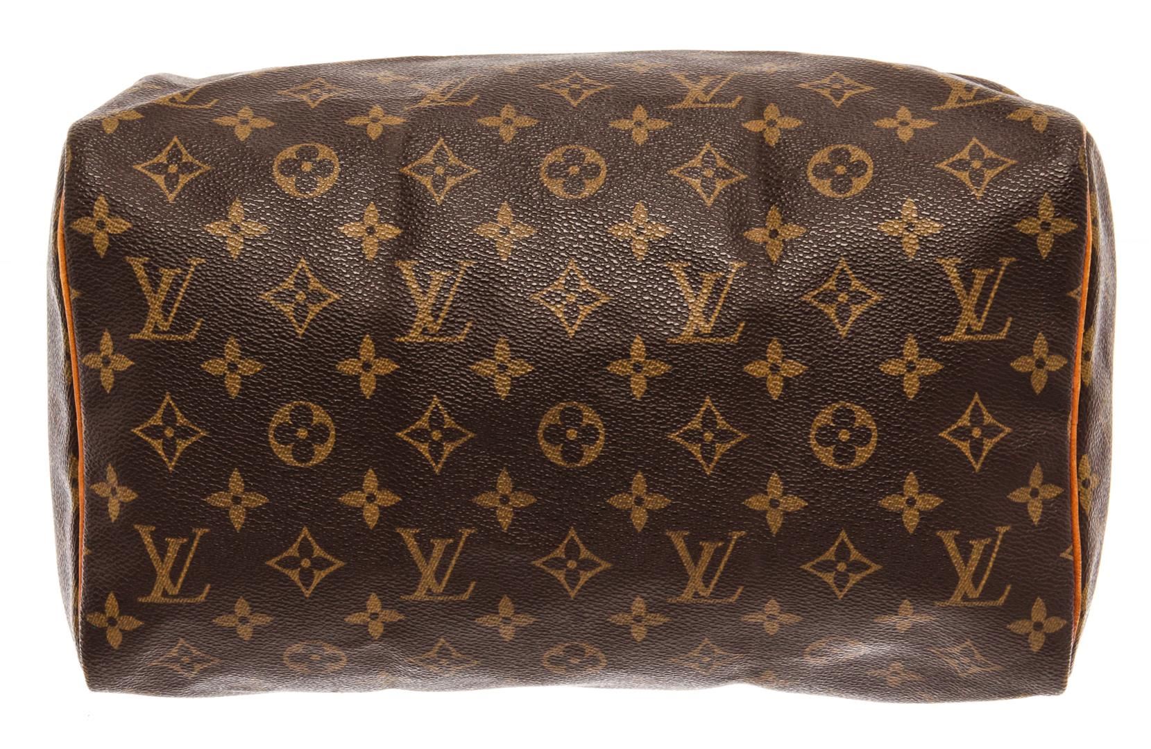 Louis Vuitton Brown Monogram Canvas Speedy 30 Satchel Bag. All available information is listed in the description and shown in the photos. Louis Vuitton Brown Monogram Canvas Speedy 30 Satchel Bag with brass hardware, leather trim, dual rolled handles, leather trim embellishment, canvas lining & single interior pocket, zip closure at top. Height: 8.5" Width: 12" Depth: 7", Handle Drop: 4" / 21.59 x 30.48 x 17.78 Cm