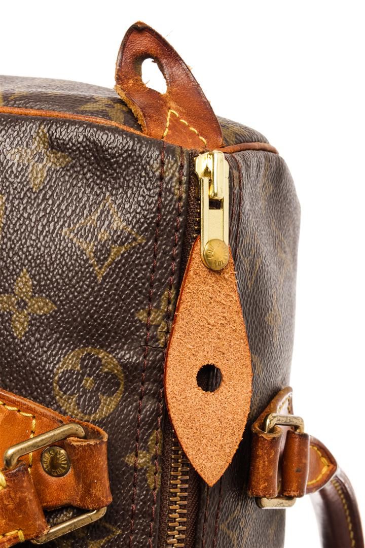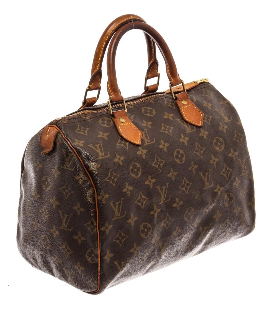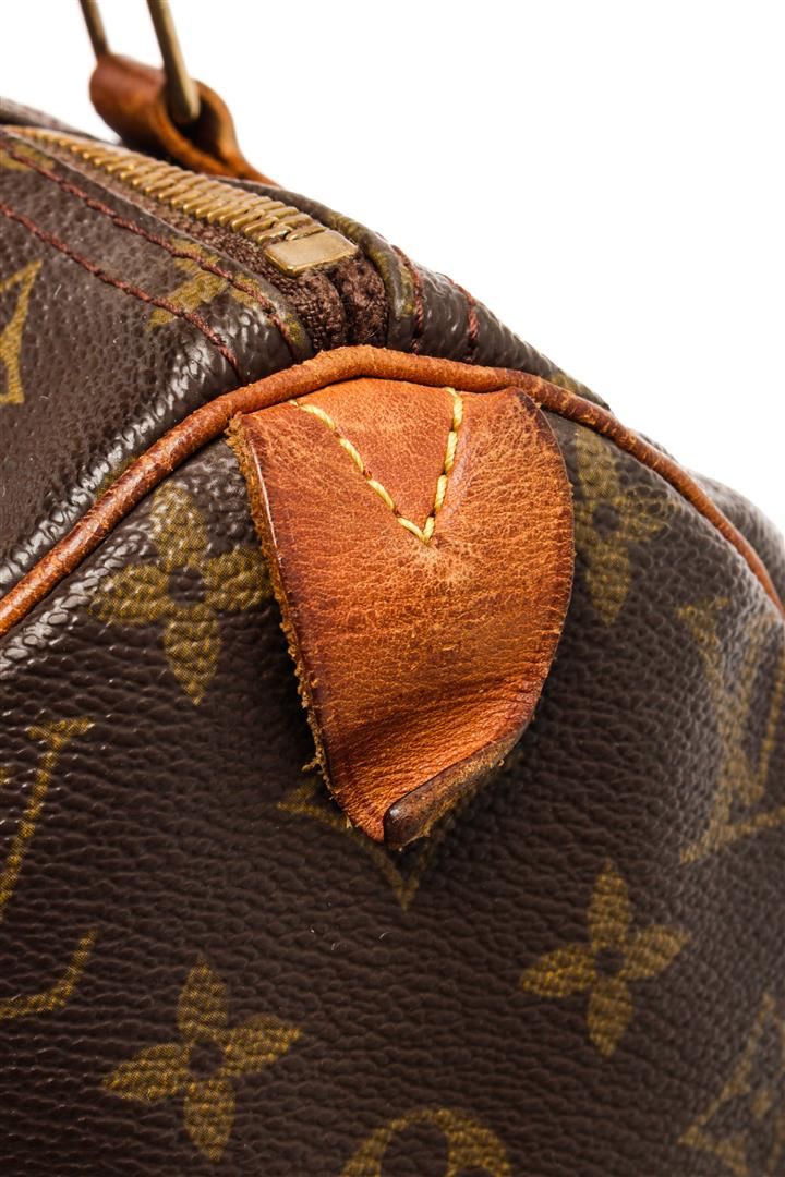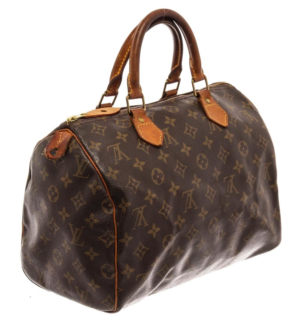 Louis Vuitton Brown Monogram Canvas Speedy 30 Satchel Bag. All available information is listed in the description and shown in the photos. Louis Vuitton Brown Monogram Canvas Speedy 30 Satchel Bag with brass hardware, leather trim, dual rolled handles, canvas lining & single interior pocket, zip closure at top. Height: 10.5" Width: 12" Depth: 6.5", Handle Drop: 3.5" / 26.67 x 30.48 x 16.51 Cm
